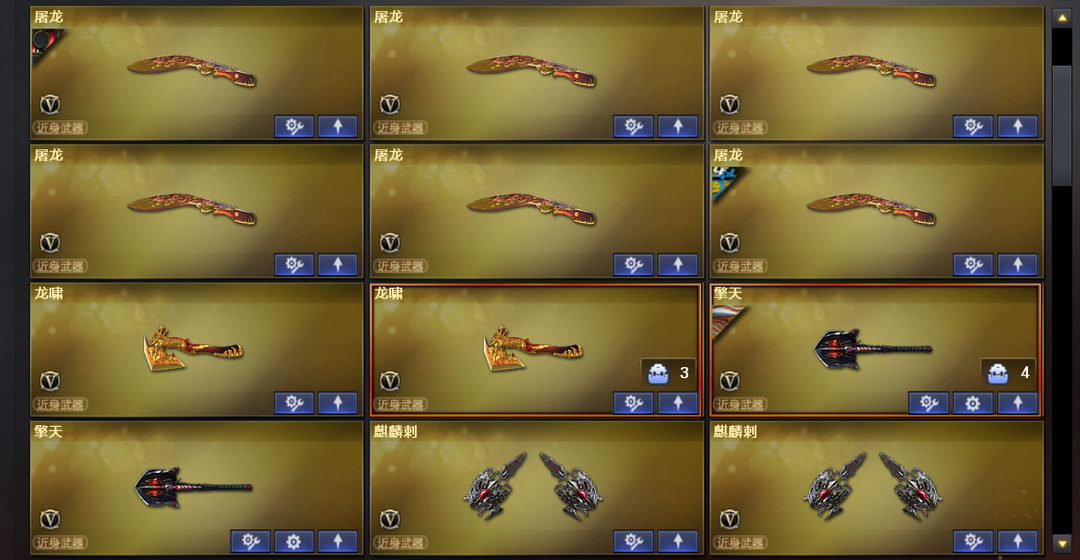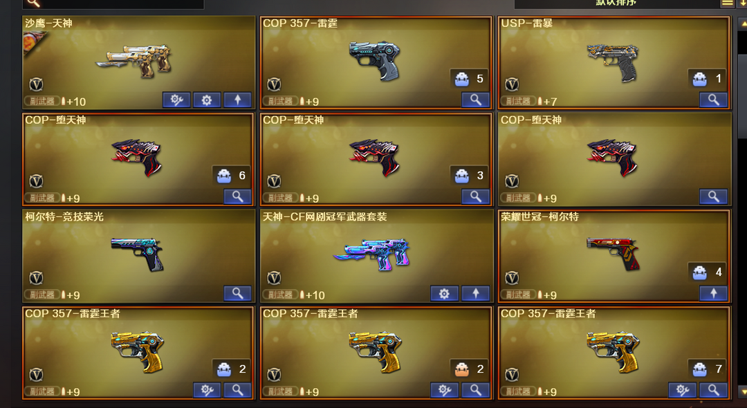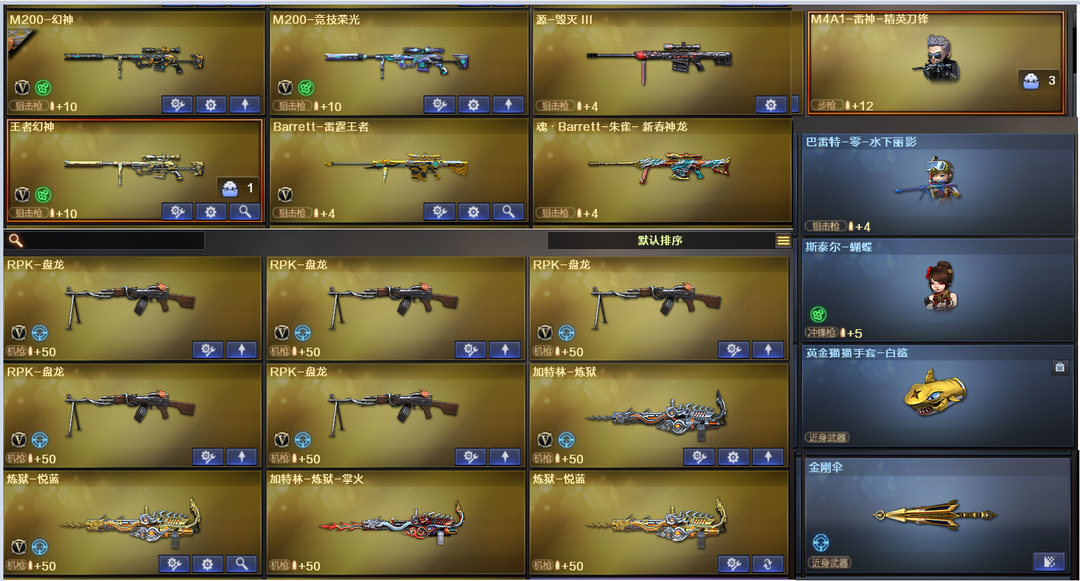 王者武器:王者之锋-觉醒版;王者之武-觉醒版;王者炎心-觉醒版;炼狱-悦蓝-觉醒版;COP 357-雷霆王者-觉醒版;高爆手雷-雷霆王者;雷霆王者之锋-觉醒版;M4A1-雷霆王者-觉醒版;Barrett-雷霆王者-觉醒版;烟雾弹-雷霆王者-觉醒版;闪光弹-雷霆王者-觉醒版;高爆手雷-雷霆王者;王者幻神-觉醒版;炫金毁灭;王者之心-觉醒版;王者之锋;炫金骑士;王者之魂;王者之啸-觉醒版;王者之魄-觉醒版;炫金雷神;王者之武;炼狱-悦蓝;王者之怒;王者之戮 英雄武器:机械迷城-穹宇;高爆手雷-竞技荣光;烟雾弹-竞技荣光;闪光弹-竞技荣光;雷霆之契;M200-竞技荣光;柯尔特-竞技荣光;擎天-竞技荣光;荣耀世冠-龙啸;荣耀世冠-柯尔特;RPK-盘龙;HK417-朱雀;QBZ03-金色蔷薇;Scar Light-白虎;黑骑士-海王;AK47-雷暴;USP-雷暴;斩神刀-雷暴;汤姆逊-烈龙;沙鹰-修罗;麒麟刺;AWM-裁决;天神-CF网剧冠军;黑武士-CF网剧冠军;擎天-CF网剧冠军;M4A1-黑骑士;加特林-炼狱;M4A1-千变;AK12-天启;AWM-天龙;沙鹰-天神;M4A1-龙血;AK4