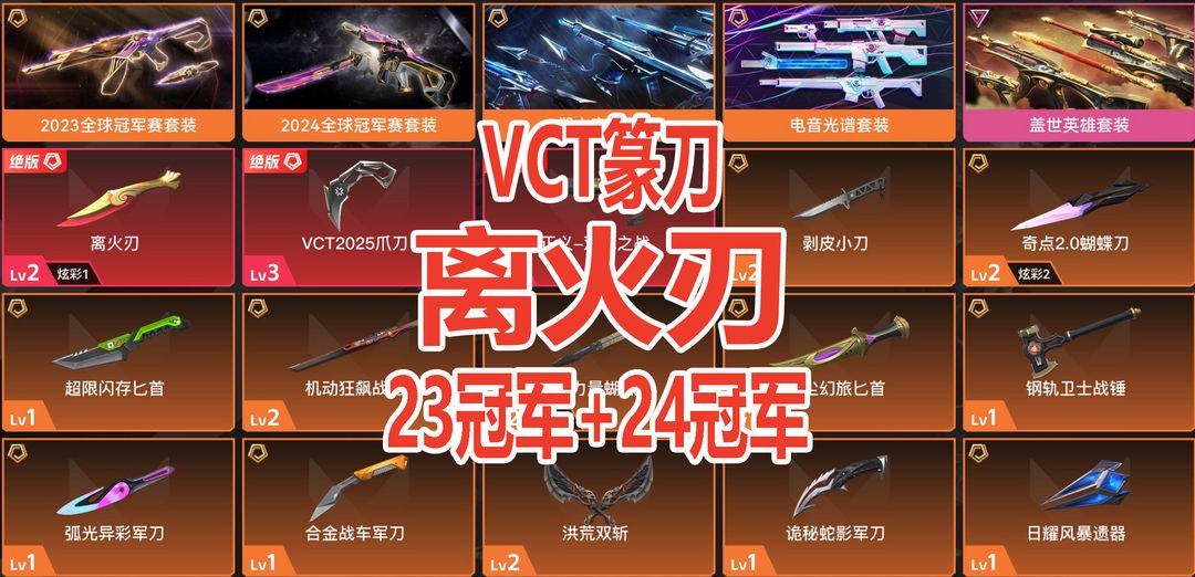 可排位✅顶级10W库存✅离火刃⭐23冠军套⭐24冠军套⭐双城之战套⭐VCT爪刀⭐电音光谱套⭐奇点套⭐