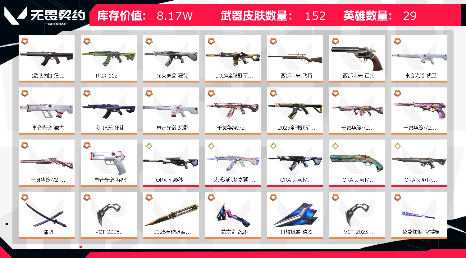 首页 > 租号大厅 > 无畏契约-wegame > wegame/wegame > ❤ 全升级 禁 开挂 怜悯套 莲花套⚡ORA套⚡️25套⚡️24套⚡️VCT⚡️光谱套⚡️神罚套