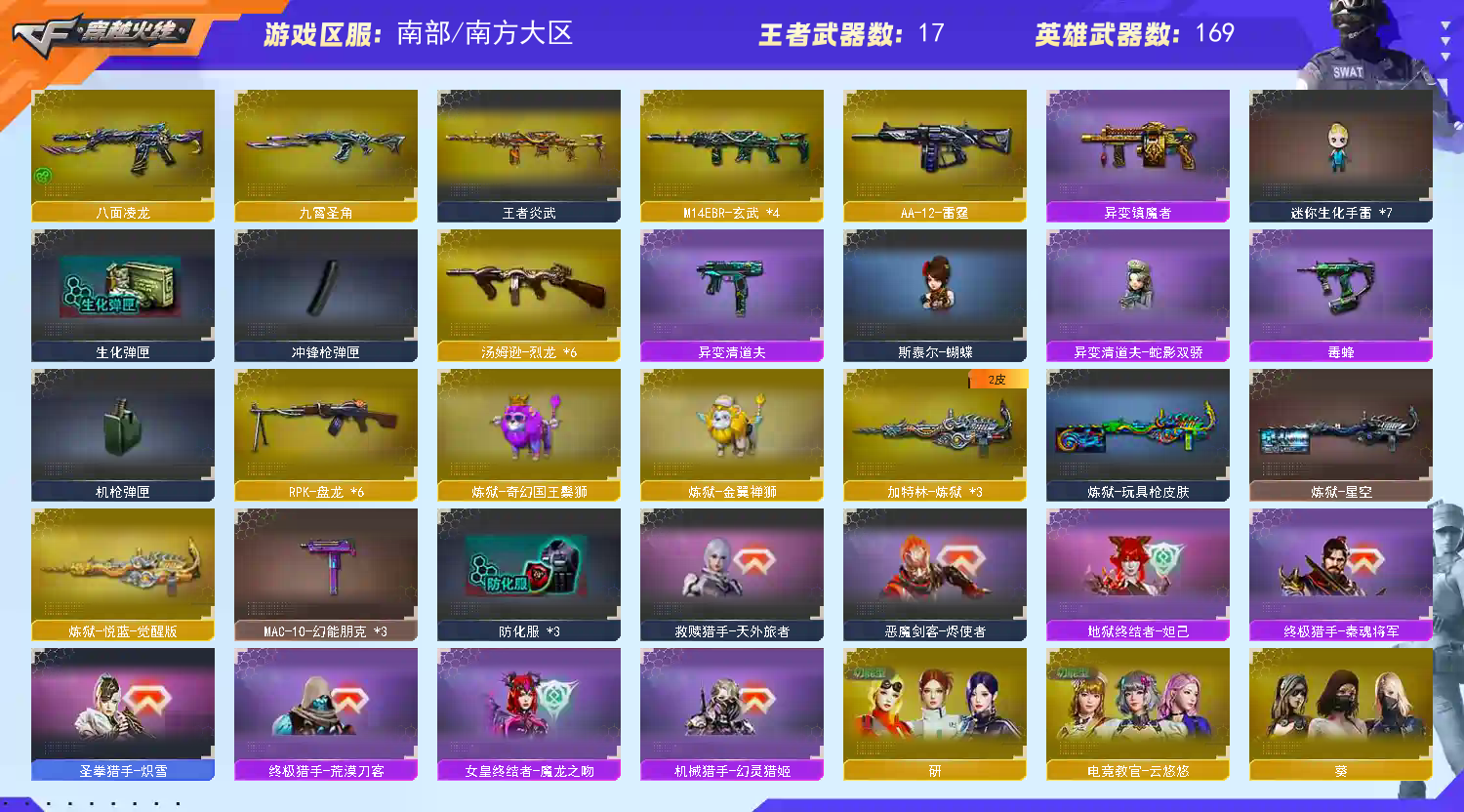 猎手全皮|终结者全皮|全幽灵;USP-雷暴,USP-雷暴王者,炽芒蝶刃,隼,电竞教官-云悠悠,RPK-盘龙,QBZ03-金色蔷薇,