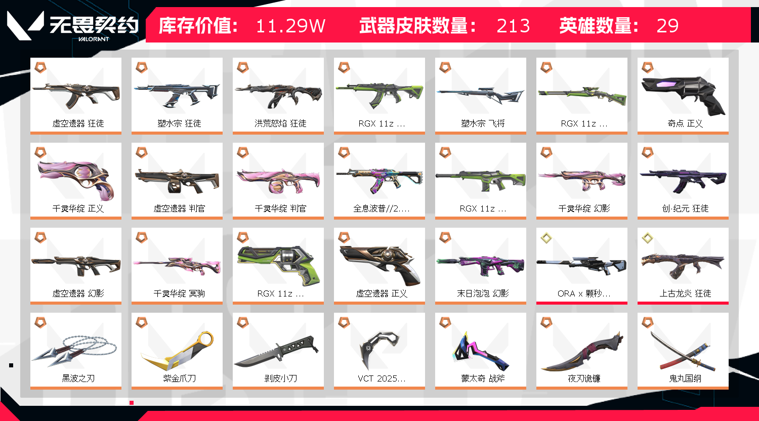 首页 > 租号大厅 > 无畏契约-wegame > wegame/wegame > 冻结秒解⚡12w库三棱军刺怜悯⚡VCT爪光荣刀黑波显卡爪剥皮紫金爪AK赤焰塑水流脓盖亚鬼丸套侦察异鳞