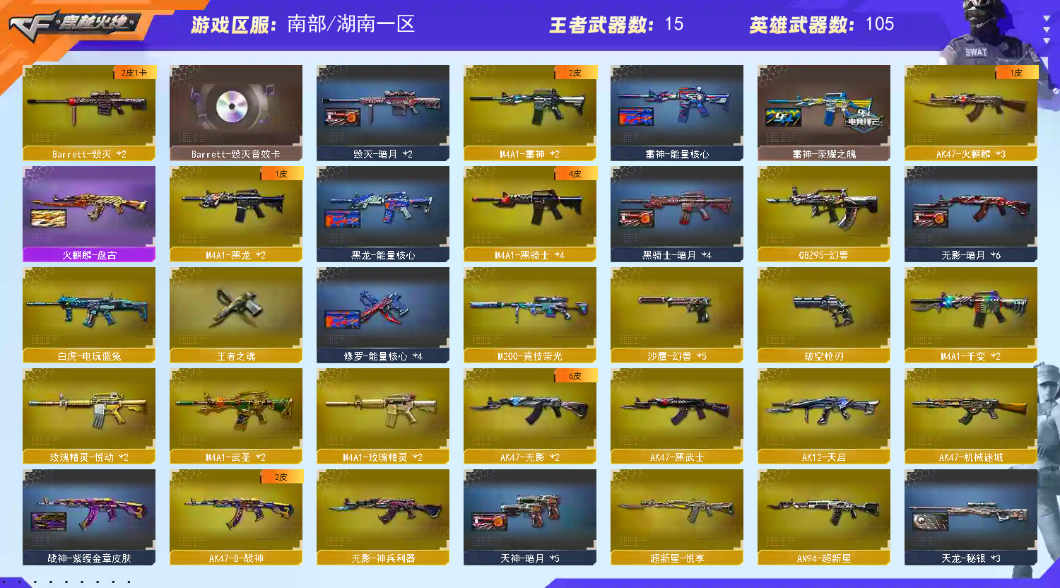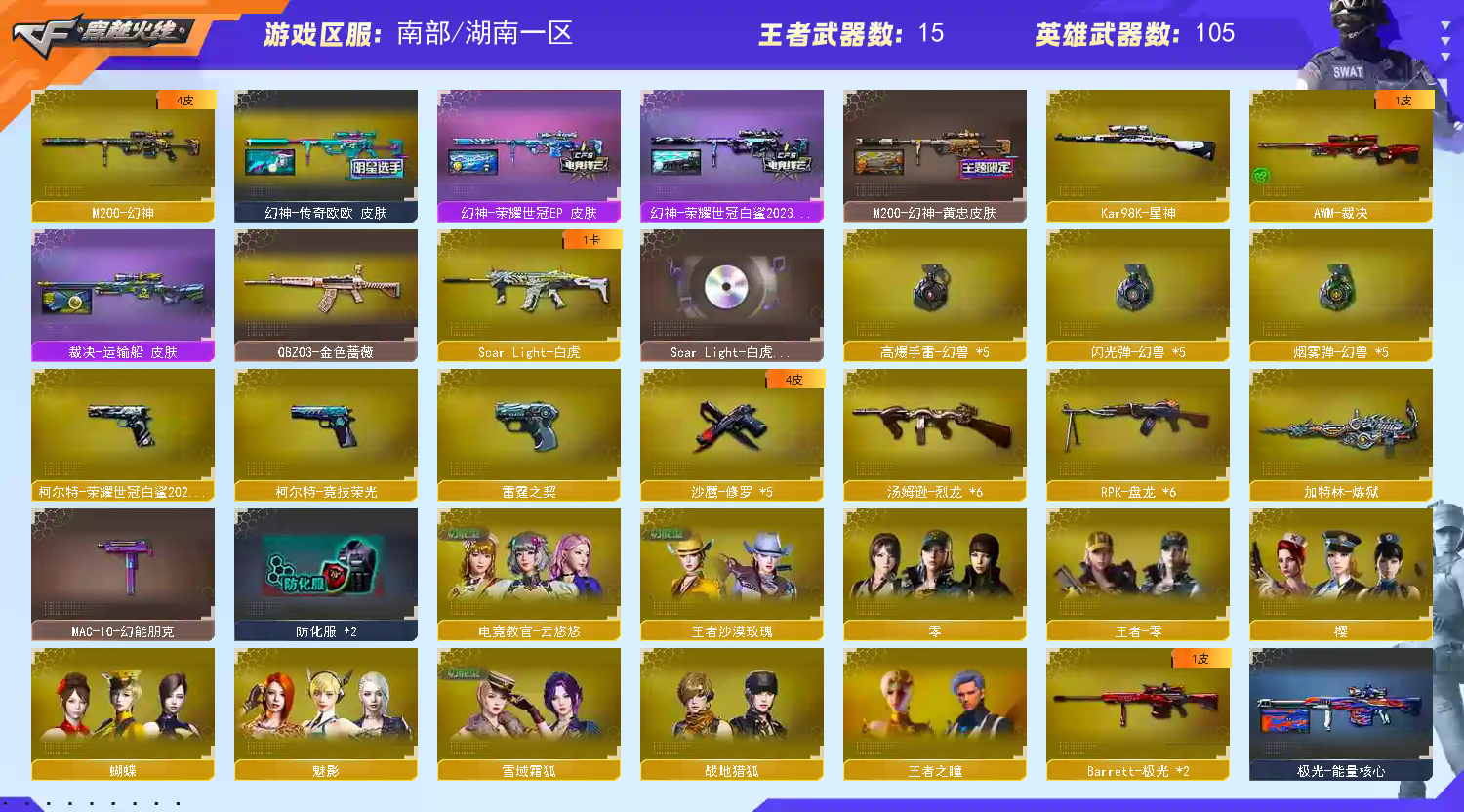 [太阳]南部-湖南一区 [太阳]【幻神EP+新白鲨+传奇欧欧+黄忠】 [太阳]【绝版5套幻兽+白鲨柯尔特+COP雷霆】 幻神 星神 白虎音效卡 QBZ 裁决 都齐 【6盘龙6烈龙+5炼狱】;柯尔特-荣耀世冠白鲨2023,电竞教官-云悠悠,王者沙漠玫瑰,RPK-盘龙,QBZ03-金色蔷薇,M200-幻神,Scar Light-白虎,