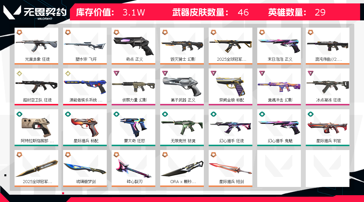 冻结三分钟内解除,短信通知重新上即可!喜欢收藏不迷路、游戏异常进小黑屋、时间不够请提前续租或者不要开局 【3w库存25冠军套.颗秒小刀.超时空.光荣异象.冰点.毁灭骑士.侦查.混沌2.0】ASYy109 【套装】:2025全球冠军赛套装 【英雄】:幻棱,炼狱,维斯,暮蝶,钛狐,壹决,铁臂,捷风,雷兹,幽影,不死鸟,贤者,猎枭,蝰蛇,零,芮娜,奇乐,尚勃勒,霓虹,斯凯,夜露,星礈,K/O,盖可,黑梦,钢锁 【近战武器】:近战武器-2025全球冠军赛 蝴蝶刀,近战武器-ORA x 颗秒 军刀,近战武器-琉璃锻梦剑,近战武器-星际猎兵 短剑 【狂徒】:狂徒-超时空卫队,狂徒-2025全球冠军赛,狂徒-光荣异象,狂徒-冰点凝冻,狂徒-合金突袭 【幻影】:幻影-毁灭骑士,幻影-混沌序曲//2.0,幻影-灵魂冲击,幻影-侦察力量 【飞将】:飞将-塑水宗 【骇灵】:骇灵-无限竞技 【标配】:标配-紫阙金琅 【正义】:正义-奇点,正义-末日泡泡,正义-离子武器 【鬼魅】:鬼魅-源能者娱乐系统 【卡面】:南瓜盛典 卡面,树懒大作战 卡面,红鳞松叶 卡面,Clutch 卡面,无畏契约GO!一卷:芮娜 卡面,无畏契约GO!一卷:零 卡面,暗枪 卡面,钢锁vs盖可 卡面,代号红色 卡面,新兵报到 卡面,V契约 卡面,无畏契约 卡面 【喷漆】:小丑猫 喷漆,高丽风情小蛙 喷漆,买装还是存钱 喷漆,无畏契约GO!一卷:芮娜 喷漆,红鳞 喷漆,无畏契约GO!第卷:贤者 喷漆,胜利属于无畏契约 喷漆,GLHF 喷漆,无畏契约 喷漆 【挂饰】:第九季//第三幕 纪念币 挂饰,无畏契约GO!一卷 芮娜 挂饰,天外飞客 挂饰,《双城之战》魄罗 挂饰,无畏契约 纪念币 挂饰;侦察力量 幻影,光荣异象 狂徒,塑水宗 飞将,奇点 正义,离子武器 正义,紫阙金琅 标配,