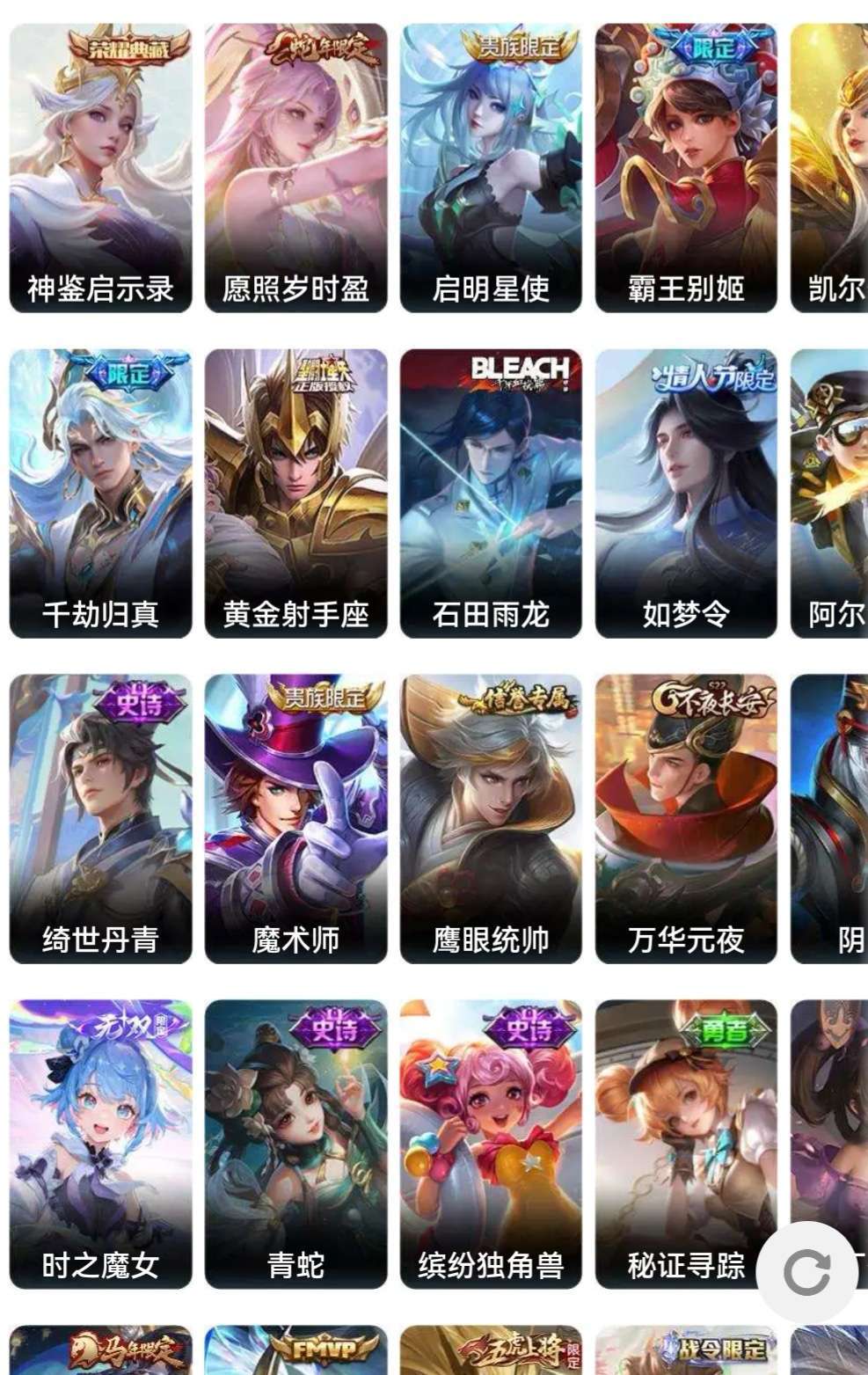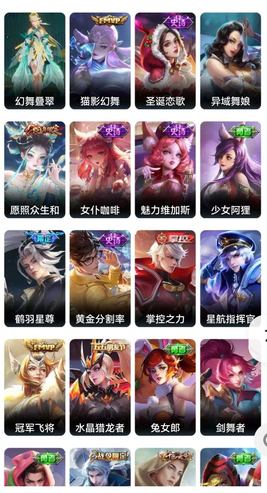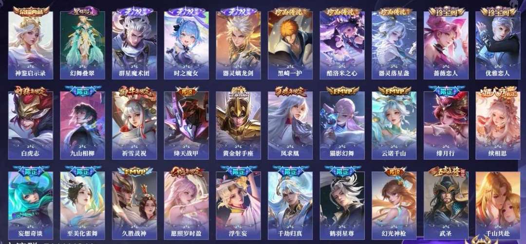 v10、537皮6水4无双、安琪拉-颠倒童话·魔镜、朵莉亚-神骥、遇见神鼓、齐天大圣、白虎志、韩信荣耀典藏、73传说、时之魔女、瑶无双、青丘、九尾、神器明辉仪