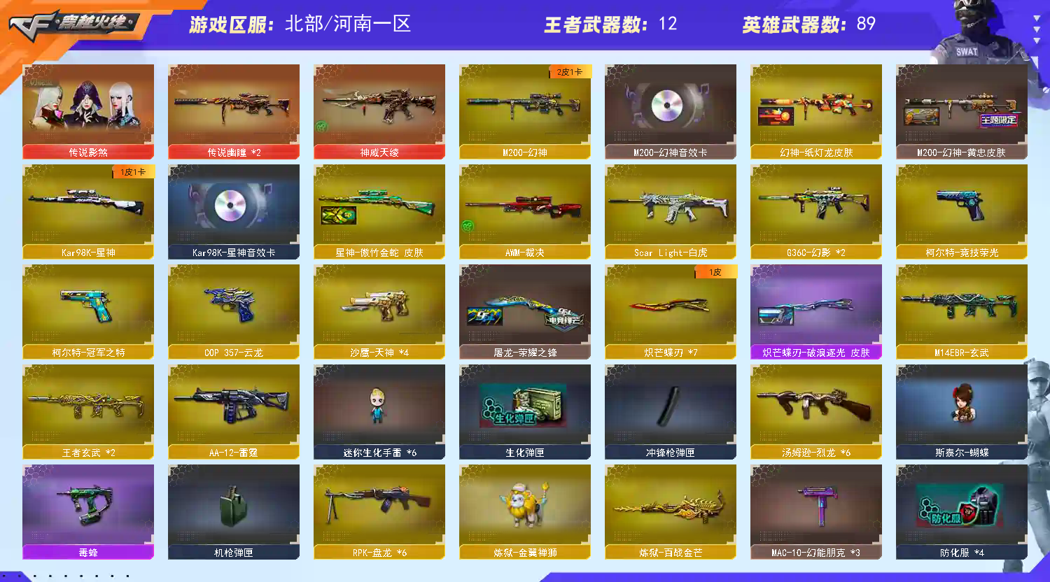 传说影煞⭐传说幽瞳*2⭐神威天绫⭐幻神星神三件套⭐蝴蝶刀*7(1皮)玄武*3⭐金狮子⭐6盘6烈