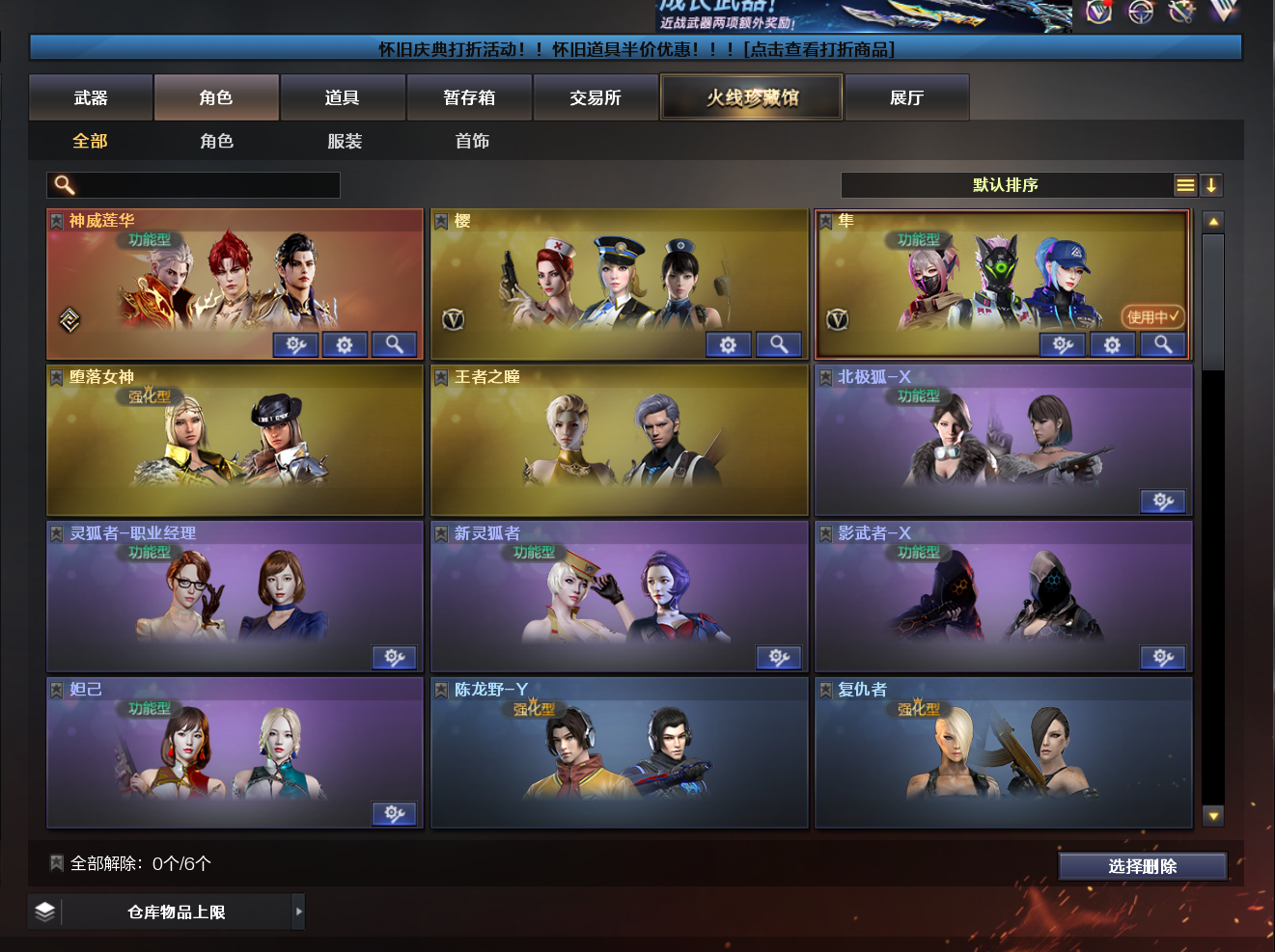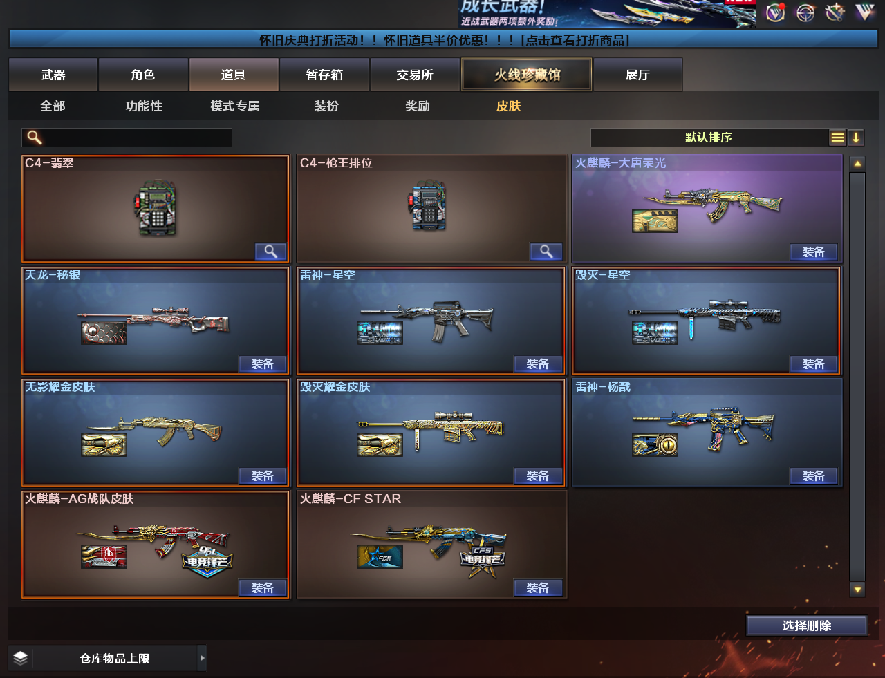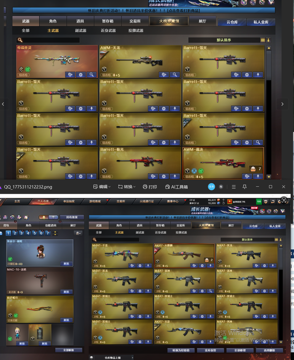 角色神威莲华,隼,双蝴蝶,双蝴蝶刀,炼狱狮子G36c幻影,幻神。;炽芒蝶刃,隼,RPK-盘龙,QBZ03-金色蔷薇,G36C-幻影,Scar Light-白虎,
