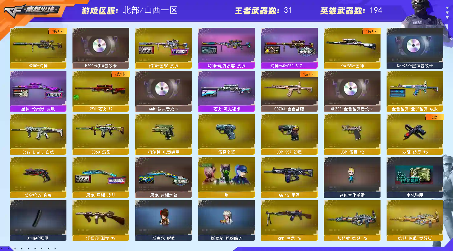 幻神老AG带卡♥星神枪娘带卡♥裁决流光三件套♥白虎qbz幻影♥银翼5把高质量手枪♥隼六盘六炼狱蝴蝶;USP-雷暴,隼,RPK-盘龙,QBZ03-金色蔷薇,G36C-幻影,M200-幻神,Scar Light-白虎,