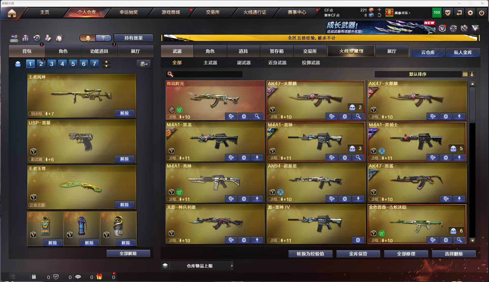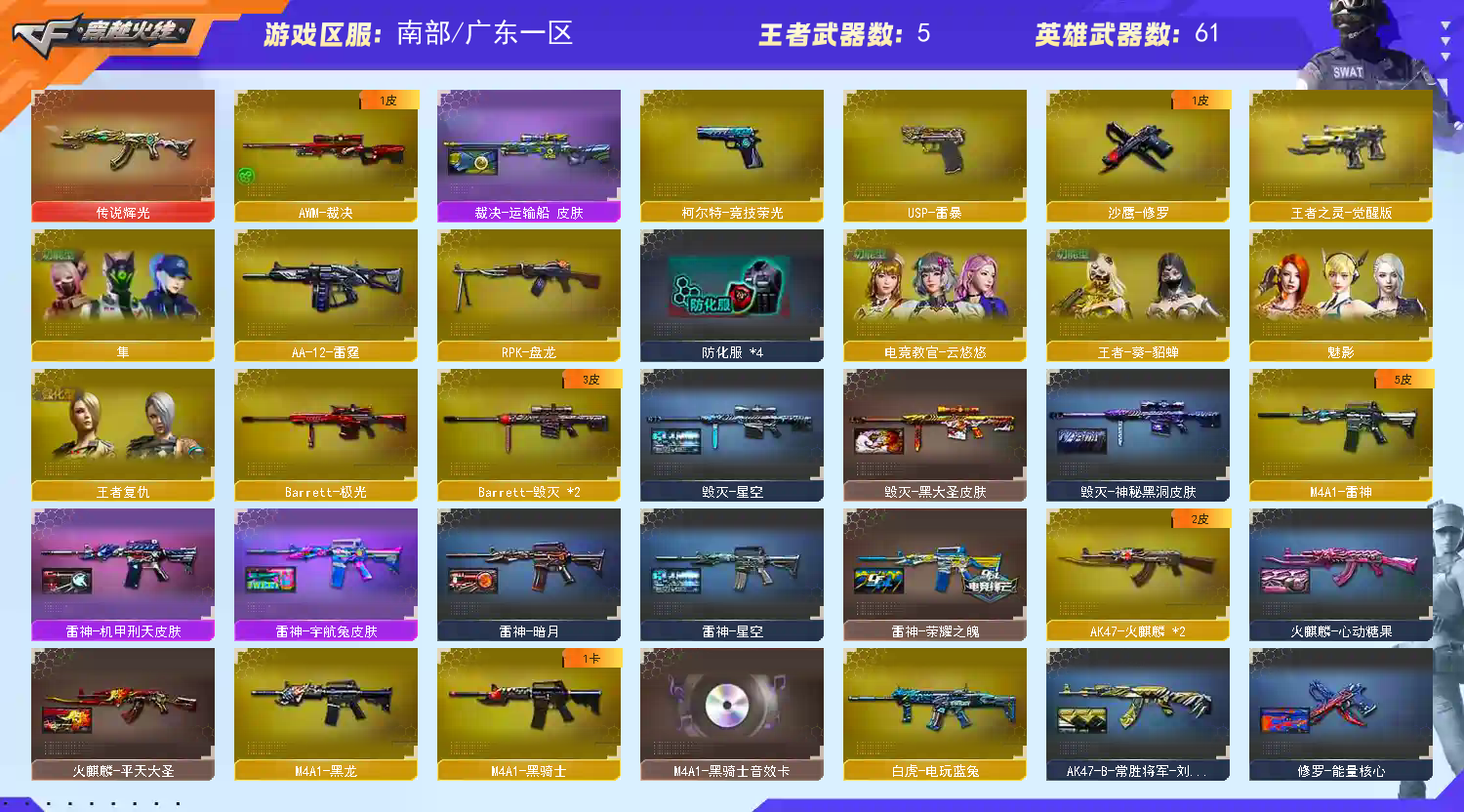 基本啥都有,爆破号,🈲开挂;USP-雷暴,隼,电竞教官-云悠悠,RPK-盘龙,
