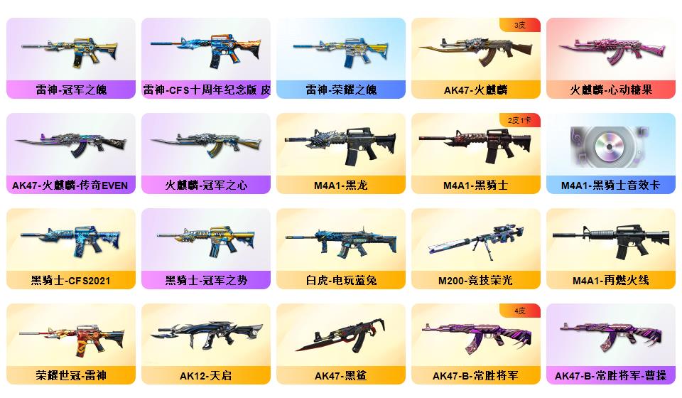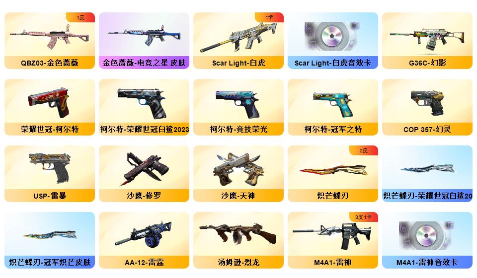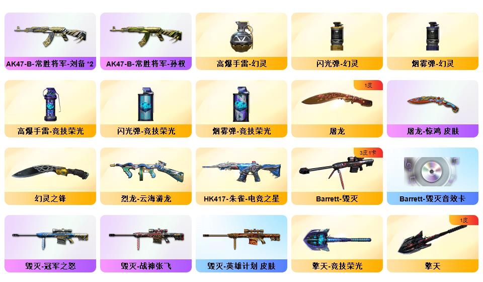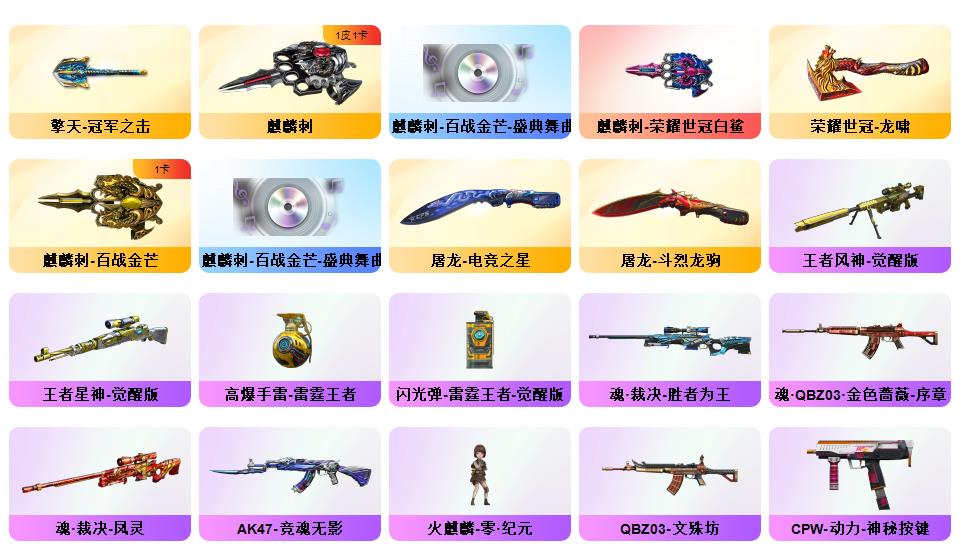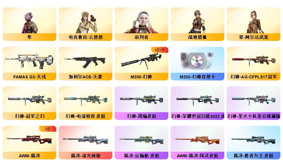【幻神6皮/荣耀世冠白鲨/电流骇客/星火小队签名臻藏版/周瑜/AG-CFPLS17冠军/冠军之幻】【隼】裁决-流光秘银/AWM-裁决-凤灵/炽芒蝶刃-荣耀世冠白鲨2023/炽芒蝶刃-冠军炽芒/屠龙-惊鸿/龙啸-青青莓果/擎天-冠军之击/麒麟刺-荣耀世冠白鲨/金色蔷薇-电竞之星/裁决-胜者为王/毁灭-英雄计划/裁决-运输船皮肤;M200-竞技荣光/M200-幻神/Barrett-毁灭*2/AWM-裁决/G36C-幻影/白虎-电玩蓝兔/ScarLight-白虎/