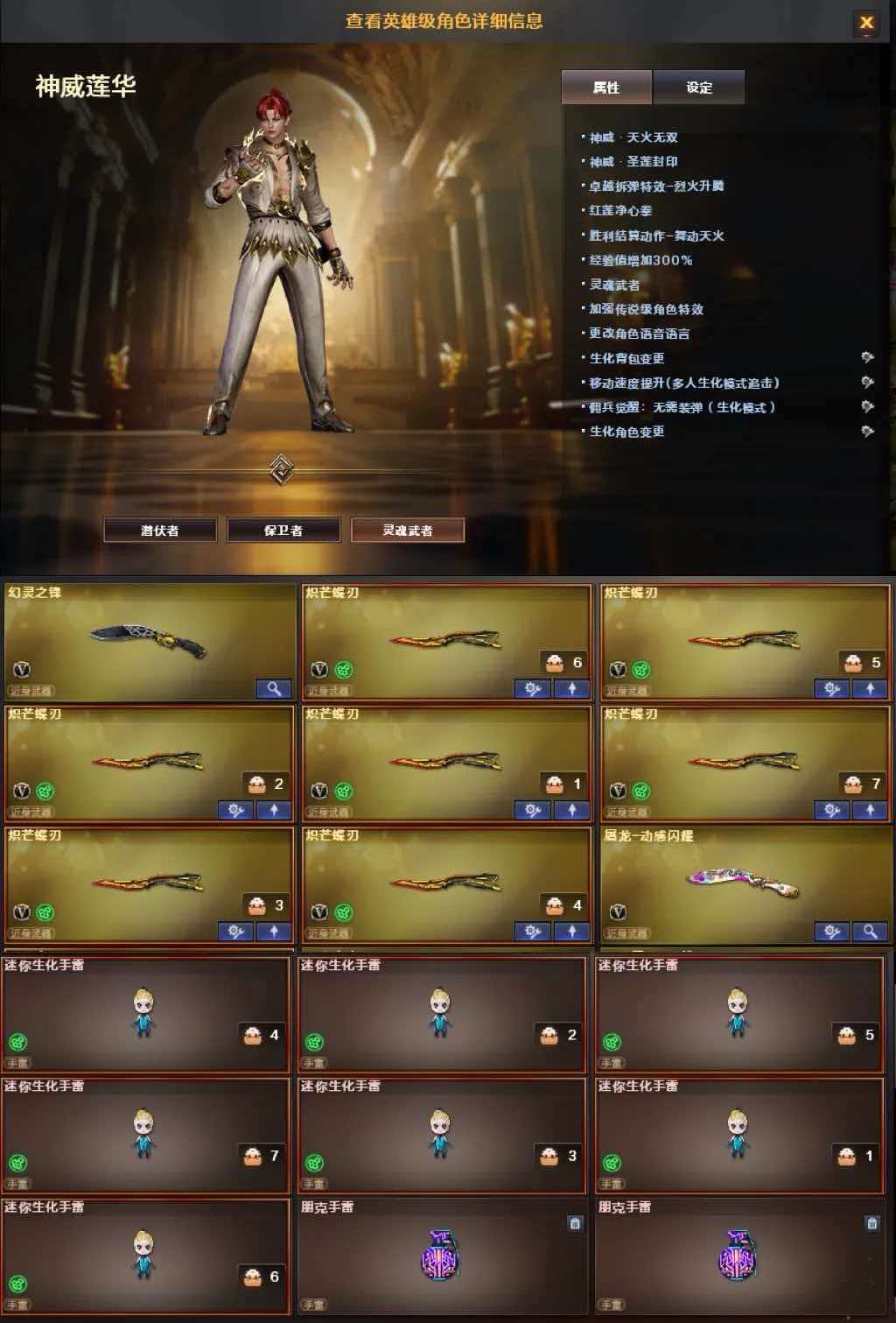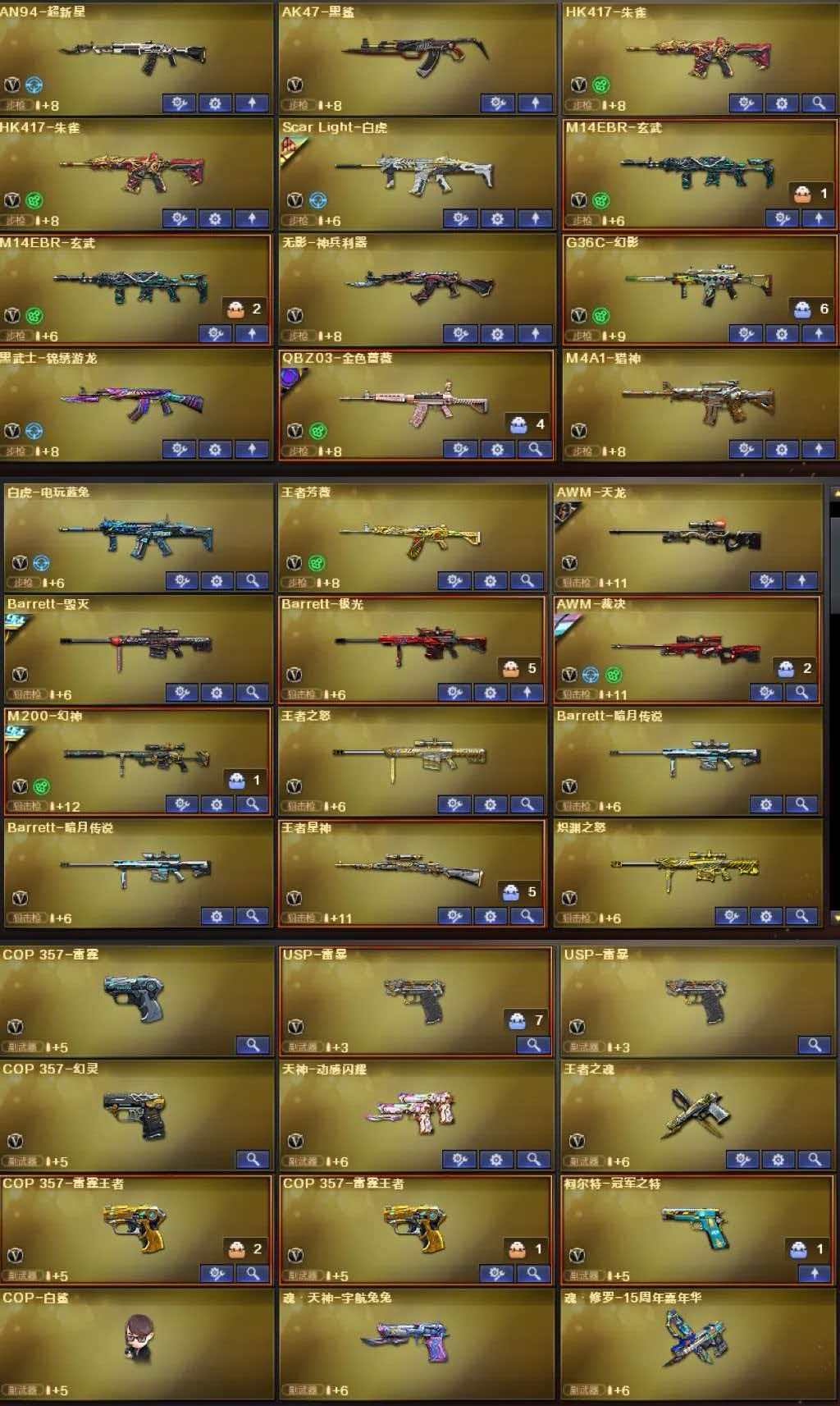 极品生化号✨神威莲华⑦炽芒蝶刃④玄武酷酷小狮②蝴蝶六盘六烈✨裁决套毁灭套⑦娃娃雷满弹夹;USP-雷暴,柯尔特-冠军之特,炽芒蝶刃,Knife-冠军之刃,RPK-盘龙,QBZ03-金色蔷薇,G36C-幻影,