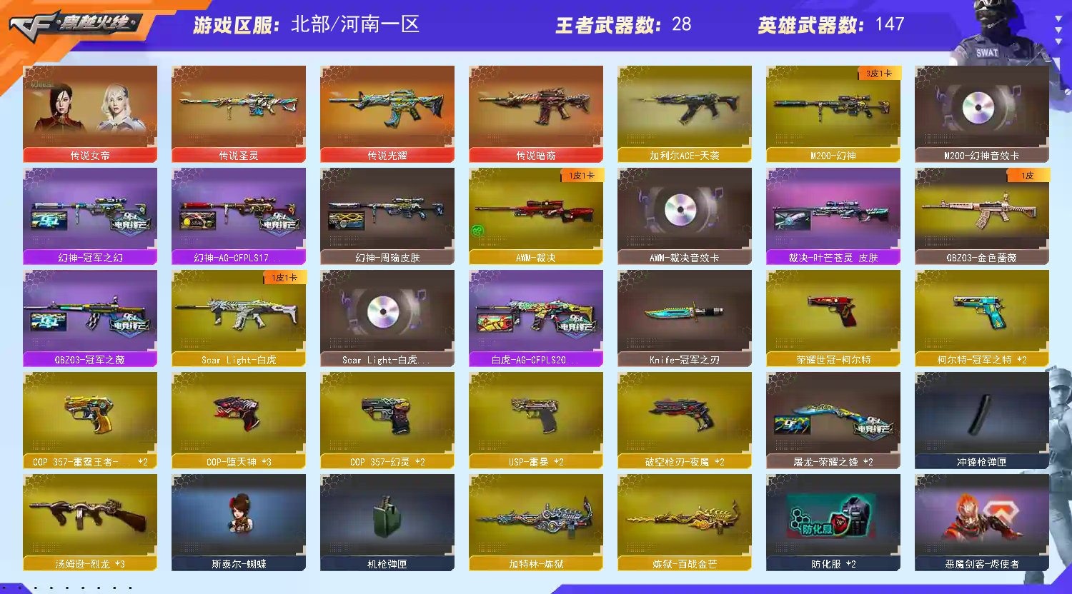北部,传说女帝,传说光耀序列版,传说暗裔,传说圣灵,幻神裁决白虎毁灭火麒麟三件套,王者幻神,顶配手枪