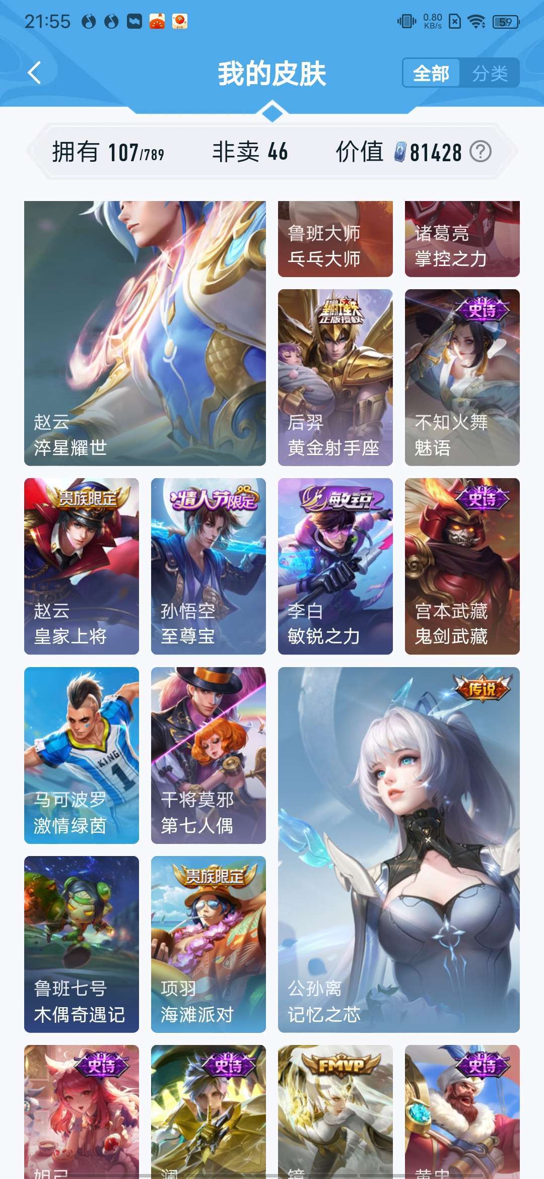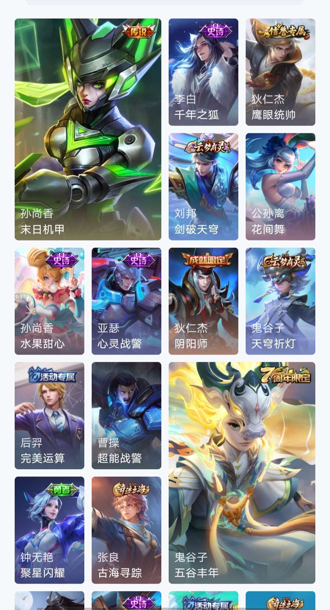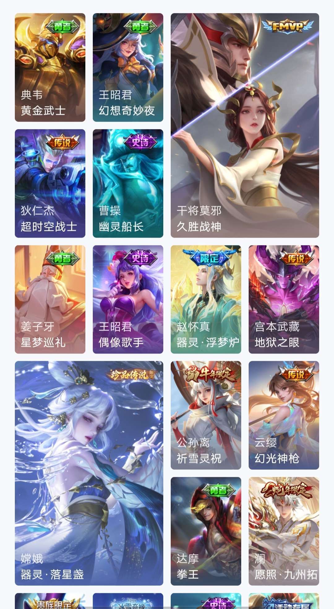 v10、537皮6水4无双、安琪拉-颠倒童话·魔镜、朵莉亚-神骥、遇见神鼓、齐天大圣、白虎志、韩信荣耀典藏、73传说、时之魔女、瑶无双、青丘、九尾、神器明辉仪