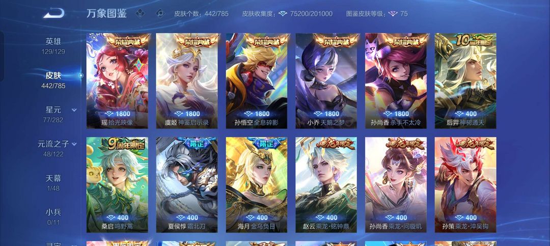 贵10,130英雄,442皮肤,5典藏,42传说,5灵宝,欢迎经常来玩