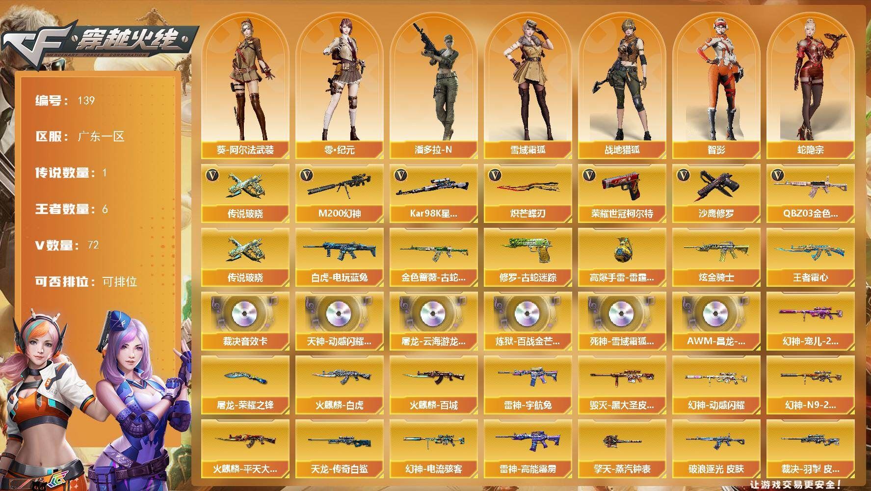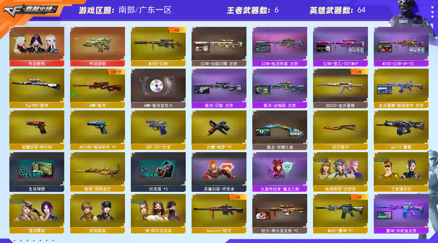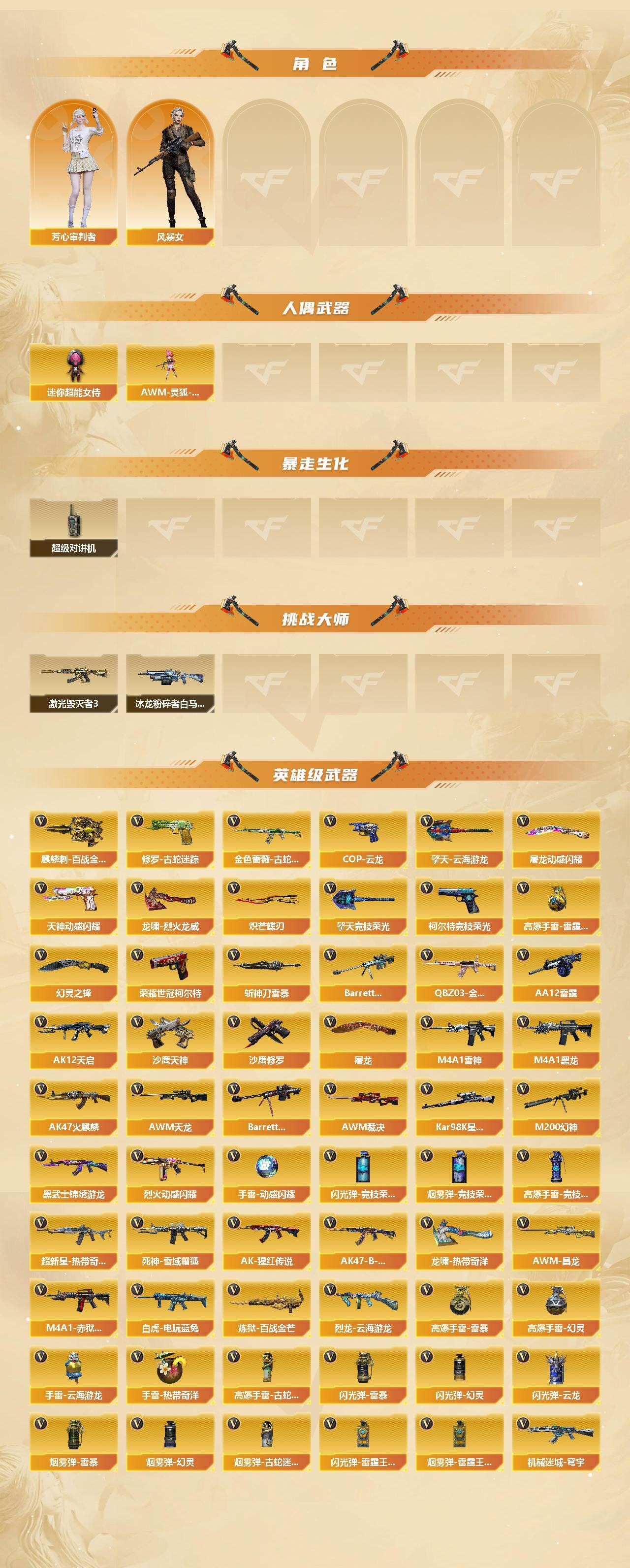 【传说武器】:传说破晓【传说角色】:4防传说影煞【热门武器】:传说破晓,QBZ03-金色蔷薇,M200-幻神,金色蔷薇-古蛇迷踪,修罗-古蛇迷踪,白虎-电玩蓝兔,荣耀世冠-柯尔特,Kar98K-星神,沙鹰-修罗*3,炽芒蝶刃【王者炫金武器】:王者霜心,高爆手雷-雷霆王者*2,炫金骑士【音效卡】:天神-动感闪耀 音效卡,屠龙-云海游龙音效卡,AWM-裁决音效卡,炼狱-百战金芒-庆典舞曲音效卡,死神-雪域霜狐-怀旧音效卡,AWM-昌龙-怀旧音效卡【皮肤】:幻神-宠儿-2021MVP,M200-幻神-N9-2022MVP,幻神-动感闪耀 皮肤,幻神-电流骇客 皮肤,金色蔷薇-破浪逐光 皮肤,裁决-羽掣 皮肤,裁决-运输船 皮肤,雷神-宇航兔皮肤,雷神-高能霹雳 皮肤,雷神-源计划2.0专属 皮肤,雷神-化蛇 皮肤,M4A1-再燃火线,雷神-神秘按键 皮肤,火麒麟-平天大圣*3,火麒麟-白虎,火麒麟-百城,毁灭-黑大圣皮肤*2,毁灭-虹光风暴 皮肤,毁灭-英雄计划 皮肤,黑龙-能量核心,战神-紫绶金章皮肤*2,战神-流金岁月皮肤,AK47-B-常胜将军-刘备*2,AWM-天龙-传奇白鲨,屠龙-荣耀之锋,轻型军用手斧-再燃火线,擎天-蒸汽钟表 皮肤【角色】:4防电竞教官-云悠悠,零·纪元,战地猎狐,4防王者潘多拉,雪域霜狐,蛇隐宗,奇洋探员,乔伊教练,云海玲珑,葵-阿尔法武装,暗夜-X,初恋灵狐,电竞少女,芳心审判者,飞虎队-X,风暴女,嘉年华灵狐,兰-海滩派对,猎狐者-追月,0号玩家,零-水下丽影,灵狐者-黄金海岸,龙儿-小淘气,麻雀,曼陀罗-X,潘多拉-X,蛇姬,蜀雪,铁骑荣耀,兔囡囡,维纳斯,新娜塔莎,雪莉杨,雪莉杨-摸金校尉,夜玫瑰-宠粉,樱-战斗天使,智影,潘多拉-N【人偶武器】:AWM-灵狐-15周年嘉年华,迷你超能女侍【暴走生化】:超级对讲机【挑战大师】:冰龙粉碎者-白马银枪,激光毁灭者III【英雄级武器】:AK47-火麒麟,M4A1-黑龙,M4A1-雷神*2,AK12-天启,黑武士-锦绣游龙,超新星-热带奇洋,金色蔷薇-古蛇迷踪,死神-雪域霜狐,QBZ03-金色蔷薇,烈火-动感闪耀,AK-47-猩红传说*2,AK47-B-战神,白虎-电玩蓝兔,机械迷城-穹宇,AWM-天龙,Barrett-毁灭,AWM-裁决,M200-幻神,Kar98K-星神,Barrett-暗月传说,炼狱-百战金芒,烈龙-云海游龙,AA-12-雷霆,沙鹰-修罗*3,沙鹰-天神,荣耀世冠-柯尔特,柯尔特-竞技荣光*2,COP 357-云龙,天神-动感闪耀,修罗-古蛇迷踪,屠龙,幻灵之锋,擎天-竞技荣光*2,炽芒蝶刃,屠龙-动感闪耀,擎天-云海游龙,龙啸-热带奇洋,斩神刀-雷暴,麒麟刺-百战金芒,龙啸-烈火龙威,高爆手雷-雷暴,高爆手雷-幻灵,高爆手雷-竞技荣光,手雷-动感闪耀,手雷-云海游龙,手雷-热带奇洋,高爆手雷-古蛇迷踪,高爆手雷-雷霆王者-觉醒版*2,闪光弹-雷暴,闪光弹-幻灵,闪光弹-竞技荣光*2,闪光弹-云龙,闪光弹-雷霆王者-觉醒版*2,烟雾弹-雷暴,烟雾弹-幻灵*2,烟雾弹-竞技荣光,烟雾弹-古蛇迷踪,烟雾弹-雷霆王者-觉醒版,M4A1-赤狱骑士,AWM-昌龙【其他武器】:源·雷神,魂·雷神-神秘按键,QBZ03-文殊坊,AWM-裁决-百城联赛天津【道具】:BS战队炫彩背包,CFPL炫彩背包,CFS限定背包,云山科技背包,云海游龙炫彩背包,亚洲杯纪念炫彩背包,古蛇迷踪炫彩背包,奇洋探员-海龟背包,炫彩背包,热带奇洋炫彩背包,百战金芒炫彩背包,虎牙炫彩背包,超级背包,雪域霜狐炫彩背包,哔哩哔哩名片,女皇终结者-魔龙之吻,救世主-黑桃战神,绿色巨人,灵魂忍者*3,变异宝贝,迷雾幽灵*2,生化弹匣,夺命之镰,防化服*3,金色流光-枪王排位*2,星辰流光-枪王排位,巅峰赛先锋-金色流光,流光-鎏金之域,流光-再燃火线,枪王排位28赛季金色流光,枪王排位29赛季金色流光,语音特效-盛典烟火,语音特效-怀旧,古蛇迷踪特效,雪域霜狐表情,蛇隐宗表情,萌萌小葵表情,电玩兔兔表情,热带奇洋表情,动感闪耀表情,云海游龙表情,EP战队名片,EP战队喷图,EP战队击杀图标,C4-黑曜,防弹头盔*6,防弹衣*6,C4工具钳*6,手雷包*6;荣耀世冠-柯尔特,炽芒蝶刃,传说影煞,电竞教官-云悠悠,QBZ03-金色蔷薇,M200-幻神,Kar98K-星神,