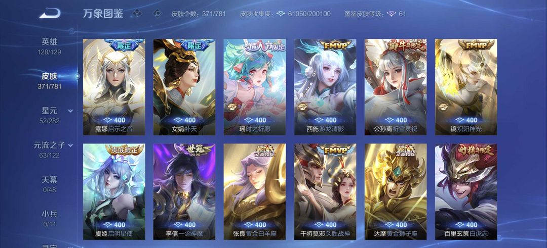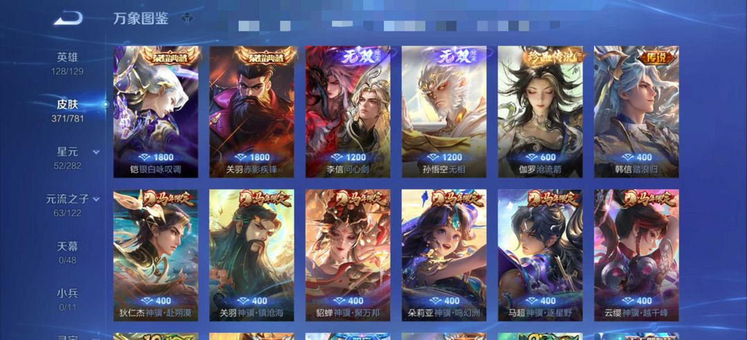 扫码登录。VIP10。385皮肤,七水,四星元,双王者之证!武则天神域,李白荣耀典藏,全息碎影,全符文,各种限定,各种机甲,皮肤都有,绝对满足各位