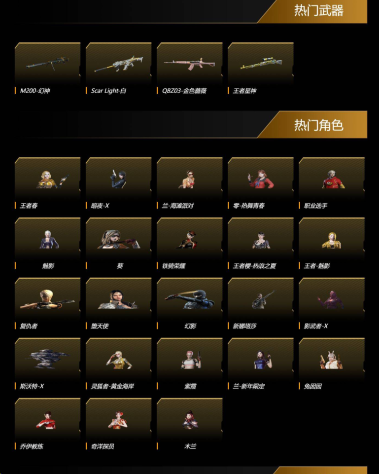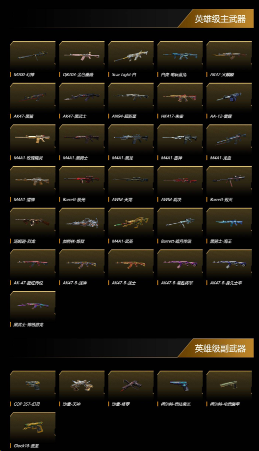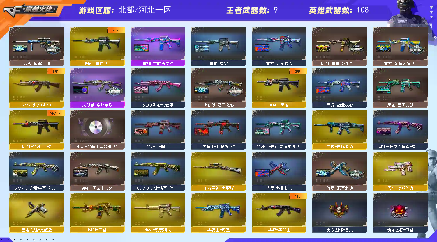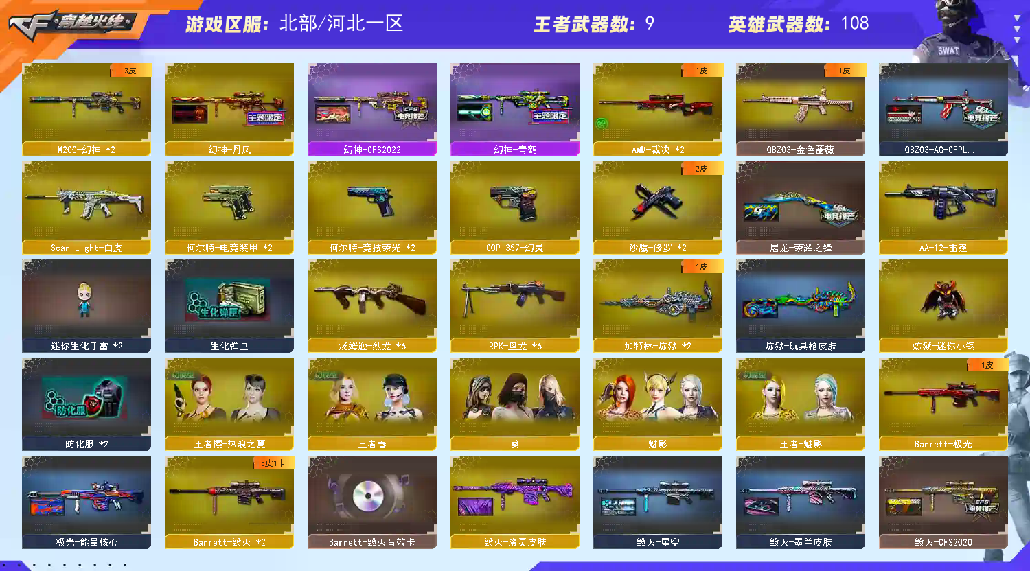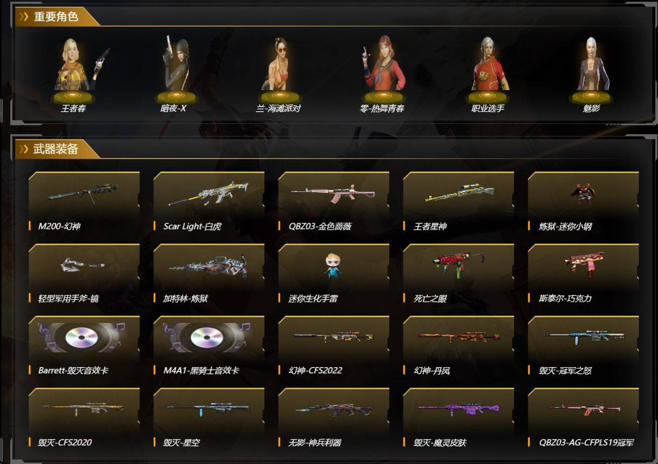 【武圣套/6烈龙/6盘龙】【M200-幻神/幻神-CFS2022/幻神-丹凤/幻神-青鹤】【王者星神】【柯尔特-竞技荣光*2】【Scar Light-白虎】【QBZ03-金色蔷薇/QBZ03-AG-CFPLS19冠军】【M4A1-雷神*2/雷神-荣耀之魄*2/M4A1-雷神-白鲨皮肤/M4A1-雷神-CFS 2019/雷神-宇航兔皮肤/雷神-星空/雷神-能量核心】【柯尔特-电竞装甲*2/Glock18-武圣/COP 357-幻灵】【Barrett-毁灭*2/Barrett-毁灭音效卡/毁灭-冠军之怒/毁灭-CFS2020/毁灭-星空/毁灭-魔灵皮肤】【AK47-火麒麟*3/火麒麟-巅峰荣耀/火麒麟-冠军之心/火麒麟-CFSTAR/火麒麟-心动糖果】【M4A1-黑骑士*2/M4A1-黑骑士音效卡*2/黑骑士-海王/黑骑士-地狱火*2/黑骑士-电玩青兔皮肤*2】【M4A1-黑龙/黑龙-墨子皮肤/黑龙-能量核心】【HK417-朱雀】【无影-神兵利器】【AK47-黑武士/黑武士-锦绣游龙/AK47-黑武士-361】【AWM-天龙/天龙-CFSTAR/AWM-天龙-传奇70KG/AWM-天龙-传奇白鲨/天龙-秘银】【Barrett-极光/极光-能量核心】【AWM-裁决*2】【汤姆逊-烈龙*6】【RPK-盘龙*6】【加特林-炼狱*2】【死亡之眼/迷你生化手雷*2】【沙鹰-修罗*2/修罗-CFSTAR/修罗-冠军之魂/修罗-能量核心】【沙鹰-天神/天神-动感闪耀】【麒麟刺*2】【擎天】【屠龙*4/屠龙-荣耀之锋/屠龙-动感闪耀/屠龙-秘银】【龙啸*3】【职业选手/王者春/王者-魅影/王者樱-热浪之夏/魅影/暗夜-X/兰-海滩派对/零-热舞青春/木兰/奇洋探员/乔伊教练/兔囡囡/兰-新年限定/紫霞/灵狐者-黄金海岸/斯沃特-X/影武者-X/铁骑荣耀/新娜塔莎/幻影/堕天使/复仇者】【M4A1-玫瑰精灵/M4A1-龙血/M4A1-猎神/M4A1-武圣】【白虎-电玩蓝兔/AK47-B-常胜将军/AK47-B-身先士卒/AK47-B-战士*2/AK47-B-战神/AK-47-猩红传说*6】【AA-12-雷霆/AK47-黑鲨】【AN94-超新星/超新星-悦享】【Barrett-暗月传说*2】【Colt 1911-大黄蜂/新USP-枪王排位奖励*4】【斩魔刀/斩神刀*2/金刚伞-电玩红兔/迷你深渊冰龙】【激光毁灭者III/冰龙粉碎者-白马银枪】【炼狱-迷你小钢/斯泰尔-巧克力/轻型军用手斧-镜】【COP-旗袍/天龙-曼陀罗】【王者之影/王者炎心/王者之魂/王者之锋/王者之啸】【高爆手雷-竞技荣光*2/闪光弹-竞技荣光/烟雾弹-竞技荣光】【烟雾弹-云龙】【高爆手雷-堕天神/闪光弹-堕天神/烟雾弹-堕天神】【高爆手雷-神工天巧/闪光弹-神工天巧/烟雾弹-神工天巧】【高爆手雷-幻灵*3/闪光弹-幻灵*2/烟雾弹-幻灵*4】【闪光弹-电竞装甲/烟雾弹-电竞装甲】【手雷-热带奇洋】【炫金雷神/炫金毁灭/炫金修罗】【绝迹语音包】【透明头盔/透明护目镜/闪光护目镜/超级背包/防弹头盔*2/防弹衣*2/C4工具钳/手雷包/防化服*2】;RPK-盘龙,QBZ03-金色蔷薇,M200-幻神,Scar Light-白虎,