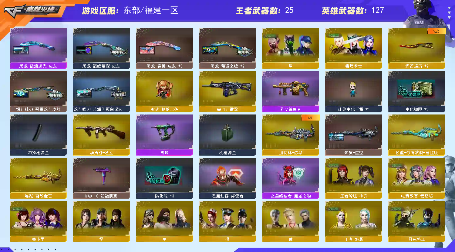【商品标题】:东部福建一区-144V-可二次实名-【Lv.100.3-元首】-【段位:荣耀之巅】 【稀有武器】:传说幽冥/M200-幻神/Kar98K-星神/G36C-幻影/ScarLight-白虎/QBZ03-天罚/柯尔特-竞技荣光(2)/柯尔特-荣耀世冠白鲨2023(3)/修罗-古蛇迷踪/柯尔特-冠军之特/金色蔷薇-古蛇迷踪/QBZ03-金色蔷薇/AK47-火麒麟(2)/AK47-麒麟/M4A1-黑龙(2)/M4A1-雷神(3)/M4A1-黑骑士/AK47-无影(2)/AK47-黑武士/Barrett-毁灭/Barrett-极光/AWM-裁决/M200-竞技荣光/加特林-炼狱/悦蓝-惊涛骇浪-觉醒版/汤姆逊-烈龙/AA-12-雷霆/炽芒蝶刃(2)/擎天-竞技荣光 【王者武器】:王者白虎-觉醒版 【热门角色】:传说艾莉莎/电竞教官-云悠悠/关小雨/枪娘樱/鹰/月兔特工/隼/奇洋探员/乔伊教练/蛇隐宗/王者-魅影/王者玲珑-小乔/炽天使/兔囡囡/职业选手/潘多拉 【热门音效卡】:AWM-裁决音效卡/Scar Light-白虎音效卡/QBZ03-金色蔷薇音效卡/M4A1-黑骑士音效卡 【热门皮肤】:幻神-冠军之幻/幻神-电流骇客皮肤/幻影-破浪逐光皮肤/火麒麟-傲竹金蛇皮肤/金色蔷薇-量子蔷薇皮肤/屠龙-星火燎原/裁决-羽掣皮肤/雷神-R.LGD-CFPLS18冠军(2)/擎天-冠军之击/QBZ03-冠军之薇/白虎-巅峰荣耀 皮肤/屠龙-破浪逐光皮肤/星神-璀璨皮肤/裁决-流光秘银/黑龙-冠军之武/屠龙-巅峰荣耀皮肤/传奇石头-横秒之巅/QBZ03-荣耀世冠白鲨/炽芒蝶刃-荣耀世冠白鲨2023皮肤/屠龙-荣耀之锋(2)/毁灭-荣耀之怒/屠龙-春桃皮肤(3)/龙啸-冠军之啸/炽芒蝶刃-冠军炽芒皮肤/雷神-荣耀之魄 【其他亮点】:Knife-冠军之刃/玄武-枪娘火莲/毒蜂/超核名片 (截图展示段位不代表实际段位,如赛季更新等不可抗拒因素发生变化,其余道具看截图或咨询客服);USP-雷暴王者,柯尔特-荣耀世冠白鲨2023,传说幽冥,柯尔特-冠军之特,炽芒蝶刃,Knife-冠军之刃,隼,