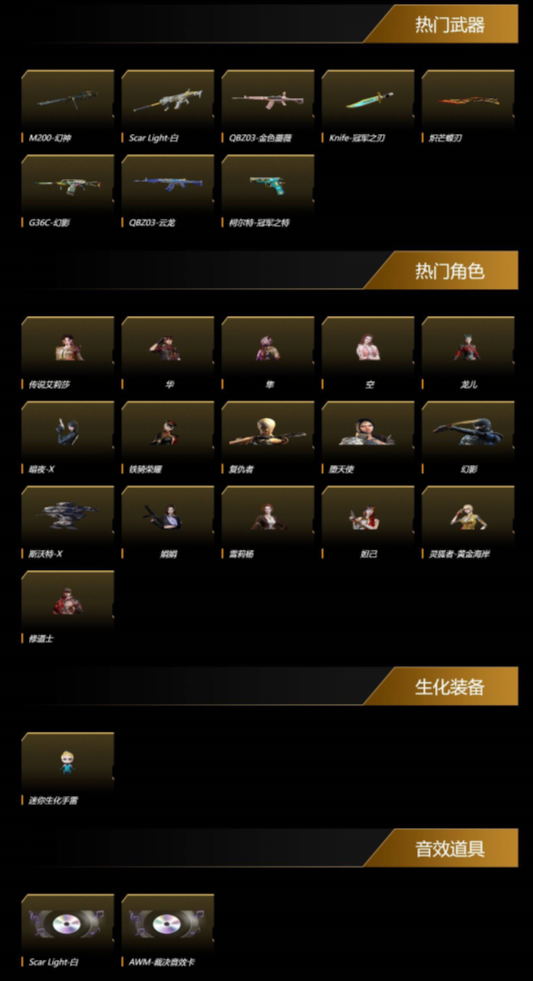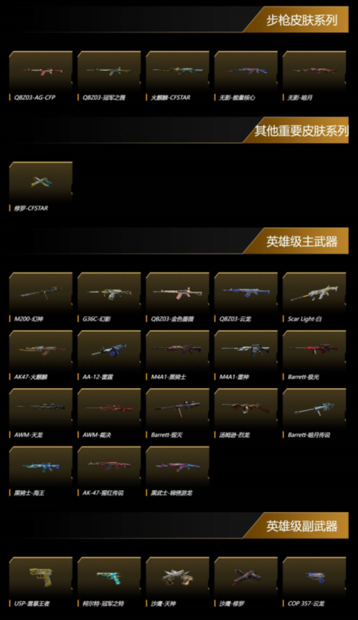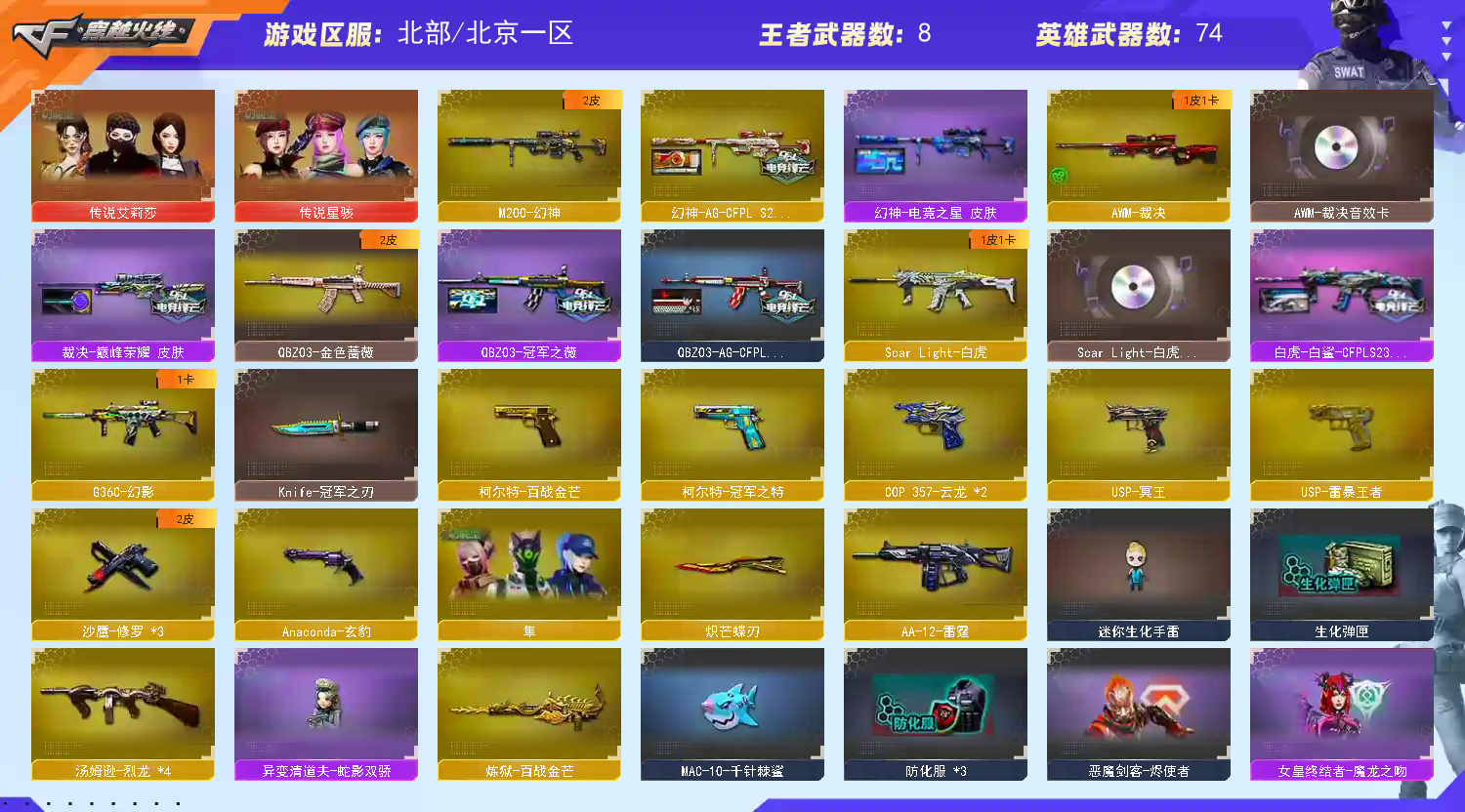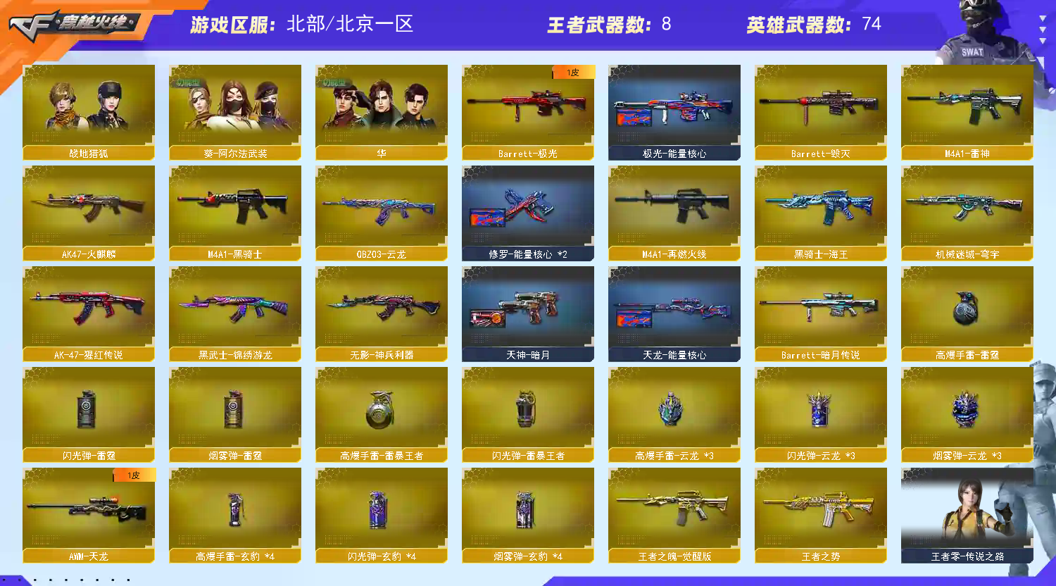 【北京一区/78V/vip1/2传说】【传说艾莉莎】【华/隼】【M200-幻神】【炽芒蝶刃】【Knife-冠军之刃】【G36C-幻影/QBZ03-云龙】【柯尔特-冠军之特/USP-雷暴王者】【Scar Light-白虎/Scar Light-白虎音效卡】【QBZ03-金色蔷薇/QBZ03-冠军之薇/QBZ03-AG-CFPLS19冠军】【M4A1-雷神】【COP 357-云龙*2】【Barrett-毁灭】【AK47-火麒麟/火麒麟-CFSTAR】【M4A1-黑骑士/黑骑士-海王】【无影-神兵利器/无影-能量核心】【黑武士-锦绣游龙】【AWM-天龙/天龙-CFSTAR/天龙-能量核心】【Barrett-极光/极光-能量核心】【AWM-裁决/AWM-裁决音效卡】【汤姆逊-烈龙*4】【迷你生化手雷】【沙鹰-修罗*3/修罗-CFSTAR/修罗-能量核心*2】【沙鹰-天神】【云龙扇】【麒麟刺*2】【擎天】【屠龙*2】【龙啸】【龙儿/暗夜-X/修道士/灵狐者-黄金海岸/妲己/雪莉杨/娟娟/斯沃特-X/铁骑荣耀/幻影/堕天使/复仇者】【AK-47-猩红传说】【AA-12-雷霆】【Barrett-暗月传说】【Colt 1911-大黄蜂/新USP-枪王排位奖励】【斩魔刀】【神圣爆裂者-末日III/冰龙粉碎者-白马银枪】【王者之魄/王者之势】【高爆手雷-云龙*3/闪光弹-云龙*3/烟雾弹-云龙*3】【高爆手雷-雷霆/闪光弹-雷霆/烟雾弹-雷霆】【高爆手雷-雷暴王者/闪光弹-雷暴王者】【烟雾保护头盔/闪光护目镜/超级对讲机/防弹头盔*3/防弹衣*3/C4工具钳*3/手雷包*3/防化服*3】;USP-雷暴王者,柯尔特-冠军之特,炽芒蝶刃,Knife-冠军之刃,传说星骇,隼,传说艾莉莎,