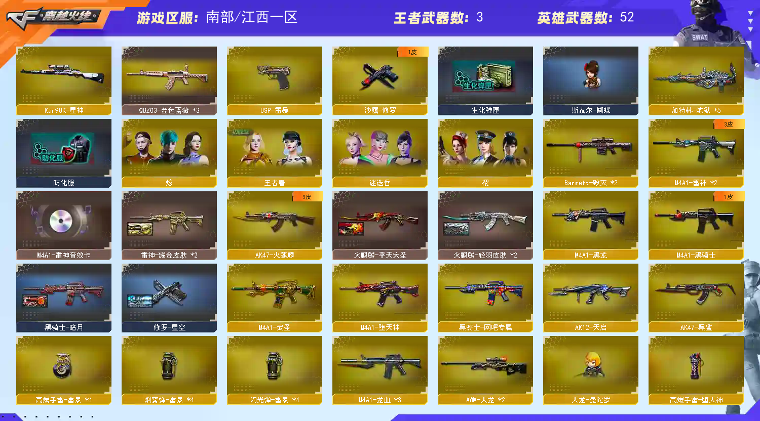 【热门武器】:QBZ03-金色蔷薇*3,Kar98K-星神,M4A1-黑骑士,加特林-炼狱*5,斯泰尔-蝴蝶,COP-白鲨,USP-雷暴,沙鹰-修罗【王者炫金武器】:王者之势,王者之啸,炫金骑士,炫金武士【音效卡】:M4A1-雷神音效卡【皮肤】:雷神-耀金皮肤*2,火麒麟-轻羽皮肤*2,火麒麟-平天大圣,黑骑士-暗月,无影耀金皮肤,AWM-天龙-传奇70KG,修罗-星空【角色】:樱,炫,迷迭香,王者春,北极狐-X,潘多拉-X,邱刚敖,蜀雪【人偶武器】:COP-白鲨,天龙-曼陀罗,斯泰尔-蝴蝶,迷你深渊冰龙,迷你牛魔王,夺魂,生化手雷-机甲核心,深渊终结者手雷,迷你艾比,迷你巨石泰坦-魔花研究所【暴走生化】:超级对讲机【挑战大师】:神圣爆裂者III,AK47-冰龙粉碎者,阐释者III【英雄级武器】:AK47-火麒麟,M4A1-黑龙,M4A1-雷神*2,M4A1-黑骑士,AK12-天启,M4A1-武圣,AK47-黑鲨,M4A1-龙血*3,M4A1-堕天神,QBZ03-金色蔷薇*3,王者之戮-觉醒版,AWM-天龙*2,Barrett-毁灭*2,Kar98K-星神,加特林-炼狱*5,沙鹰-修罗,USP-雷暴,屠龙*3,龙啸*3,麒麟刺-堕天神,麒麟刺*2,斩神刀-雷暴,高爆手雷-雷暴*4,高爆手雷-堕天神,闪光弹-雷暴*4,闪光弹-堕天神,烟雾弹-雷暴*4,烟雾弹-堕天神【源级武器】:源-千变,源·火麒麟*2,源·雷神,魂·雷神-维纳斯,御·雷神-烈虎,御·雷神-葫芦兄弟,御·雷神-小白龙,源·黑骑士,魂·黑骑士-破浪10年,御·黑骑士-冰魄,御·黑骑士·哪吒闹海,源·青龙,源-金色蔷薇,源-极光,源·天龙,源·毁灭*2,魂·擎天-破浪10年,源·龙啸【道具】:R.LGD炫彩背包,炫彩背包,灵魂忍者,变异宝贝,妖姬,迷雾幽灵,生化弹匣,夺命之镰,防化服,金色流光-枪王排位,星辰流光-枪王排位,防弹头盔*4,防弹衣*4,C4工具钳*3,手雷包*3【特殊枪械】:蝴蝶斯泰尔+0烈龙,1黑骑士,5炼狱,1蝴蝶斯泰尔;USP-雷暴,QBZ03-金色蔷薇,Kar98K-星神,