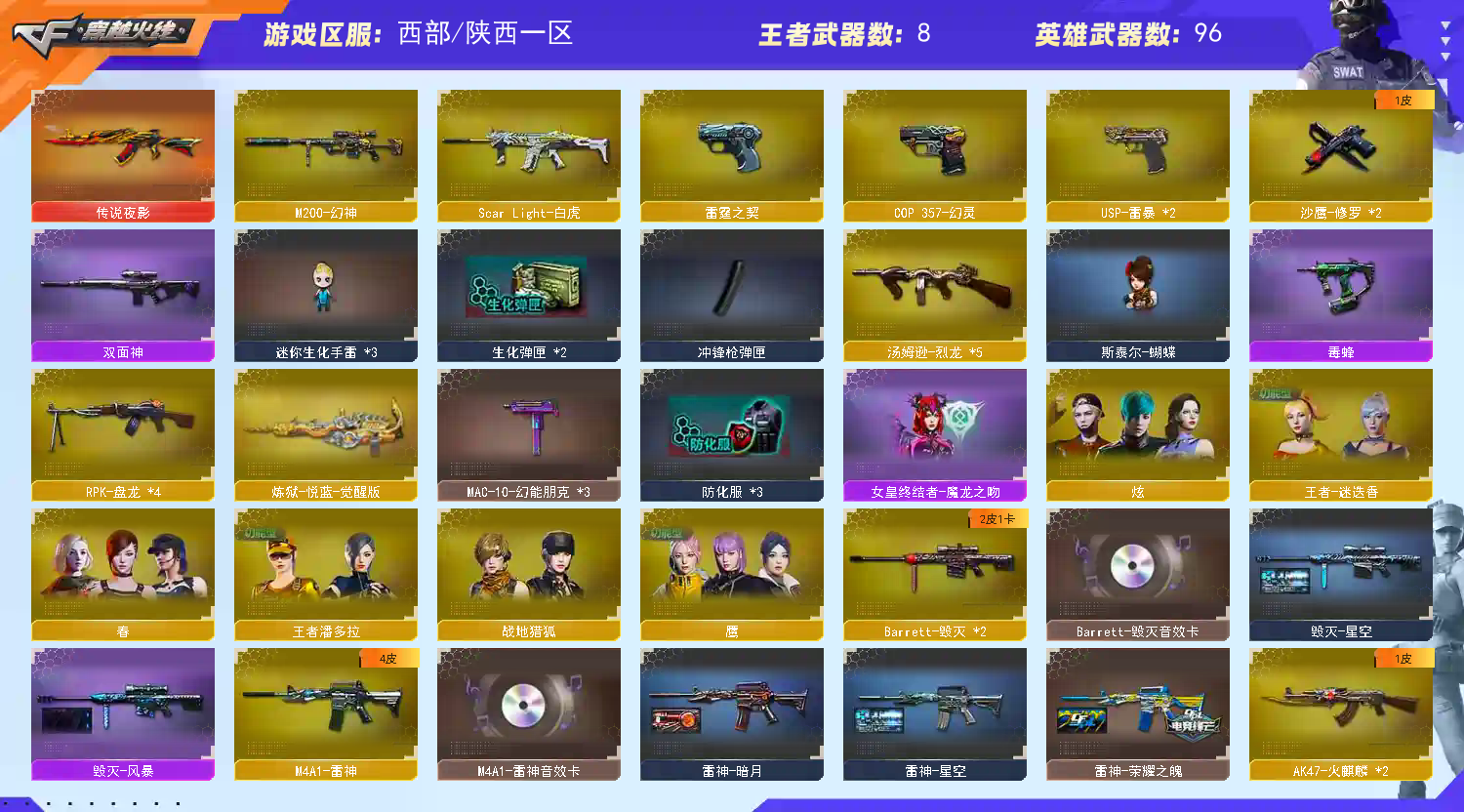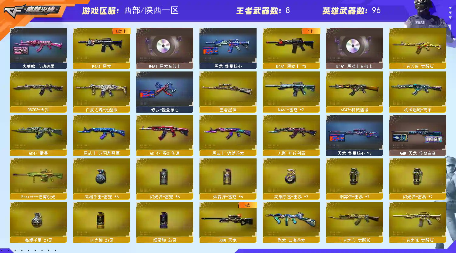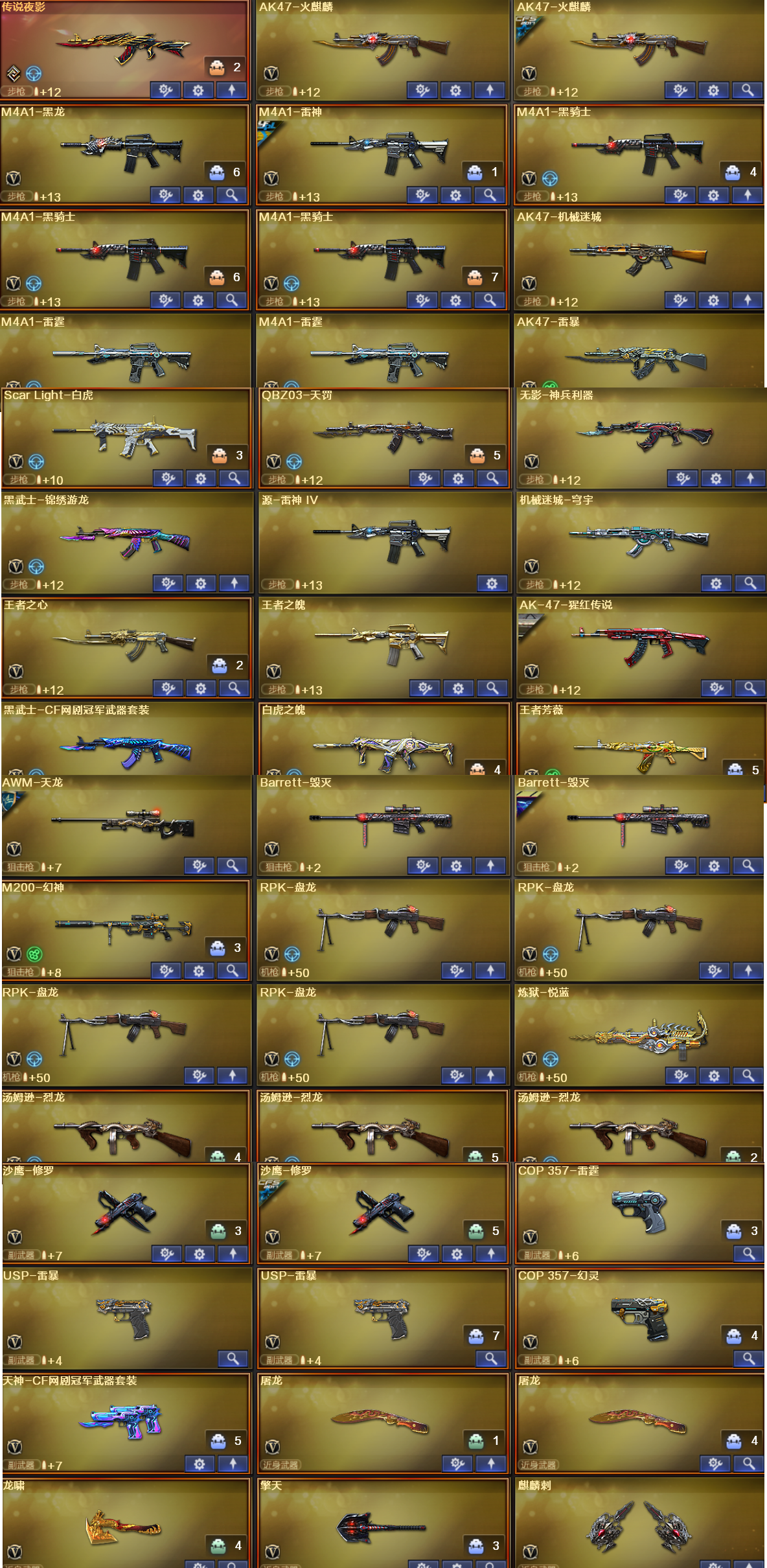 稀有武器:传说夜影, M200幻神,烈龙X6,火麒麟X2,黑龙,雷神,黑骑士×3,机械迷城,雷霆X2, Ak47雷暴,scar白虎,天龙,QBZ天罚,无影神兵利器,黑武士锦绣游龙,源雷神,机械迷城琼宇,白虎之魄,毁灭X2,盘龙X4,炼狱悦蓝,修罗X2, Cop雷霆,USP雷暴X2, COP幻灵,屠龙x2,龙啸,擎天X2,尼泊尔雷霆,斩神刀雷暴,幻灵之锋,擎天云海游龙,龙啸烈火龙威, M4A1赤狱骑士,碧霄极光,M4A1仙界黑骑士