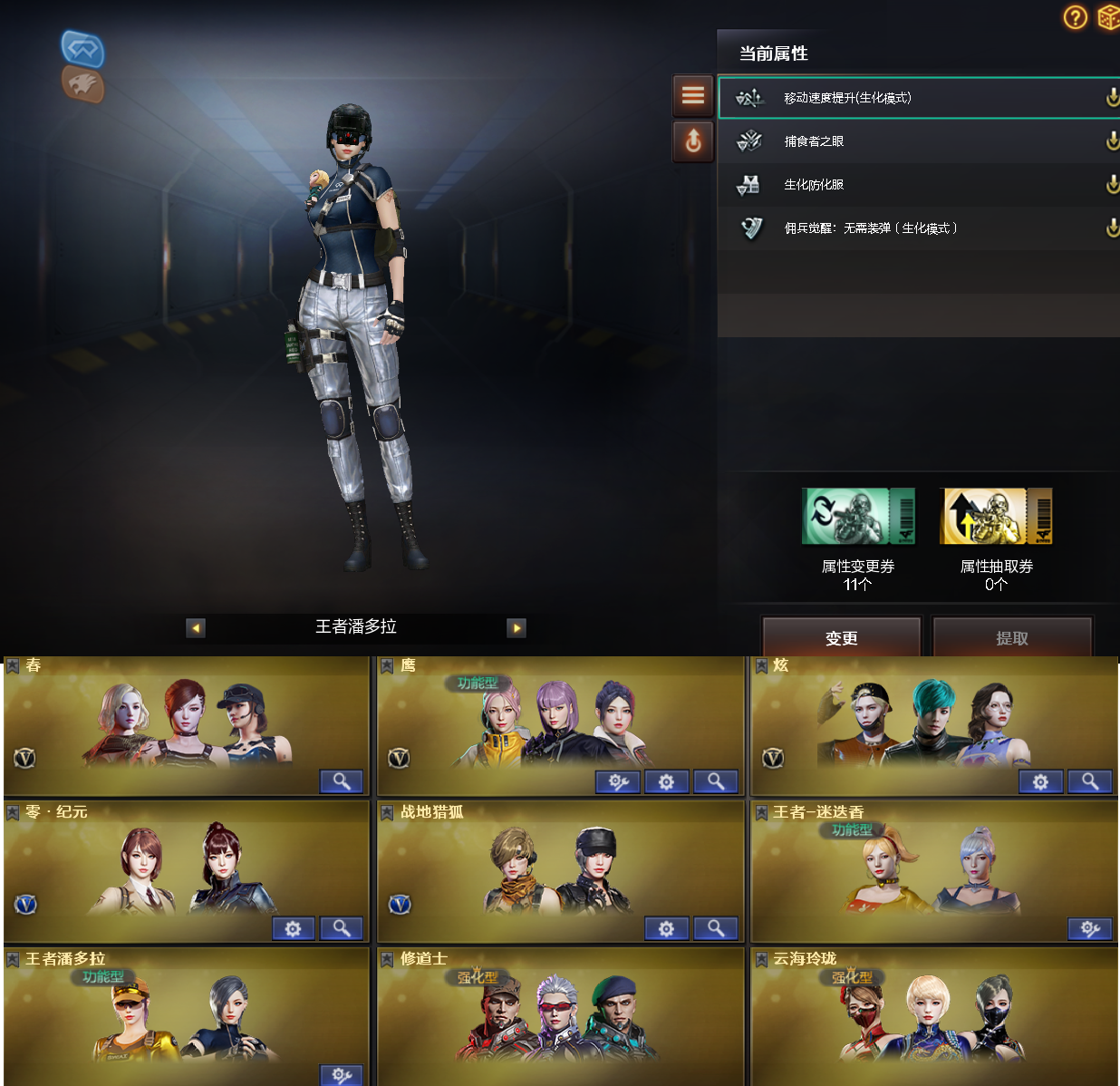 稀有角色:四防王者潘多拉(移动速度提升/捕食者之眼/生化防化服/佣兵觉醒),春,鹰,炫,零纪元,战地猎狐,王者迷迭香,修道士,云海玲珑