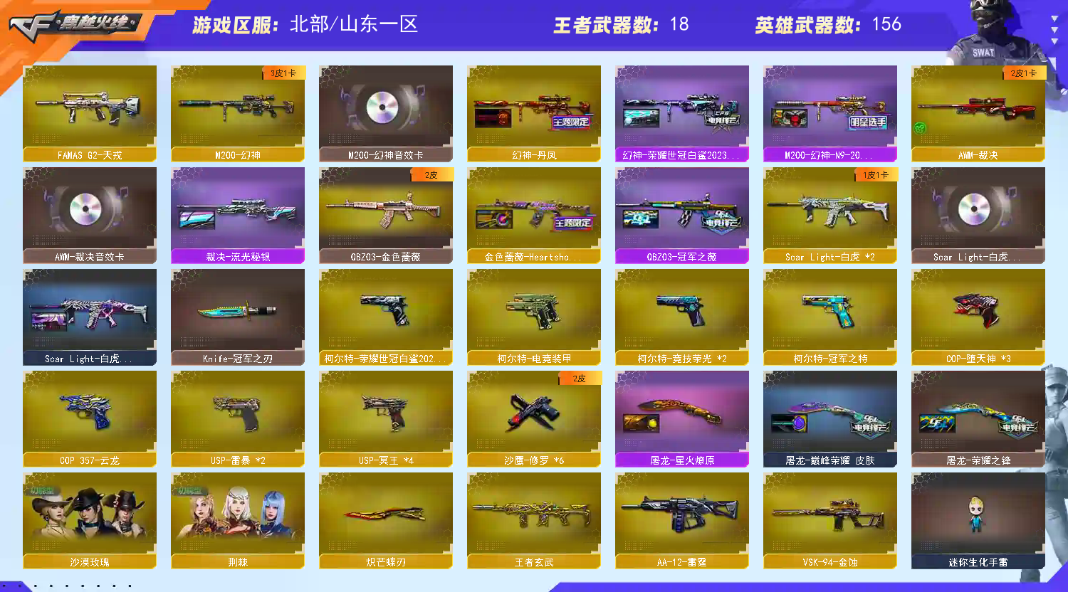 CF稀有皮肤号!幻神N9/冠军皮、王者全系列、火麒麟AG/雷神全套,绝版音效卡拉满,收藏级毕业号! 禁止挂机 禁止开挂 开挂必究 炸鱼请控制尺度 挂机炸鱼导致禁赛会收取押金 希望文明游戏 欢迎老板体验 冻结请发起号主协助;USP-雷暴,柯尔特-荣耀世冠白鲨2023,柯尔特-冠军之特,炽芒蝶刃,Knife-冠军之刃,沙漠玫瑰,电竞教官-云悠悠,