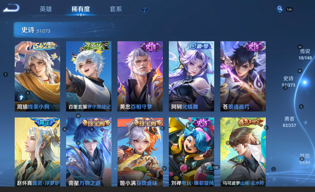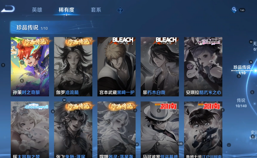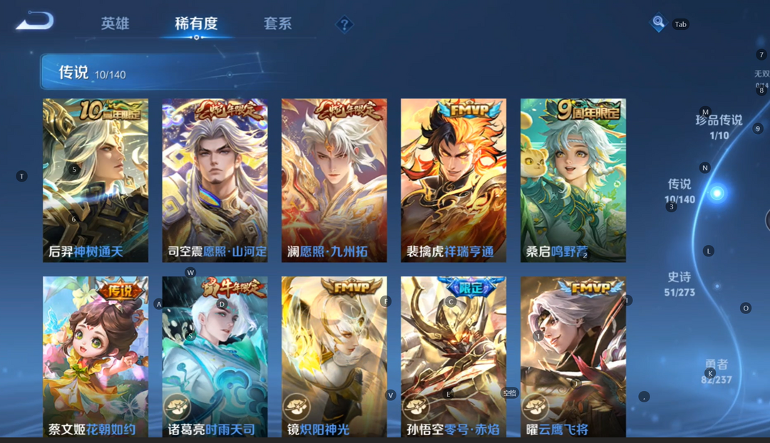 v10、537皮6水4无双、安琪拉-颠倒童话·魔镜、朵莉亚-神骥、遇见神鼓、齐天大圣、白虎志、韩信荣耀典藏、73传说、时之魔女、瑶无双、青丘、九尾、神器明辉仪