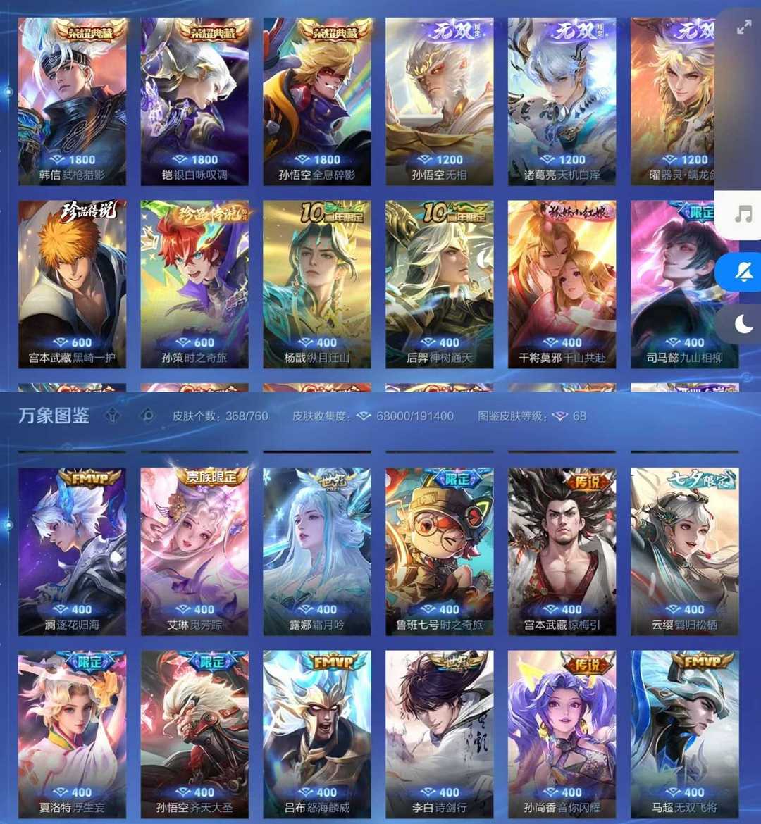 v10、537皮6水4无双、安琪拉-颠倒童话·魔镜、朵莉亚-神骥、遇见神鼓、齐天大圣、白虎志、韩信荣耀典藏、73传说、时之魔女、瑶无双、青丘、九尾、神器明辉仪