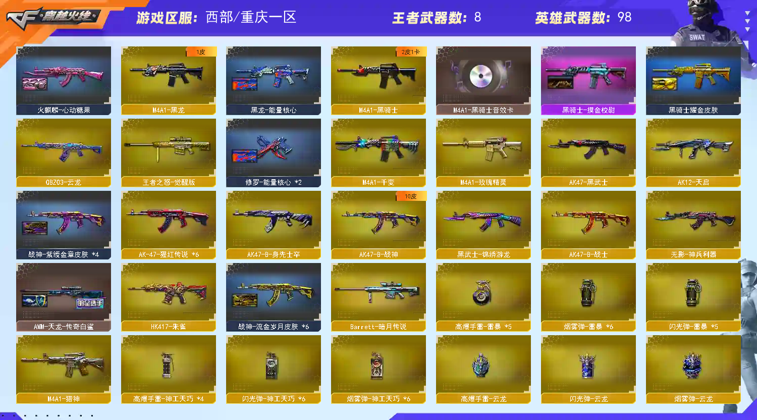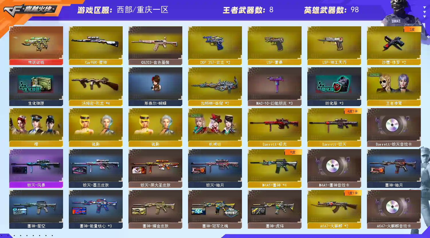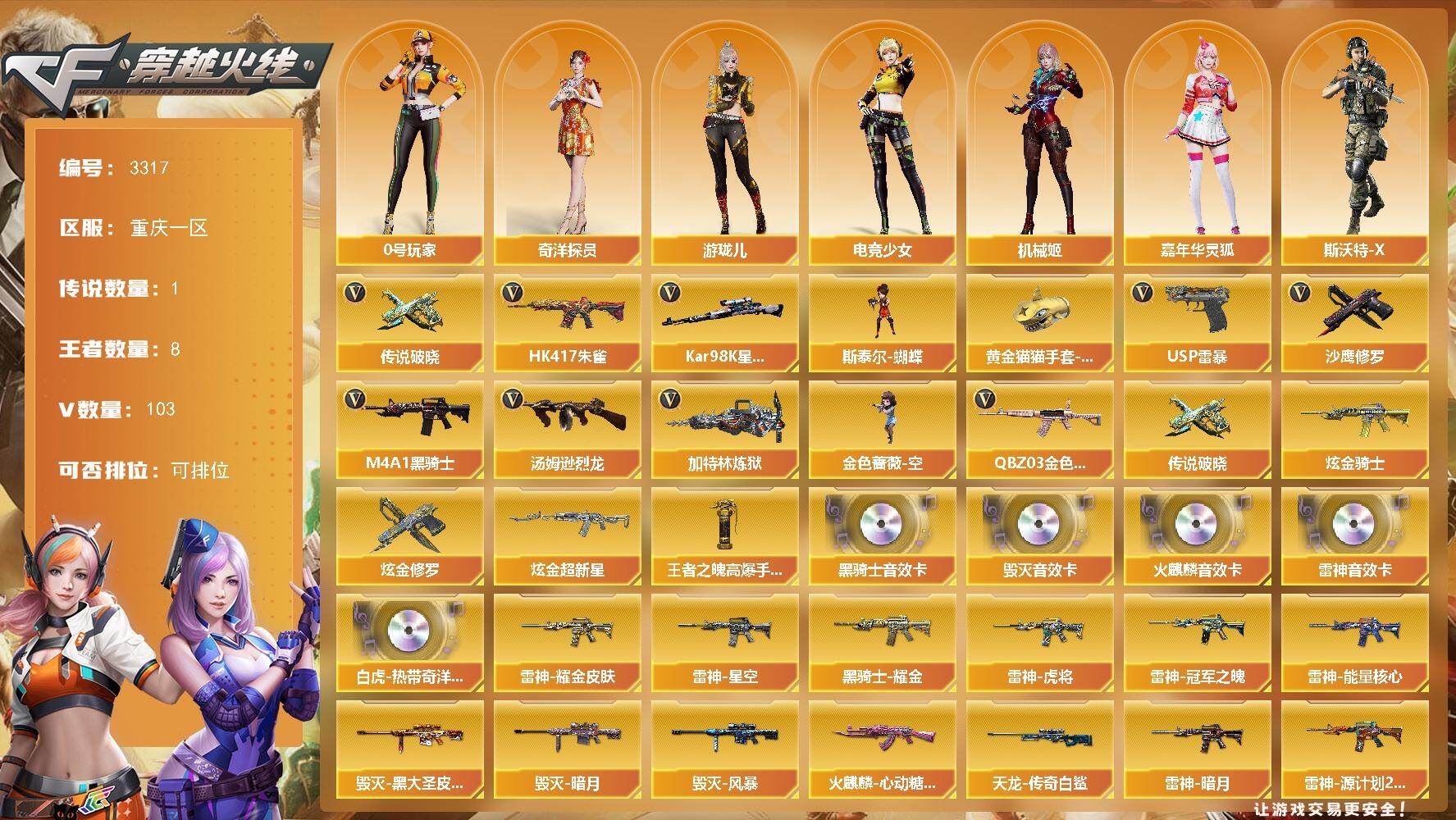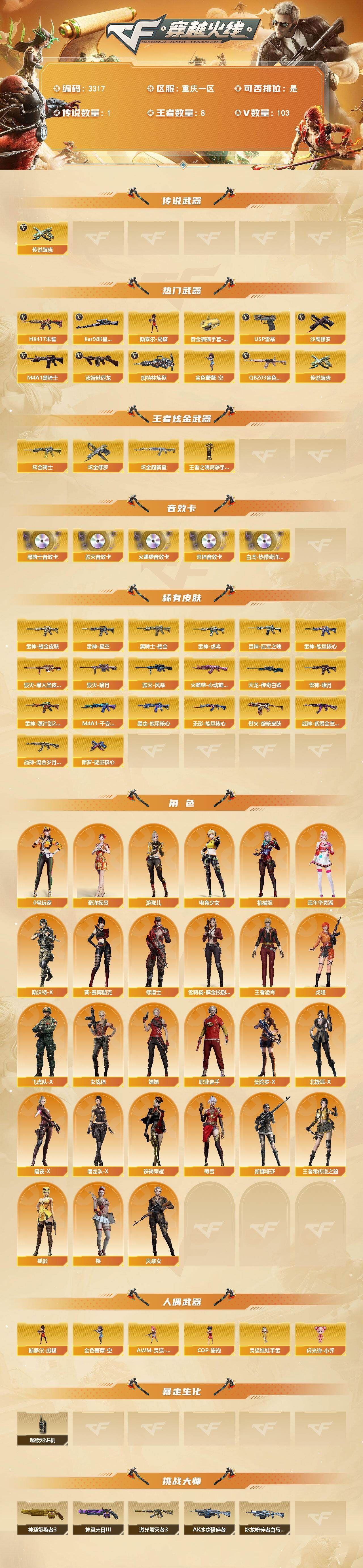 【热门武器】:传说破晓,QBZ03-金色蔷薇,HK417-朱雀,Kar98K-星神,M4A1-黑骑士,汤姆逊-烈龙*4,加特林-炼狱,金色蔷薇-空,斯泰尔-蝴蝶,USP-雷暴,沙鹰-修罗*2,黄金猫猫手套-白鲨【王者炫金武器】:王者之魄高爆手雷,炫金骑士,炫金超新星,炫金修罗【音效卡】:Scar Light-白虎-热带奇洋音效卡,AK47-火麒麟音效卡,M4A1-雷神音效卡,M4A1-黑骑士音效卡,Barrett-毁灭音效卡【皮肤】:雷神-暗月,雷神-能量核心*3,雷神-星空,雷神-虎将,雷神-耀金皮肤,雷神-冠军之魄,雷神-源计划2.0专属 皮肤,火麒麟-心动糖果,毁灭-暗月,毁灭-黑大圣皮肤,毁灭-风暴,M4A1-千变-孔明皮肤,黑龙-能量核心,黑骑士耀金皮肤,无影-能量核心*2,烈火-熔核皮肤,战神-紫绶金章皮肤*4,战神-流金岁月皮肤*6,AWM-天龙-传奇白鲨,修罗-能量核心*2【角色】:樱,机械姬,王者凌霄,狐影,奇洋探员,修道士,暗夜-X,北极狐-X,电竞少女,飞虎队-X,风暴女,虎妞,嘉年华灵狐,娟娟,葵-赛博朋克,0号玩家,曼陀罗-X,女战神,潜龙队-X,斯沃特-X,蜀雪,铁骑荣耀,王者-零-传说之路,新娜塔莎,雪莉杨-摸金校尉,游珑儿,职业选手【人偶武器】:金色蔷薇-空,斯泰尔-蝴蝶,AWM-灵狐-15周年嘉年华,COP-旗袍,闪光弹-小乔,灵狐娃娃手雷【暴走生化】:超级对讲机【挑战大师】:神圣爆裂者III,AK47-冰龙粉碎者,冰龙粉碎者-白马银枪,激光毁灭者III,神圣爆裂者-末日III【英雄级武器】:M4A1-千变,AK47-火麒麟*2,M4A1-黑龙,M4A1-雷神*4,M4A1-黑骑士,AK47-黑武士,AK12-天启,HK417-朱雀,无影-神兵利器,QBZ03-云龙,黑武士-锦绣游龙,超新星-热带奇洋,M4A1-玫瑰精灵,QBZ03-金色蔷薇,M4A1-猎神,王者之影-觉醒版,王者之魄-觉醒版,AK-47-猩红传说*6,AK47-B-战神,王者冰魄-觉醒版,王者炎心-觉醒版,AK47-B-身先士卒,AK47-B-战士,AWM-天龙,Barrett-毁灭,Barrett-极光,Kar98K-星神,王者之怒-觉醒版,Barrett-暗月传说,加特林-炼狱,汤姆逊-烈龙*4,沙鹰-修罗*2,沙鹰-天神,USP-雷暴,COP 357-云龙*2,USP-神工天巧,屠龙*2,龙啸*3,擎天,麒麟刺,唐刀-神工天巧,龙啸-热带奇洋,斩神刀-雷暴*3,王者之击-觉醒版*2,高爆手雷-雷暴*5,高爆手雷-神工天巧*4,高爆手雷-云龙,手雷-热带奇洋,闪光弹-雷暴*5,闪光弹-竞技荣光*2,闪光弹-神工天巧*6,闪光弹-云龙,烟雾弹-雷暴*6,烟雾弹-竞技荣光,烟雾弹-神工天巧*6,烟雾弹-云龙【道具】:CFS限定背包,全能枪王背包,冰冰背包,奇洋探员-海龟背包,战舰背包,炫彩背包,热带奇洋炫彩背包,超级背包,救世主-黑桃战神,绿色巨人,灵魂忍者*2,变异宝贝,妖姬,迷雾幽灵*2,生化弹匣,夺命之镰,防化服*2,金色流光-枪王排位,枪王排位28赛季金色流光,热带奇洋表情,EP战队名片,EP战队喷图,防弹头盔*6,防弹衣*4,C4工具钳*4,手雷包*5【特殊枪械】:蝴蝶斯泰尔+4烈龙,1黑骑士,4烈龙,1炼狱,1蝴蝶斯泰尔;USP-雷暴,QBZ03-金色蔷薇,Kar98K-星神,
