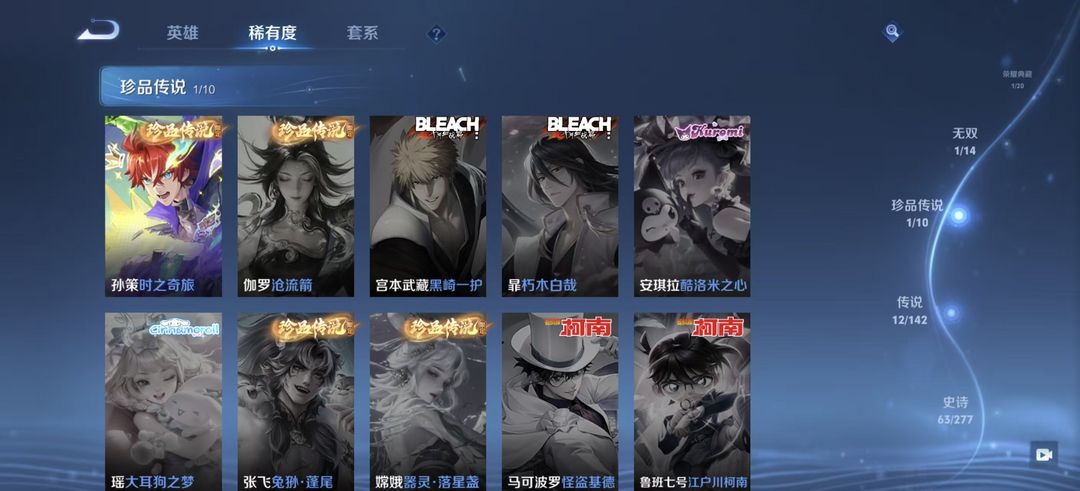 v10、537皮6水4无双、安琪拉-颠倒童话·魔镜、朵莉亚-神骥、遇见神鼓、齐天大圣、白虎志、韩信荣耀典藏、73传说、时之魔女、瑶无双、青丘、九尾、神器明辉仪