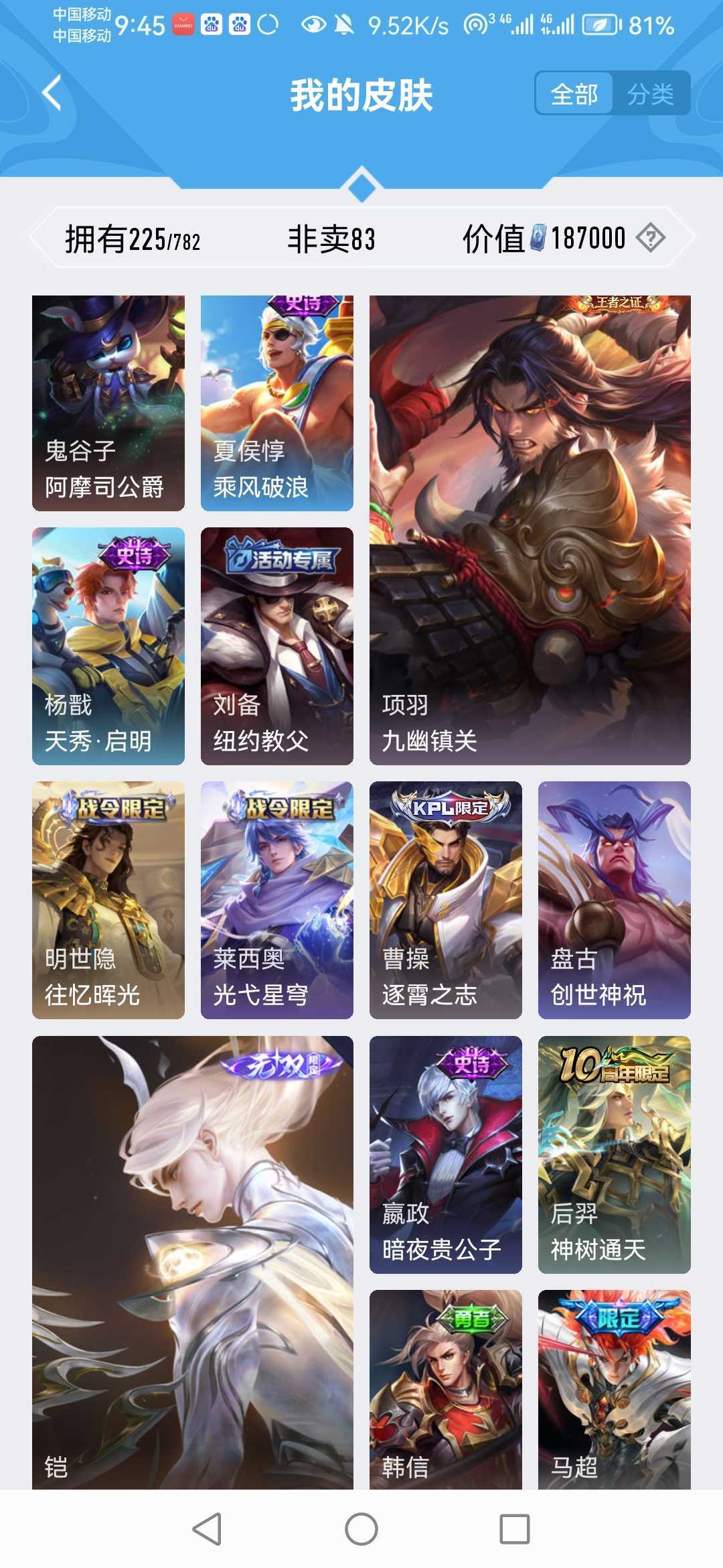 【非云直上】V10★皮肤榜一★539皮满典藏★鲁班时之奇旅会员★虞姬黛羽霜翎星元★吕布白金战神★全能大师★多金标★个性按键