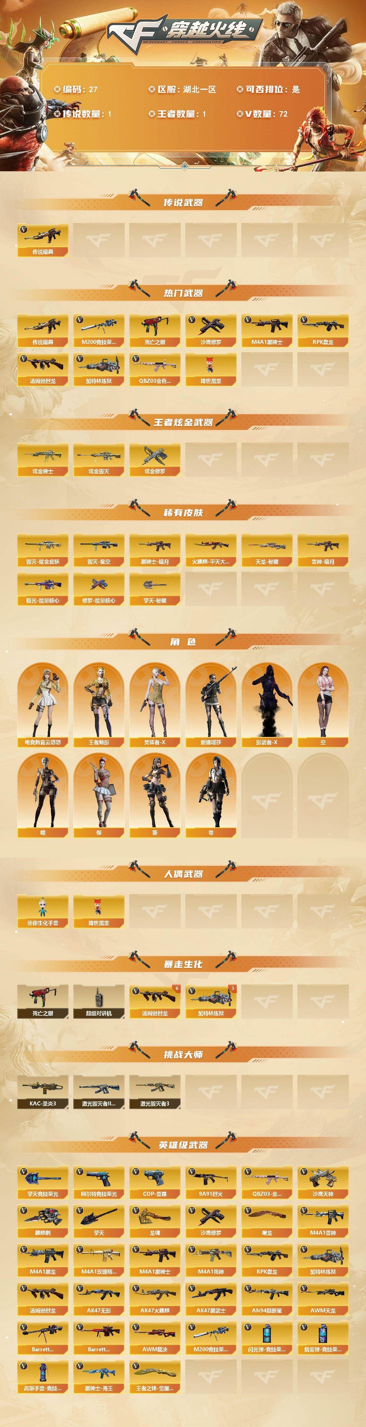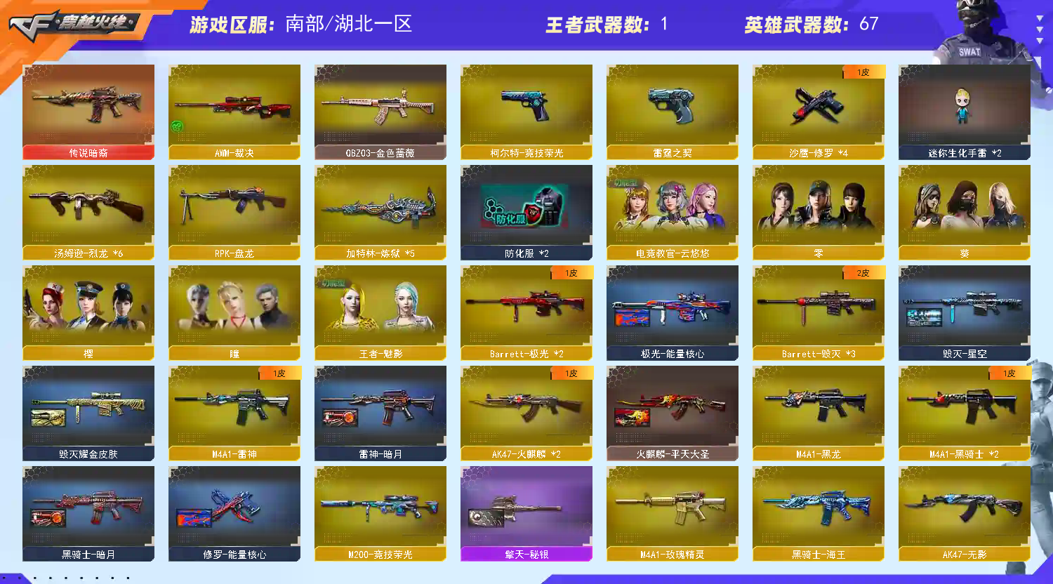 【传说武器】:传说暗裔【热门武器】:传说暗裔,QBZ03-金色蔷薇,M200-竞技荣光,死亡之眼*2,M4A1-黑骑士*2,汤姆逊-烈龙*6,RPK-盘龙,加特林-炼狱*5,降世魔童,沙鹰-修罗*4【王者炫金武器】:炫金骑士,炫金毁灭,炫金修罗【皮肤】:雷神-暗月,火麒麟-平天大圣,毁灭耀金皮肤,毁灭-星空,黑骑士-暗月,天龙-秘银,极光-能量核心,修罗-能量核心,擎天-秘银【角色】:零,葵,樱,瞳,4防电竞教官-云悠悠,4防王者-魅影,空,灵狐者-X,新娜塔莎,影武者-X【人偶武器】:迷你生化手雷*2,降世魔童【暴走生化】:死亡之眼*2,超级对讲机【挑战大师】:激光毁灭者III-白马银枪,激光毁灭者III,KAC-圣炎切割者III【英雄级武器】:AK47-火麒麟*2,M4A1-黑龙,M4A1-雷神,M4A1-黑骑士*2,AK47-无影,M4A1-死神,AK47-黑武士,AN94-超新星,M4A1-玫瑰精灵,QBZ03-金色蔷薇,9A91-烈火*2,黑骑士-海王,AWM-天龙,Barrett-毁灭*3,Barrett-极光*2,AWM-裁决,M200-竞技荣光,RPK-盘龙,加特林-炼狱*5,汤姆逊-烈龙*6,沙鹰-修罗*4,沙鹰-天神*2,COP-雷霆,柯尔特-竞技荣光,屠龙*2,龙啸,擎天*2,麒麟刺,擎天-竞技荣光,王者之锋-觉醒版,高爆手雷-竞技荣光*5,闪光弹-竞技荣光*5,烟雾弹-竞技荣光*6【其他武器】:源-千变,源·火麒麟,魂·火麒麟-百城,源·雷神*2,御·雷神-机甲刑天,御·雷神-烈虎*2,雷神-赛博幻想,御·雷神-葫芦兄弟,魂·黑骑士-摸金校尉,御·黑骑士-冰魄,魂·龙血-锋芒破茧,源·青龙*2,源·猎神,源-极光,源·天龙,源·毁灭,魂·毁灭-青帝,御·毁灭-怒火大圣,御·炼狱-女娲,源-擎天【道具】:战舰背包,背包-葫芦兄弟,超级背包,妩媚妖姬,变异宝贝,夺命之镰,防化服,防弹头盔*5,防弹衣*5,C4工具钳*5,手雷包*4【特殊枪械】:2黑骑士,6烈龙,1盘龙,5炼狱;电竞教官-云悠悠,RPK-盘龙,QBZ03-金色蔷薇,传说暗裔,