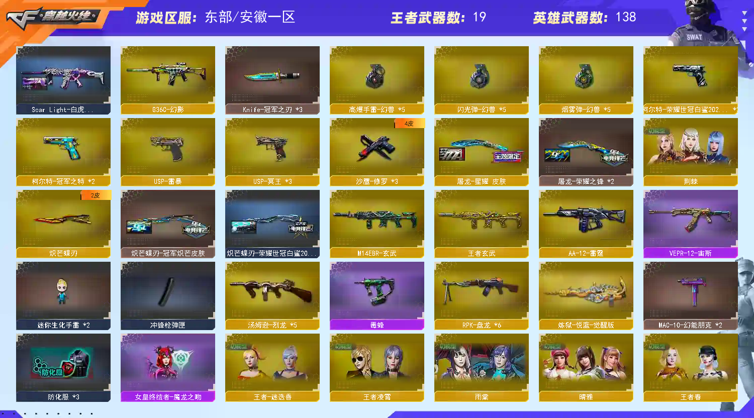 1087东部【安徽一区】126🆚【可排位】VIP6【传说艾丽莎+五套幻兽】【幻神七皮+三件套】【星神三皮+三件套】【qbz六皮+三件套】【白虎三皮+三件套】【裁决三皮+三件套】【传说辉光 传说夜影 传说幽瞳 传说幽冥】【qbz-威猛悍鲨】【王者之心 王者之影 王者之势x2 王者冰魄 王者青龙 王者玄武 王者之怒x2 王者森决 王者之锋 王者之啸】【火麒麟X2 雷神X4 猎神X3 烈火X2 毁灭X3 盘龙X6 烈龙X5】【沙鹰修罗四皮X3 天神x3 幻兽X5】【柯尔特冠军之特X2 荣耀白鲨X3 USP雷暴+冥王X3】【屠龙x5+三皮 龙啸x3+二皮 擎天X4 麒麟刺x2+二皮 丛林匕首x2 炽芒蝶刃 】【幻兽雷套X5 神工天巧雷套 玄豹雷套】【传说艾丽莎 蝴蝶 荆棘 葵 迷迭香 枪娘樱 晴雅 樱 雨棠 魅影 零纪元 葵阿尔法武装 乔伊教练 蛇隐宗 王者春 王者迷迭香 王者炽天使 王者凌霄 王者之瞳 】【刀锋-x 毒蝎-x 剑齿虎-x 潘多拉-x 影舞者-x】【幻神 巅峰荣耀 星火签名 丹凤 荣耀白鲨 星耀 电流骇客 】【星神璀璨 漫游 黯钢战甲】【qbz 荣耀白鲨 冠军之薇 金色蔷薇 量子蔷薇 枪娘阿敏 AG】【屠龙 星耀 荣耀之锋 惊鸿 龙啸-黯钢战甲 擎天-冠军之击 麒麟刺 荣耀白鲨 甜蜜糖果 炽芒蝶刃 冠军炽芒 荣耀白鲨】【沙鹰-修罗 星空 能量核心】【裁决 运输船 流光秘银】【毁灭 暗月 耀金 冠军之怒 荣耀之怒 战神张飞 黑大圣】【天龙 秘银 传奇白鲨】【白虎 AG 大汉风骨 暗星】【黑骑士 暗月 战神马超 冠军之势 地狱火】【雷神 星空 虎将 耀金 宇航兔 荣耀之魄 战神赵云】【火麒麟 AG 轻语 平天大圣 冠军之心 心动糖果】【星神音效 黑龙音效 黑骑士音效 幻神音效 毁灭音效 裁决音效 白虎音效 qbz金色蔷薇音效】玩偶光效一堆;USP-雷暴,柯尔特-荣耀世冠白鲨2023,传说幽冥,柯尔特-冠军之特,炽芒蝶刃,Knife-冠军之刃,晴雅,