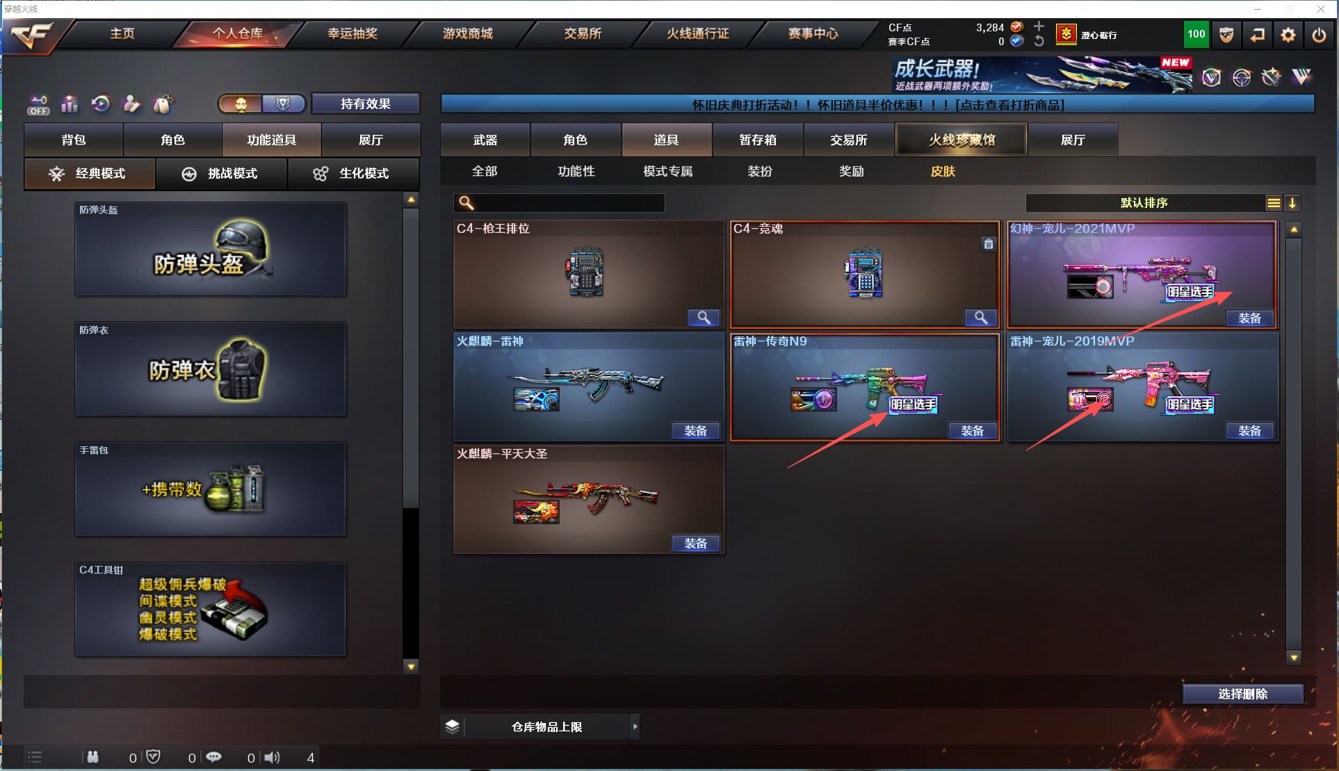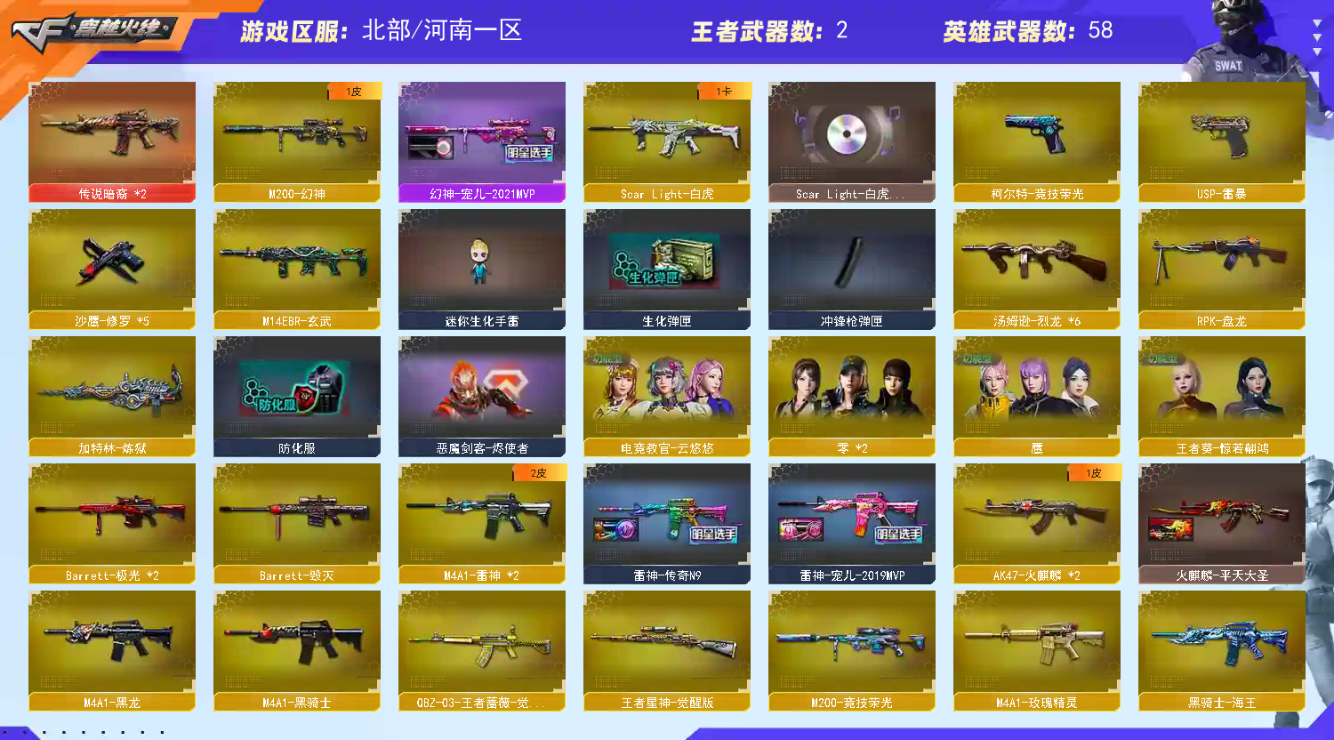 【传说暗裔+传说暗裔序列5432】【m200-幻神+幻神宠儿】【m200-竞技荣光套】【觉醒王者星神】【scar白虎+白虎音效卡】【觉醒qbz王者蔷薇】【雷神+雷神宠儿+雷神传奇n9】【盘龙+6烈龙】【副武器:雷暴/柯尔特-竞技荣光/3沙鹰/2天神】【2屠龙/擎天/马来剑】【手雷包:3夜魔手雷包/竞技荣光手雷包】【角色:四防云悠悠/四防鹰/四防王者葵-翩若惊鸿/零】;