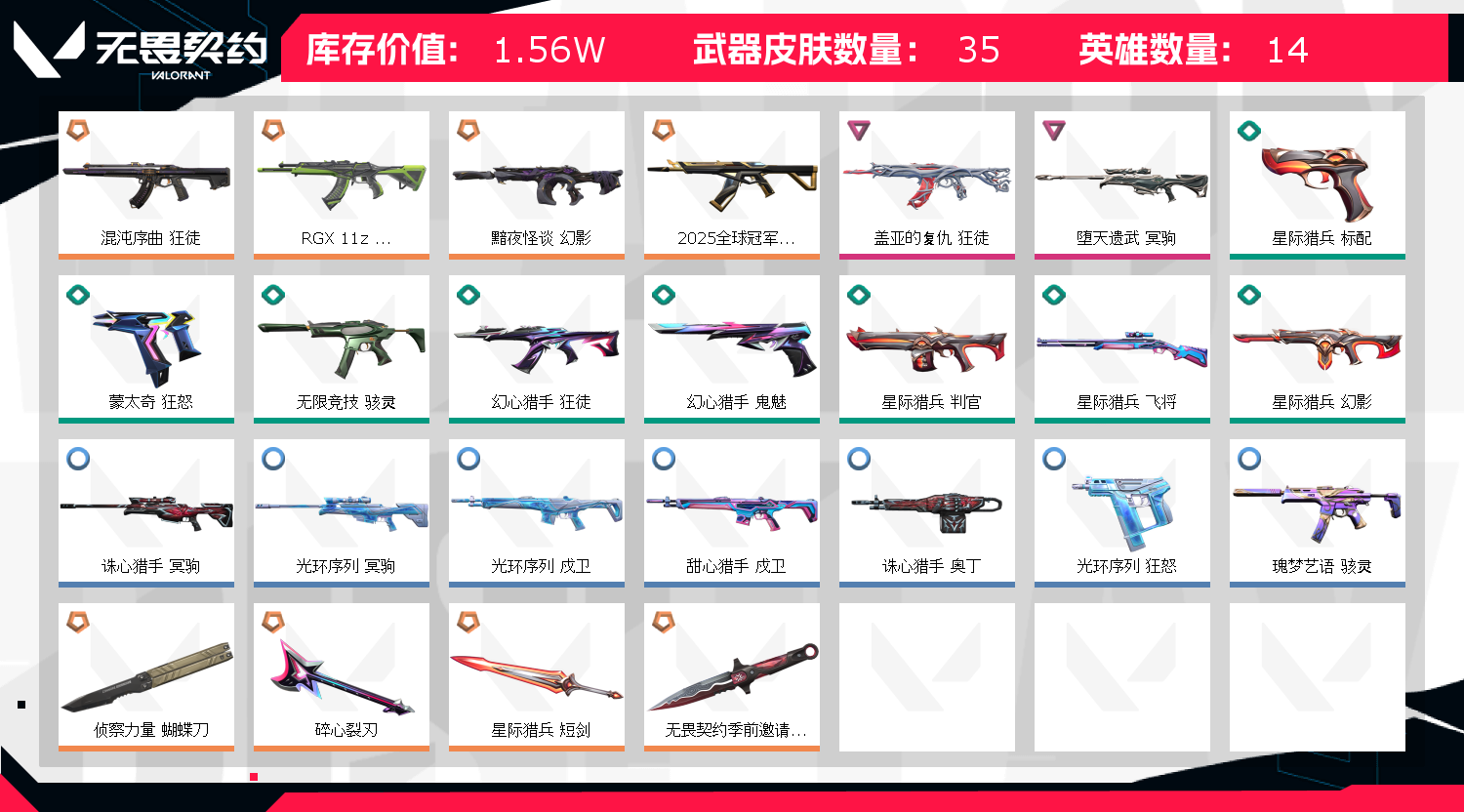 首页 > 租号大厅 > 无畏契约-wegame > wegame/wegame > 冻结请协助,会解冻❤️怜悯❤️怪谈幻影❤️25冠军套装❤️RGX狂徒❤️混沌狂徒❤️盖亚狂徒❤️碎心