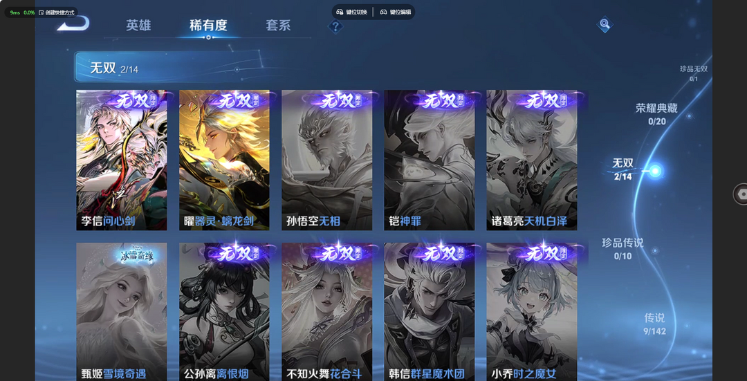 v10、537皮6水4无双、安琪拉-颠倒童话·魔镜、朵莉亚-神骥、遇见神鼓、齐天大圣、白虎志、韩信荣耀典藏、73传说、时之魔女、瑶无双、青丘、九尾、神器明辉仪