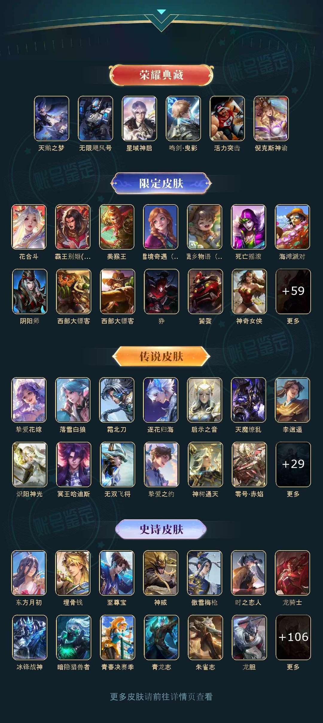 v10、537皮6水4无双、安琪拉-颠倒童话·魔镜、朵莉亚-神骥、遇见神鼓、齐天大圣、白虎志、韩信荣耀典藏、73传说、时之魔女、瑶无双、青丘、九尾、神器明辉仪