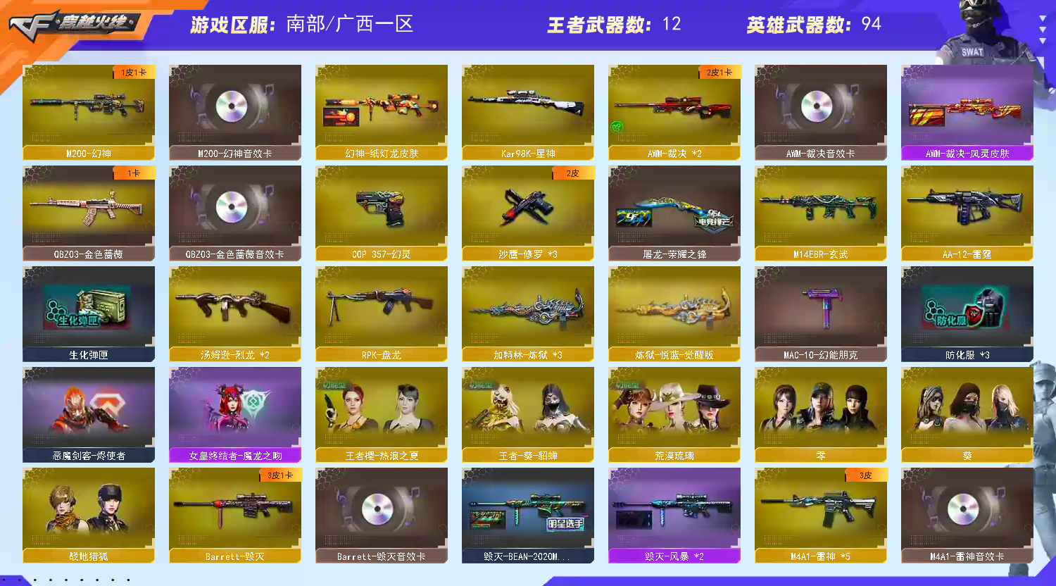 首页 > 租号大厅 > 穿越火线 > 南部/广西一区 > 可打字❤M200幻神音效卡+灯笼❤裁决音效卡+凤灵❤98K星神❤COP幻灵❤白虎电玩❤金色蔷薇音效卡