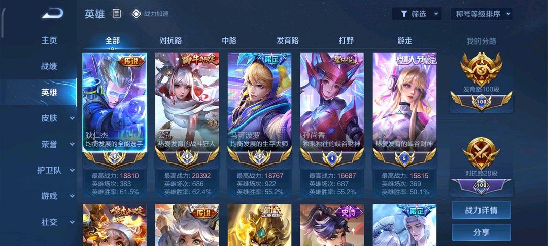 国服百段发育路❤️400皮肤。历史3大国标2万分公孙离✨马克✨狄仁杰❤️2小国服孙尚香✨虞姬