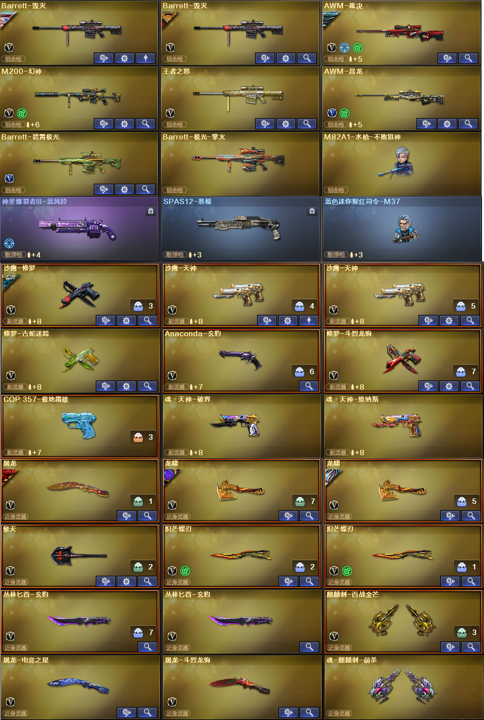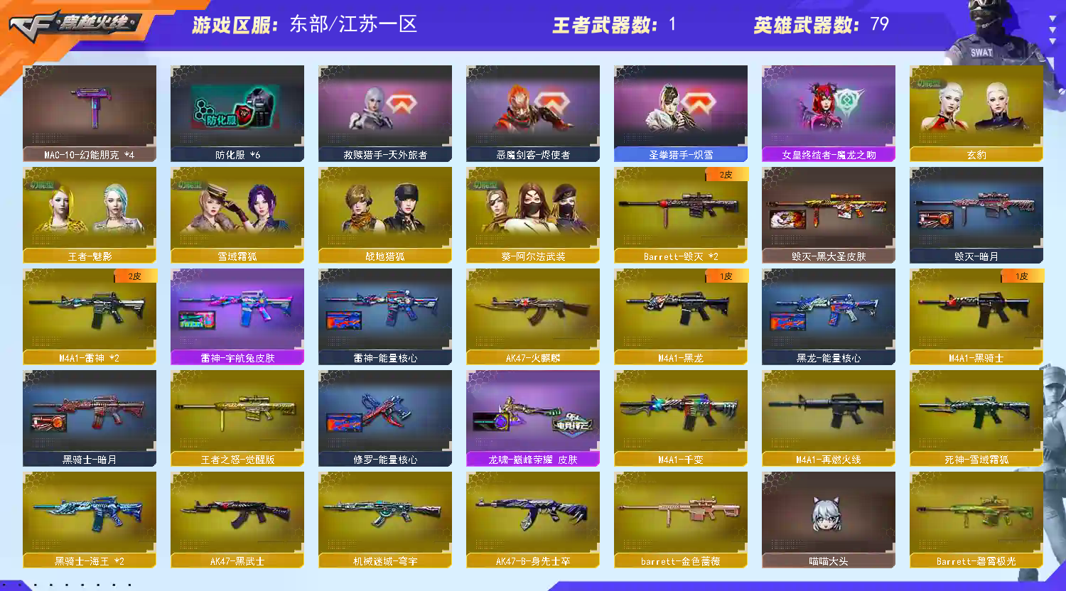 四防神威莲华✅2炽芒+宇宙万象禅狮5盘龙炼狱+枪娘5烈龙✅幻神电流骇客+幻影+满级八面✅裁决5件套 稀有武器:M200幻神、G360幻影、八面凌龙、炽芒蝶刃X2、烈龙X5+斯泰尔蝴蝶、炼狱奇幻宇宙万象+炼狱金翼禅狮+5盘龙+炼狱+炼狱百战金芒、QBZ金色蔷薇、千变、火麒麟、黑龙、雷神X2、黑骑士、黑武士、金色蔷薇古蛇迷踪、死神雪域霜狐、朱雀电竞之星、机械迷城穹宇、天罚斗烈龙驹、烈火、黑骑士海王X2、毁灭X2、裁决、修罗X1、天神X2、修罗古蛇迷踪、Anaconda玄豹、修罗斗烈龙驹、屠龙、擎天、龙啸X2、丛林匕首玄豹X2、麒麟刺百战金芒、屠龙电竞之星、屠龙斗烈龙驹、赤狱骑士、苍鸣雷神、竞魂无影、竞魂超新星、昌龙、碧霄极光、炫金雷神、 稀有角色:神威莲华(四防:生化背包变更+移动速度提升+生化觉醒狂暴化+佣兵觉醒无需换弹)、玄豹(四防:减少闪光效果+免疫队友炸弹伤害+减少掉落伤害+副武器自动装弹)、隼(四防:生化背包变更+移动速度提升+生化觉醒狂暴化+佣兵觉醒无需换弹)、王者魅影(四防)、不败狙神、零纪元、太空指挥官、战地猎狐、斗烈龙驹、幻面灵狐、葵阿尔法武装、蛇影宗、雪域霜狐、暗夜X、芳心审判者 音效卡:裁决音效卡、死神雪域霜狐怀旧音效卡、昌龙怀旧音效卡、麒麟刺百战金芒盛典舞曲音效卡、炼狱百战金芒庆典舞曲音效卡、碧霄极光音效卡、屠龙电竞之星竞星悦栋音效卡、朱雀电竞之星竞星悦栋音效卡、屠龙斗烈龙驹斗烈音效卡、天罚斗烈龙驹斗烈音效卡 稀有皮肤:幻神电流骇客皮肤、裁决运输船皮肤/凤灵皮肤/胜者为王皮肤/星际旅行皮肤、QBZ金色蔷薇电竞之星皮肤、龙啸蛇姬皮肤/巅峰荣耀皮肤/青青莓果皮肤、雷神源计划2.0专属皮肤/能量核心皮肤/诺拉皮肤/宇航兔皮肤/神秘按键皮肤、屠龙惊鸿皮肤/彼岸花皮肤、炼狱迷彩皮肤、修罗能量核心皮肤/CFSTAR皮肤、毁灭暗月皮肤/黑大圣皮肤/青帝皮肤/英雄计划皮肤/虹光风暴皮肤、黑骑士暗月皮肤、黑龙暗月皮肤/能量核心皮肤 投掷套装:竞技荣光套、玄豹套X5、高爆手雷/烟雾弹古蛇迷踪、手雷远古神话、凤凰之息 小人枪武器特殊武器:HK朱雀蛇影宗、火麒麟零纪元X3、水枪不败狙神、炼狱奇幻宇宙象、炼狱金翼禅狮、炼狱小刚、迷你宝贝、迷你钢铁终结者、冰龙粉碎者、激光毁灭者白马银枪、末日审判者、双面神竞魂、青曜、毒刺金线、异变清道夫、异变清道夫蛇影双骄、USP竞魂、加特林机械猎手、斯泰尔枪娘暗刃、蓝色迷你猩红司令M37、MAC龙宝、MAC千针棘鲨、猫猫手套;炽芒蝶刃,隼,RPK-盘龙,QBZ03-金色蔷薇,G36C-幻影,M200-幻神,