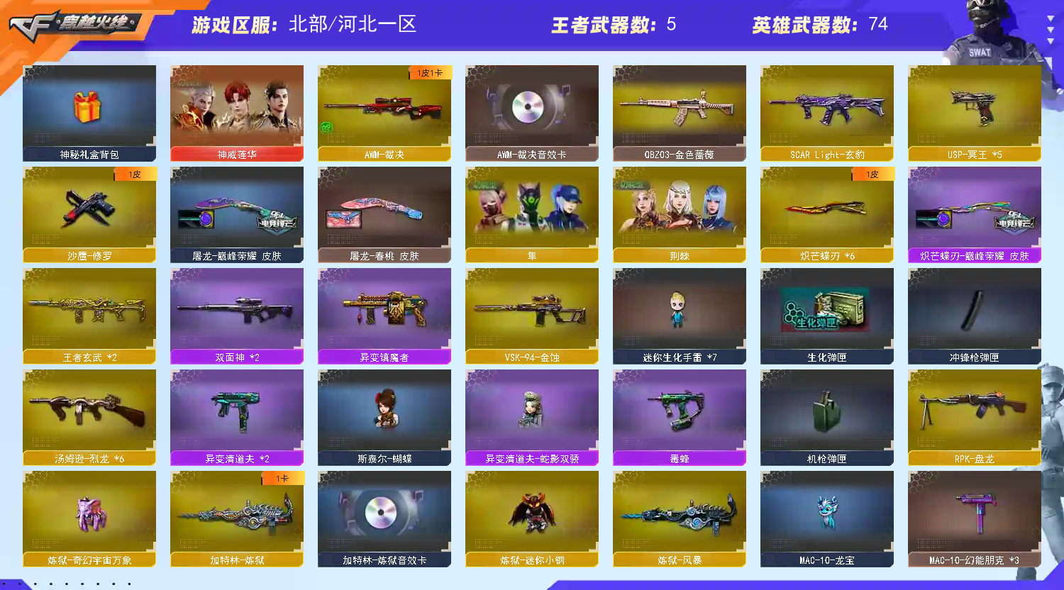 账号已备案,生化全装,神威,六烈六盘,蝴蝶刀✖️6,玄武✖️2,炼狱泡泡象,斯太尔蝴蝶,裁决三件套。