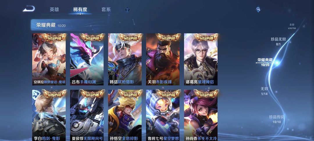 v10、537皮6水4无双、安琪拉-颠倒童话·魔镜、朵莉亚-神骥、遇见神鼓、齐天大圣、白虎志、韩信荣耀典藏、73传说、时之魔女、瑶无双、青丘、九尾、神器明辉仪
