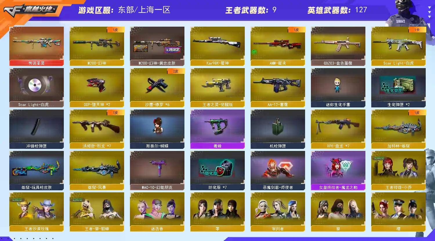 适用各种模式的全装账号 该账号已在苏州公安报备;王者沙漠玫瑰,RPK-盘龙,QBZ03-金色蔷薇,M200-幻神,Scar Light-白虎,Kar98K-星神,