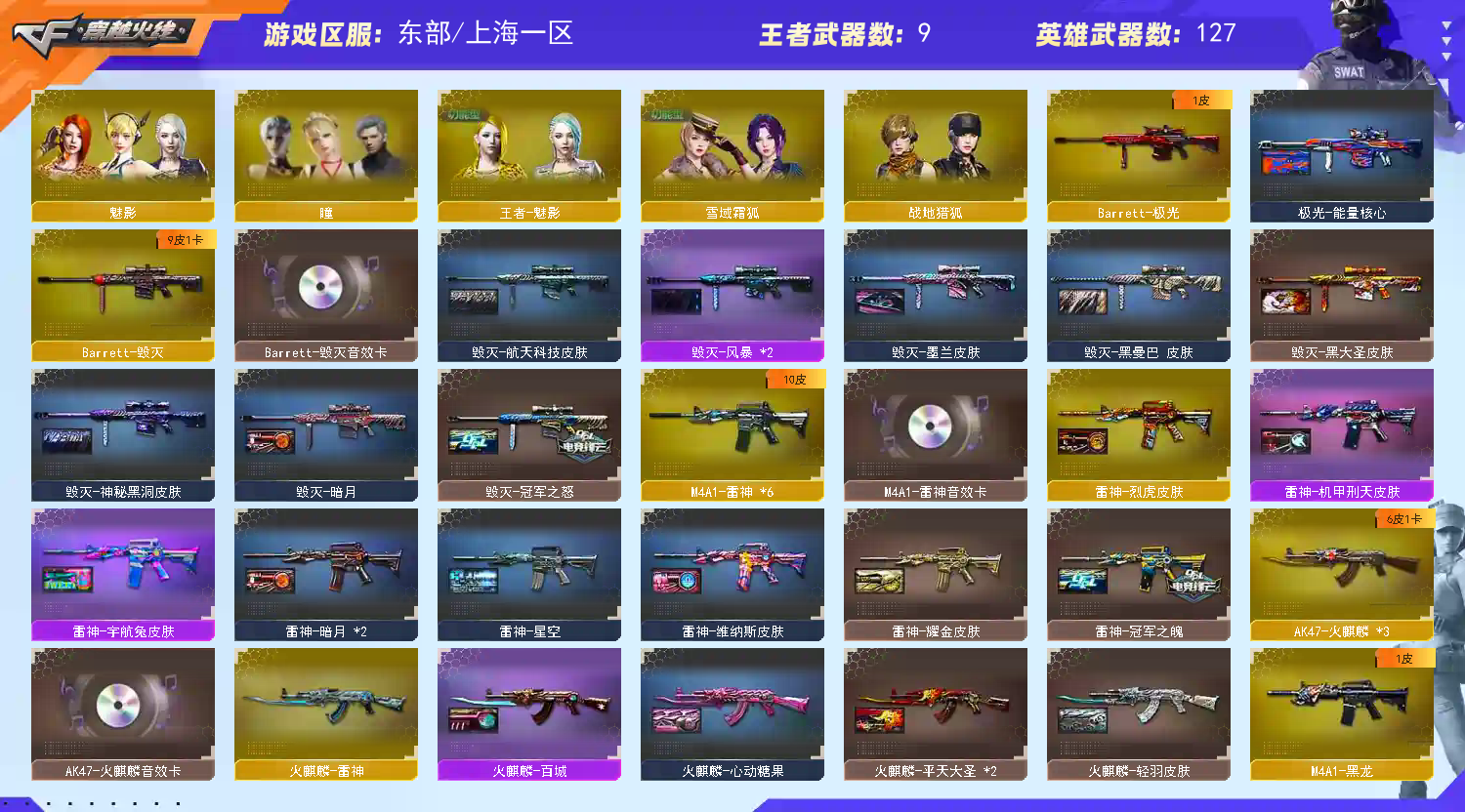 首页 > 租号大厅 > 穿越火线 > 东部/上海一区 > 爆破生化挑战号|幻神星神|六烈六盘六修罗炼狱蝴蝶斯泰尔|双堕天神除主武器|王者/四防角色|6音效卡