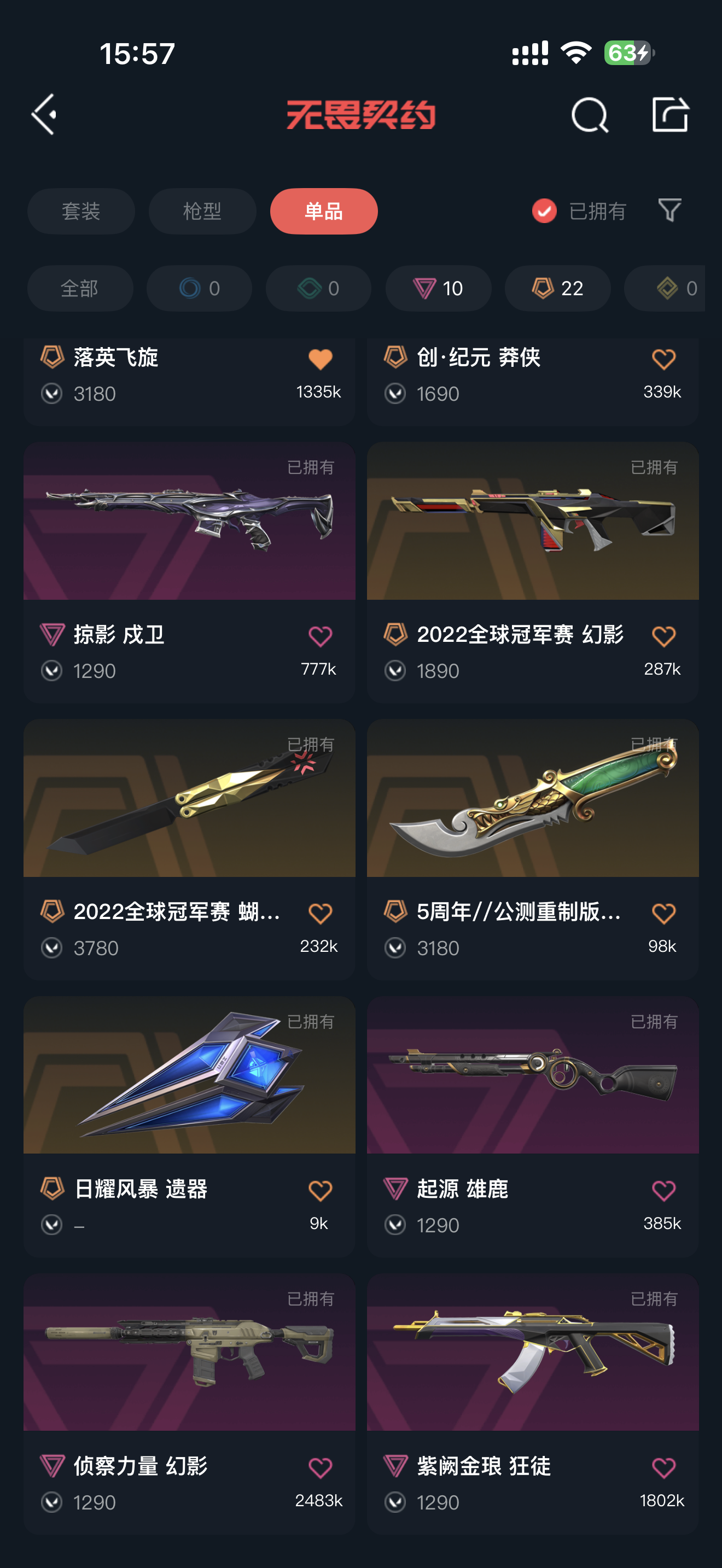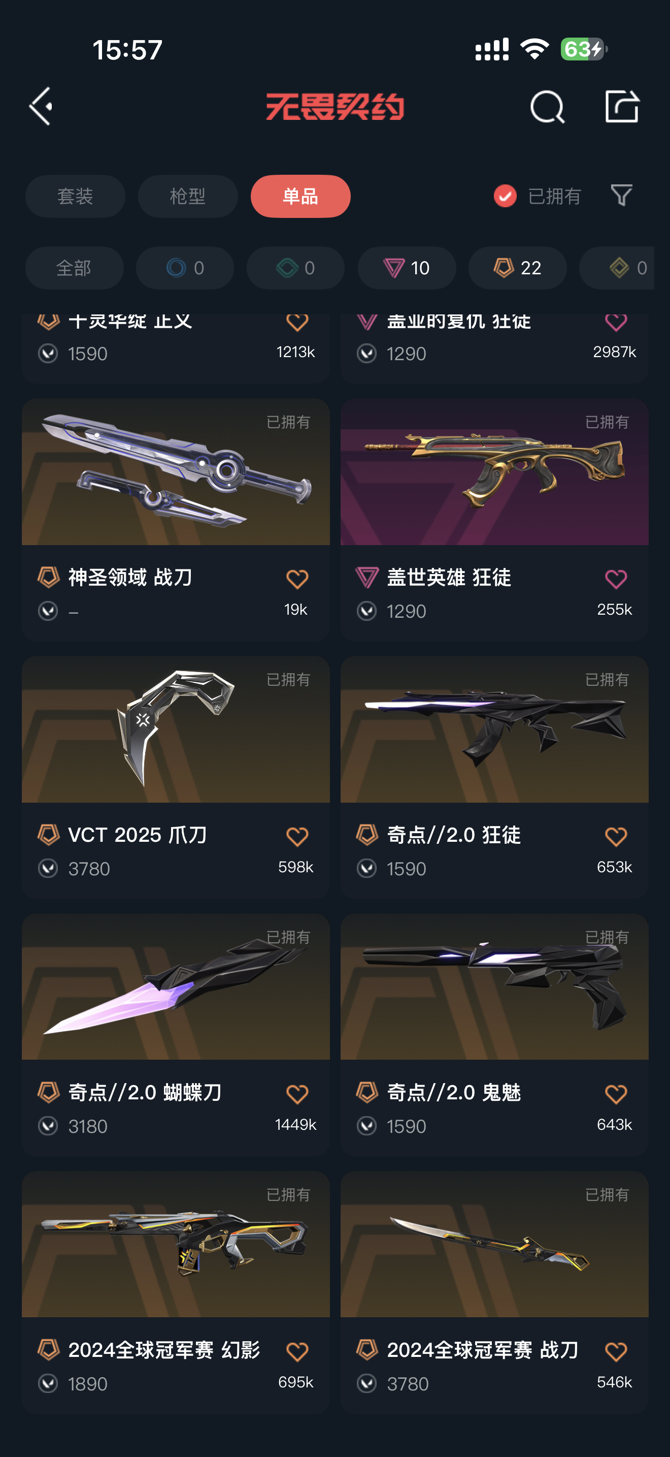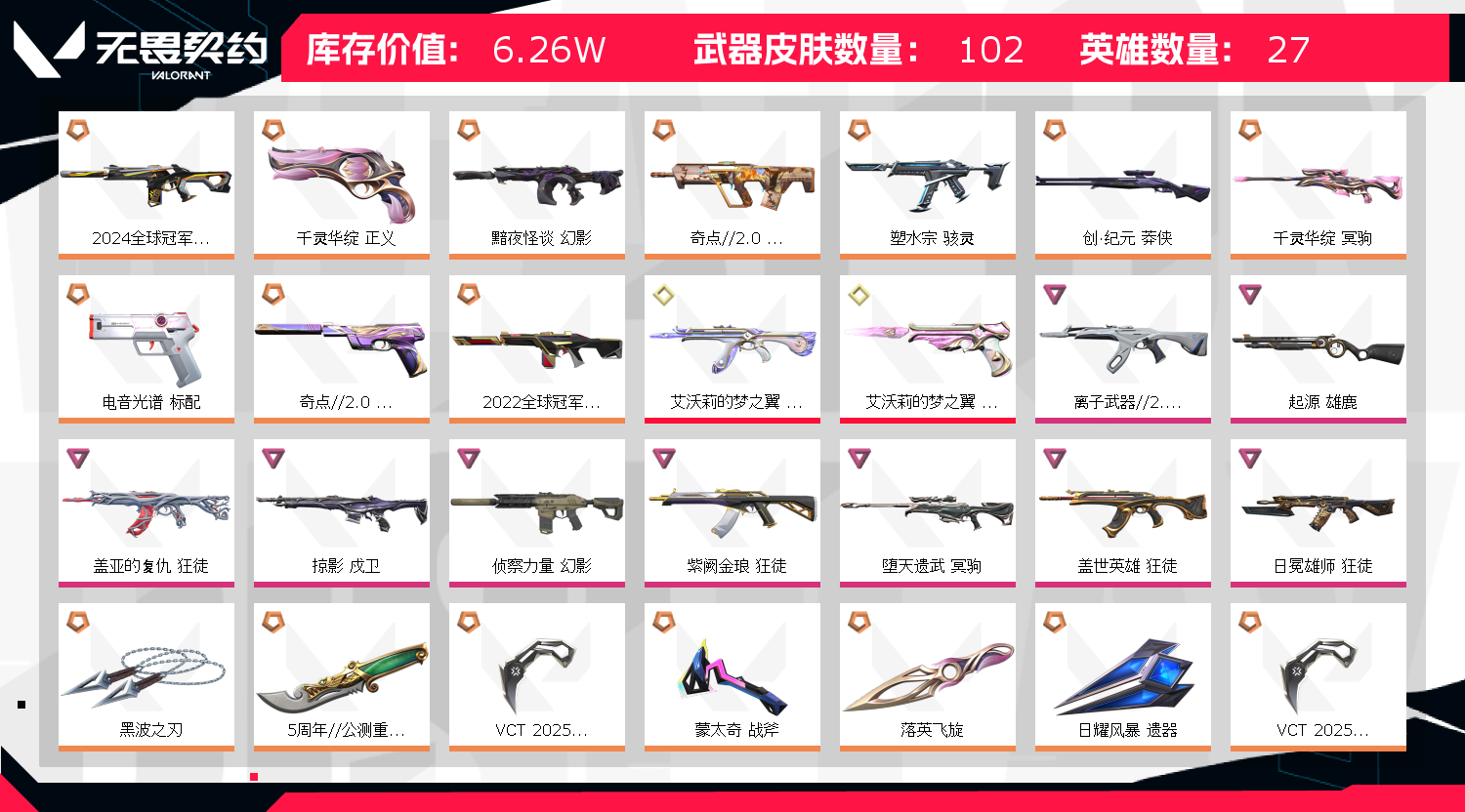 2025vct爪刀 黑波之刃 艾沃莉魔法棒 2022冠军赛蝴蝶刀 2024冠军赛战刀 奇点蝴蝶刀 落英飞旋 5周年苍龙之刃 2022冠军幻影 2024冠军幻影 侦察力量幻影 黯夜怪谈幻影 艾沃莉的梦之翼狂徒 紫阙金琅狂徒 奇点2.0狂徒 盖亚的复仇狂徒 离子武器狂徒 塑水宗骇灵 千灵华绽冥驹 堕天遗武冥驹;黑波之刃,5周年//公测重制版 苍龙之刃,VCT 2025 爪刀,起源 雄鹿,盖亚的复仇 狂徒,掠影 戍卫,侦察力量 幻影,
