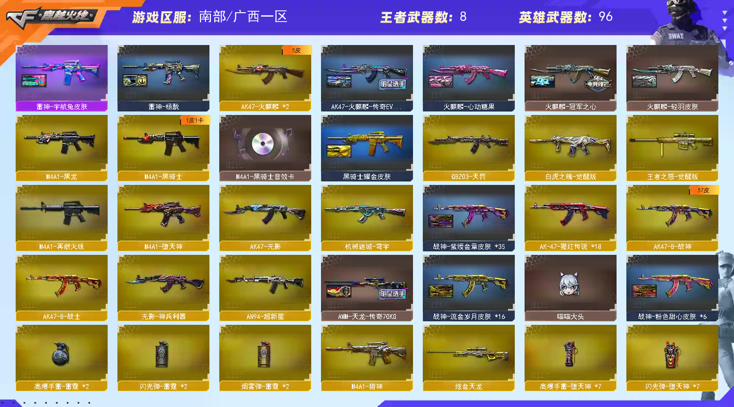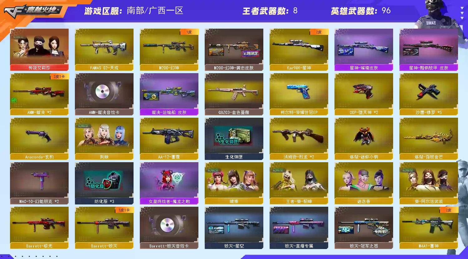 1242 南部 广西一区 101🆚 VIP4 【可排位】【南部一传说/裁决三件套】【传说艾丽莎】【m200幻神+黄忠皮肤】【98k星神+暗钢战甲皮肤+星神璀璨皮肤】【裁决+运输船皮肤+裁决音效卡】【觉醒白虎之魄】【FAMAS G2-天戎】【cop堕天神x2/柯尔特荣耀世冠ep】【炼狱-迷你小刚/巴雷特-零-水下丽影/金刚伞/加利尔ACE-零号/牛牛AK】【火麒麟x2/黑龙/雷神/黑骑士/无影/超新星/m4堕天神/qbz天罚/无影神兵利器/机械迷城穹宇/qbz金色蔷薇/m4猎神/觉醒王者之魄/AK猩红传说x18/AK战士/AK战神/毁灭/极光/裁决x2/觉醒王者之怒/炼狱百战金芒/烈龙x2/AA12雷霆】【修罗x5/天神/cop堕天神x2/Anaconda-玄豹/柯尔特荣耀世冠ep】【麒麟刺x3/尼泊尔雷霆/麒麟刺堕天神/龙啸堕天神x3/丛林匕首-玄豹/麒麟刺百战金芒】【堕天神手雷一套】【传说艾丽莎/晴雅/荆棘/迷迭香/王者葵-貂蝉/葵-阿尔法武装/零纪元】【0号玩家/刀锋京韵/电竞少女/嘉年华灵狐/兰妹妹/木兰/曙光/王者-零-传说之路/蔚蓝/新娜塔莎/喵喵/妲己】【剑齿虎-x/救世主-x/曼陀罗-x/潘多拉-x/圣诞潘多拉-x/夜玫瑰-n】【烟雾保护头/闪光护目镜永久】【BS战队炫彩背包/百战金芒炫彩背包/超级背包/炫彩背包】【裁决音效卡】【毁灭音效卡】【天罚音效卡】【黑骑士音效卡】【炼狱百战金芒音效卡】【星神暗钢战甲皮肤/雷神宇航兔皮肤/雷神源计划2.0专属皮肤/炼狱电子连击/裁决运输船皮肤/星神璀璨皮肤/火麒麟传奇even皮肤/毁灭虹光风暴皮肤/毁灭百城浙江皮肤/雷神杨戬皮肤/毁灭星空皮肤/火麒麟心动糖果皮肤/毁灭直播专属皮肤/毁灭冠军之怒皮肤/火麒麟轻羽皮肤/天龙传奇白鲨皮肤/雷神白鲨CFpls14冠军皮肤/幻神黄忠皮肤/火麒麟冠军之心皮肤/天龙传奇70kg皮肤/火麒麟百城23冠军皮肤】【AC/手雷包/c4钳永久】;晴雅,传说艾莉莎,QBZ03-金色蔷薇,M200-幻神,Kar98K-星神,