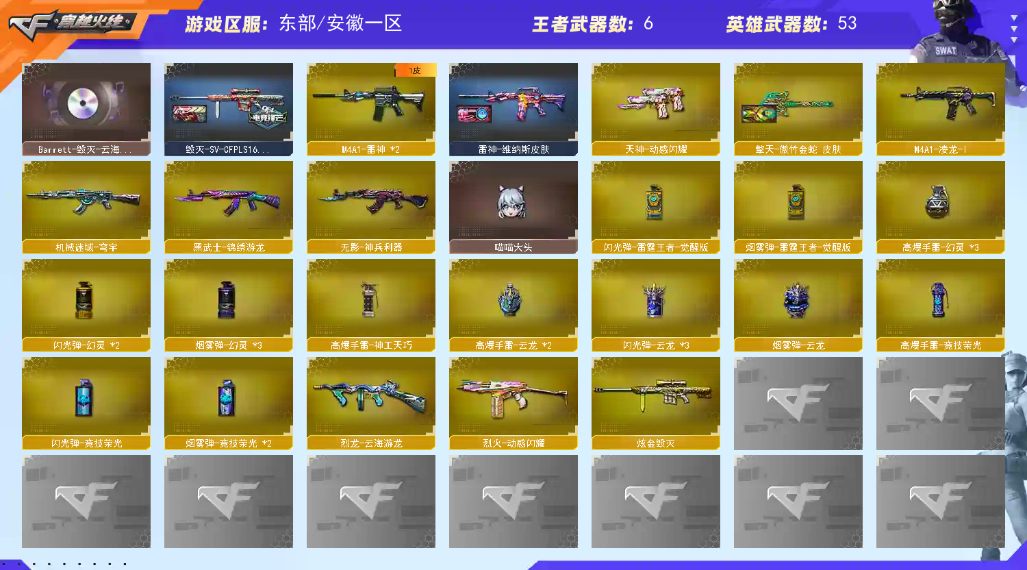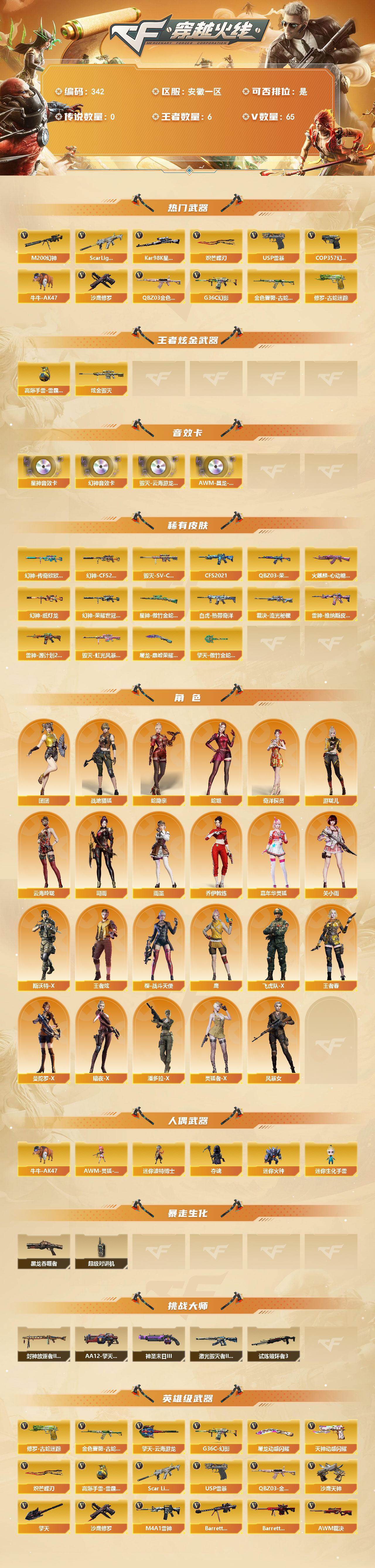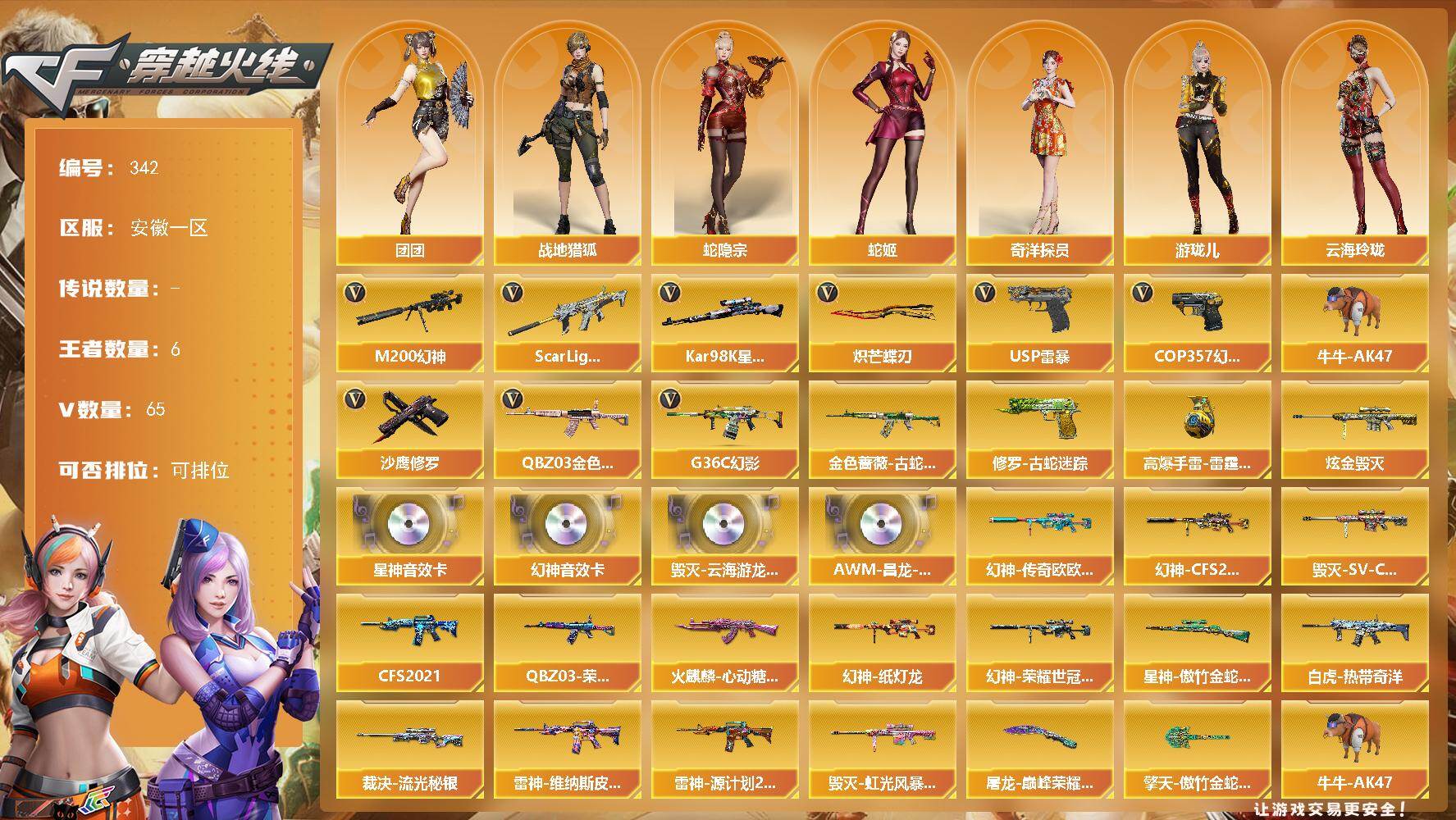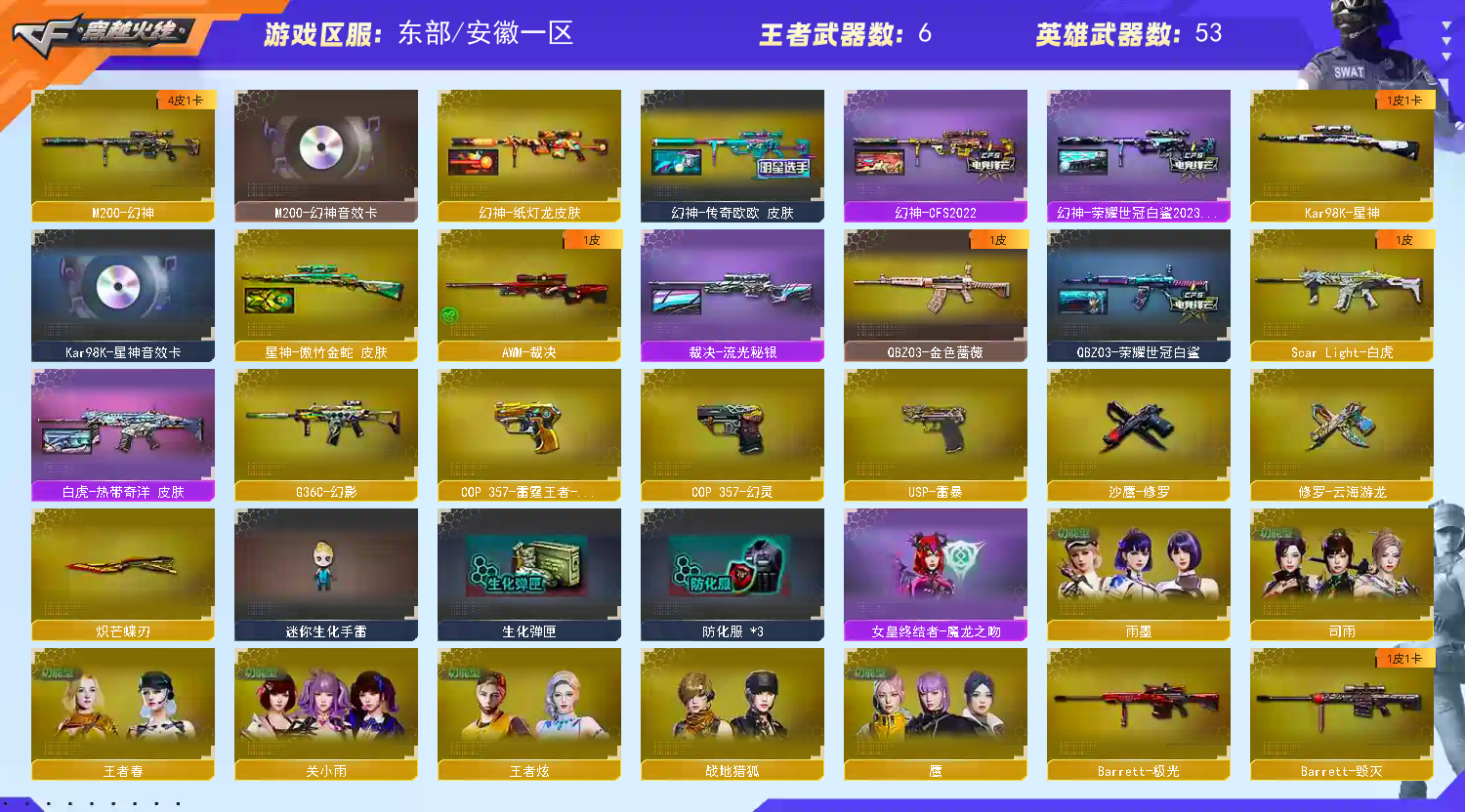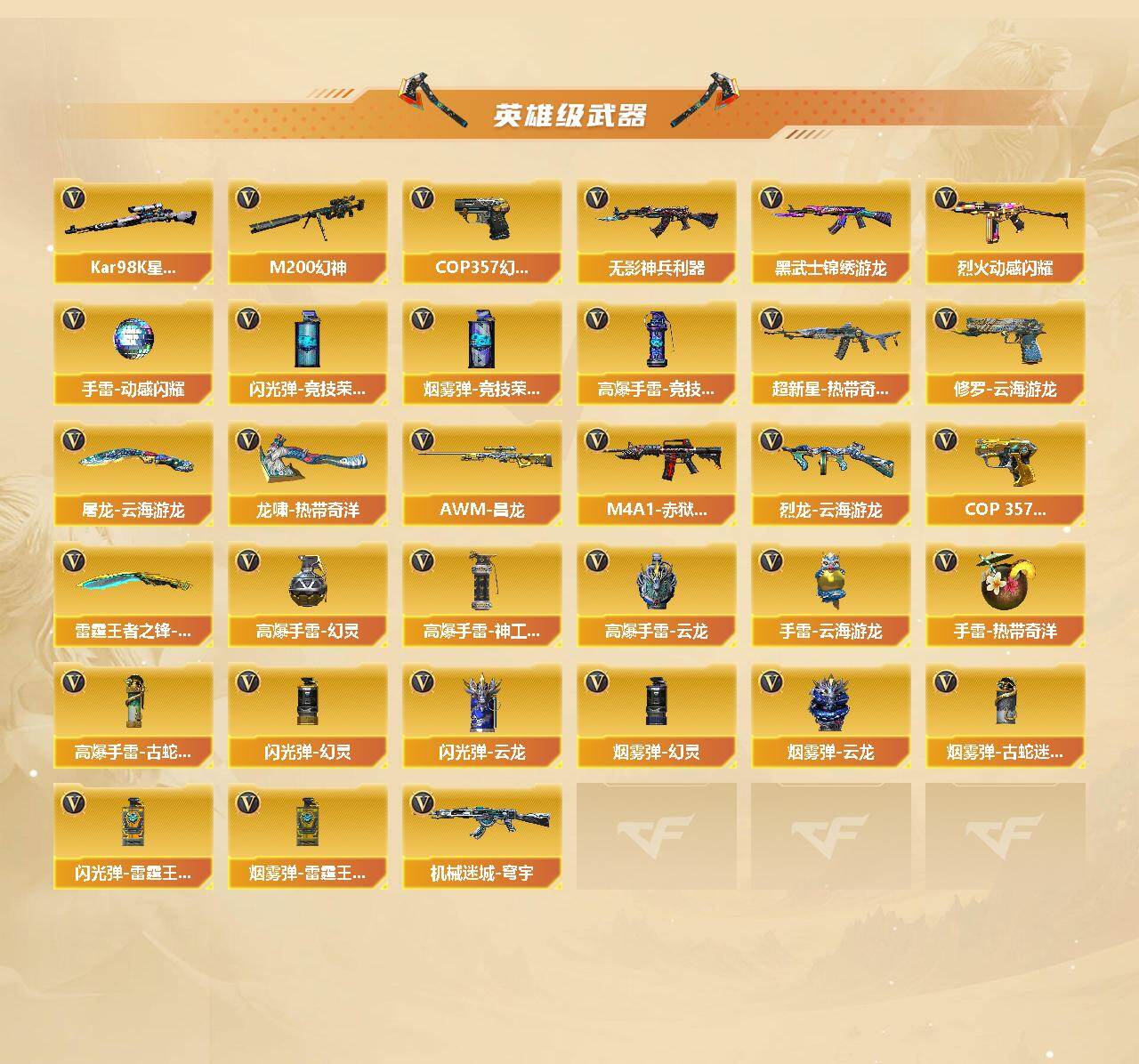 【热门武器】:G36C-幻影,QBZ03-金色蔷薇,Scar Light-白虎,M200-幻神,金色蔷薇-古蛇迷踪,修罗-古蛇迷踪,Kar98K-星神,牛牛-AK47,USP-雷暴,COP 357-幻灵,沙鹰-修罗,炽芒蝶刃 【王者炫金武器】:高爆手雷-雷霆王者*2,炫金毁灭 【音效卡】:Kar98K-星神音效卡,M200-幻神音效卡,Barrett-毁灭-云海游龙音效卡,AWM-昌龙-怀旧音效卡*5 【皮肤】:幻神-CFS2022,幻神-纸灯龙皮肤,幻神-荣耀世冠白鲨2023 皮肤,幻神-传奇欧欧 皮肤,星神-傲竹金蛇 皮肤,裁决-流光秘银,白虎-热带奇洋 皮肤,QBZ03-荣耀世冠白鲨,雷神-维纳斯皮肤,雷神-源计划2.0专属 皮肤,火麒麟-心动糖果,毁灭-SV-CFPLS16冠军,毁灭-虹光风暴 皮肤,黑骑士-CFS2021,屠龙-巅峰荣耀 皮肤,擎天-傲竹金蛇 皮肤 【角色】:鹰,关小雨,雨墨,司雨,战地猎狐,王者春,王者炫,蛇隐宗,奇洋探员,乔伊教练,云海玲珑,暗夜-X,飞虎队-X,风暴女,嘉年华灵狐,灵狐者-X,曼陀罗-X,潘多拉-X,蛇姬,斯沃特-X,樱-战斗天使,游珑儿,团团 【人偶武器】:AWM-灵狐-15周年嘉年华,牛牛-AK47,迷你波特博士,夺魂*2,迷你火种*3,迷你生化手雷 【暴走生化】:黑龙吞噬者,超级对讲机 【挑战大师】:激光毁灭者III-白马银枪,试炼破坏者III,神圣爆裂者-末日III,封神放逐者III,AA12-擎天柱III 【英雄级武器】:M4A1-雷神*2,Scar Light-白虎,QBZ03-金色蔷薇,无影-神兵利器,黑武士-锦绣游龙,G36C-幻影,超新星-热带奇洋,金色蔷薇-古蛇迷踪,烈火-动感闪耀,机械迷城-穹宇,Barrett-毁灭,Barrett-极光,AWM-裁决,M200-幻神,Kar98K-星神,烈龙-云海游龙,沙鹰-修罗,沙鹰-天神,USP-雷暴,COP 357-雷霆王者-觉醒版,COP 357-幻灵,天神-动感闪耀,修罗-云海游龙,修罗-古蛇迷踪,擎天,炽芒蝶刃,屠龙-动感闪耀,擎天-云海游龙,龙啸-热带奇洋,屠龙-云海游龙,雷霆王者之锋-觉醒版,高爆手雷-幻灵*3,高爆手雷-竞技荣光,高爆手雷-神工天巧,手雷-动感闪耀,高爆手雷-云龙*2,手雷-云海游龙,手雷-热带奇洋,高爆手雷-古蛇迷踪,高爆手雷-雷霆王者-觉醒版*2,闪光弹-幻灵*2,闪光弹-竞技荣光,闪光弹-云龙*3,闪光弹-雷霆王者-觉醒版,烟雾弹-幻灵*3,烟雾弹-竞技荣光*2,烟雾弹-云龙,烟雾弹-古蛇迷踪,烟雾弹-雷霆王者-觉醒版,M4A1-赤狱骑士,AWM-昌龙 【其他武器】:御·黑龙-龙太子,源·雷神,魂·M4A1-雷神-化蛇,魂·雷神-诺拉,魂·雷神-神秘按键,魂·雷神-维纳斯,魂·雷神-15周年嘉年华,魂·黑骑士-破浪10年,御·黑骑士·哪吒闹海,御·超新星-圣诞,源·武圣*2,源·机械迷城,魂·龙血-锋芒破茧,魂·HK417-朱雀-凤灵,源·HK417-朱雀,源-金色蔷薇,魂·QBZ03-金色蔷薇-古蛇迷踪,魂·QBZ03-金色蔷薇-蛇姬,魂·9A91·烈火-电子连击,源·玫瑰精灵,魂·英雄-湾区光枢,AWM-裁决-百城联赛天津,魂·裁决-凤灵,魂·裁决-羽掣,魂·毁灭-神秘黑洞*2,御·毁灭-黑大圣,魂·Barrett-朱雀- 新春神龙,源·Barrett-朱雀,魂·炼狱-电子连击,魂·炼狱-月,加特林-炼狱-掌火*2,魂·修罗-15周年嘉年华,魂·天神-阿努比斯,源·武圣glock*2,魂·屠龙-春桃,魂·擎天-破浪10年,魂·麒麟刺-神秘黑洞,灵·麒麟刺-穹宇 【道具】:BS战队炫彩背包,EP战队炫彩背包,EDG炫彩背包,WE炫彩背包,云海游龙炫彩背包,亚洲杯纪念炫彩背包,冰冰鹅背包,古蛇迷踪炫彩背包,奇洋探员-海龟背包,次元之矛-黄金背包,热带奇洋炫彩背包,臻选金狐背包,裂空之翼背包-金色,超级背包,女皇终结者-魔龙之吻,救世主-黑桃战神,黄金生化钩,绿色巨人,灵魂忍者*2,变异宝贝,迷雾幽灵,疯狂宝贝*3,生化弹匣,夺命之镰,防化服*3,金色流光-枪王排位*2,星辰流光-枪王排位,流光-鎏金之域,流光-再燃火线,枪王排位28赛季金色流光,枪王排位29赛季金色流光,古蛇迷踪特效,蛇隐宗表情,热带奇洋表情,动感闪耀表情,云海游龙表情,C4-再燃火线,防弹头盔*5,防弹衣*5,C4工具钳*5,手雷包*5 【特殊枪械】:1白虎;USP-雷暴,炽芒蝶刃,QBZ03-金色蔷薇,G36C-幻影,M200-幻神,Scar Light-白虎,Kar98K-星神,
