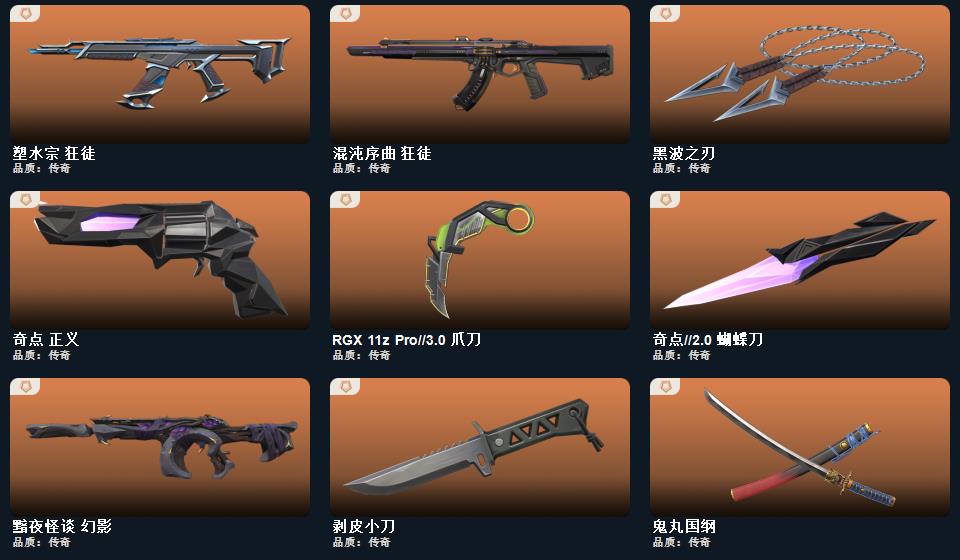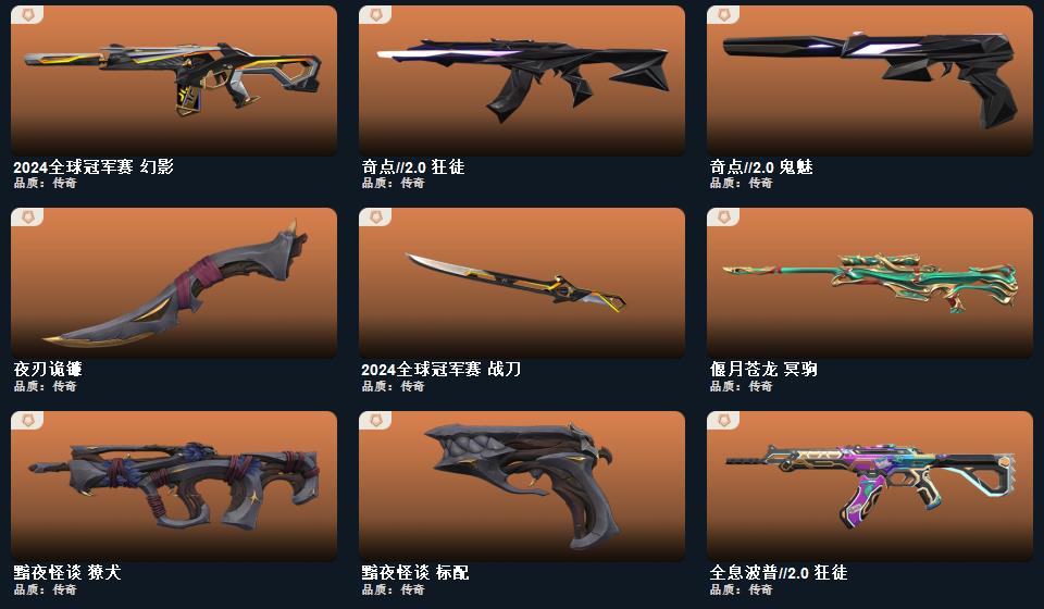 2024全球冠军赛套装,奇点//2.0套装,黯夜怪谈套装,荒土机兵 热能刀,鬼丸国纲,黑波之刃,超限闪存 匕首,奇点//2.0 蝴蝶刀,夜刃诡镰,剥皮小刀,幻心猎手 鬼魅,荒土机兵 骇灵,纳米打击 幻影,荒土机兵 冥驹