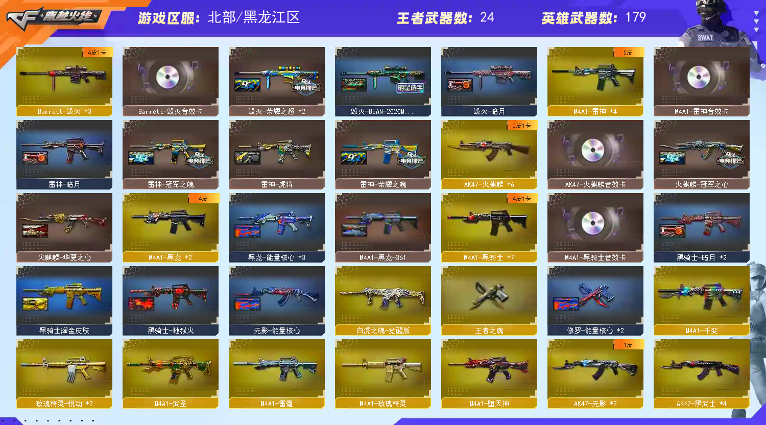 【M200-幻神+幻神-黄忠】【传说光耀】【QBZ03-金色蔷薇】【生化 6盘龙 4炼狱 6烈龙 蝴蝶 死亡之眼】【裁决】 【Barrett-毁灭+音效卡+毁灭-荣耀之怒】【极光】【白虎之魄】【雷霆套】【堕天神套】【AK47-火麒麟+音效卡+火麒麟-冠军之心】【麒麟】【黑龙】【M4A1-雷神+音效卡+雷神-荣耀之魄+雷神-冠军之魄】【6黑骑士+音效卡】【王者之心 王者之魄 王者之势】【无影 死神 黑武士 天启 超新星 机械迷城 hk417-朱雀 玫瑰精灵】【18手枪 修罗*7 天神*6 cop雷霆 usp雷暴 cop堕天神*2】【18近战 屠龙*5 龙啸 擎天*2 麒麟刺*3 斩神刀雷暴 王者之啸 王者之击 】【手雷 雷霆雷 雷暴雷 堕天神 】【四防 王者魅影 王者潘多拉】【AK47-火麒麟音效卡 Barrett-毁灭音效卡 黑骑士音效卡】;USP-雷暴,RPK-盘龙,QBZ03-金色蔷薇,M200-幻神,