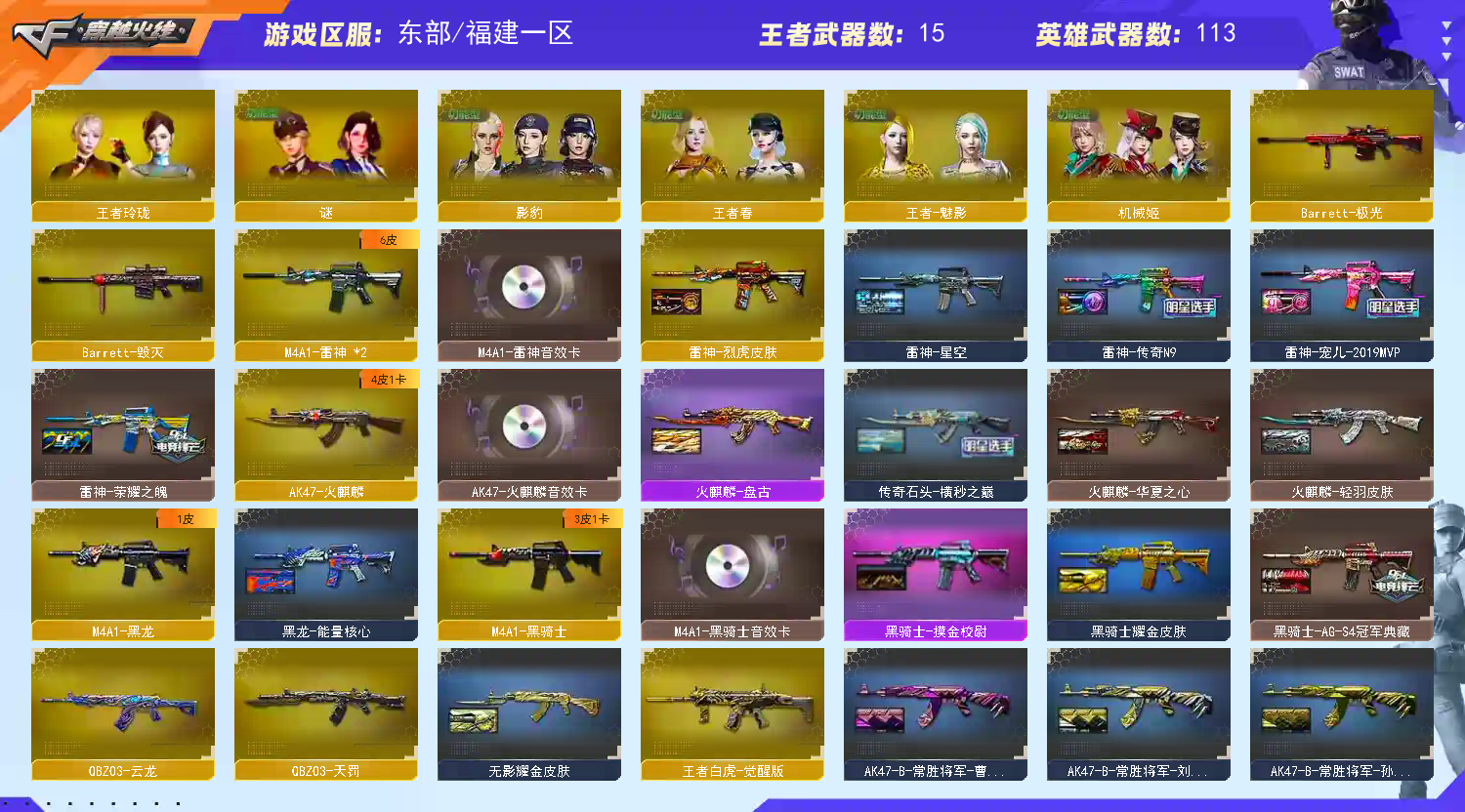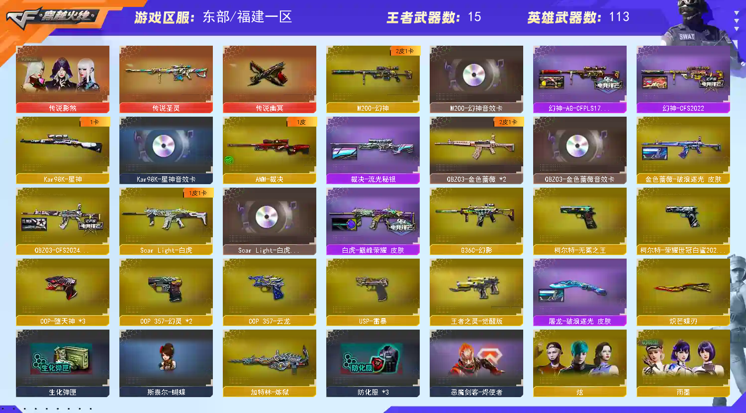 幻神三件套】【传说影煞】【M200-幻神+音效卡+幻神-AG-CFPLS17+幻神cfs2022】【Kar98K-星神+音效卡】【王者幻神】【王者星霆】【传说圣灵】【G36C-幻影】【王者白虎】【ScarLight-白虎+音效卡+巅峰荣耀】【QBZ03-金色蔷薇+音效卡+破浪逐光+cfs2024】【裁决】【Barrett-毁灭】【极光】【传说幽冥】【堕天神套】【AK47-火麒麟+音效卡+传奇石头-横秒之巅】【黑龙】【M4A1-雷神+音效卡+幻神-宠儿+雷神-荣耀之魄】【黑骑士+音效卡】【王者之心 王者之势 王者风神】【无影 天启 超新星】【11手枪 usp雷暴 cop堕天神*3 cop幻灵*2 cop云龙 柯尔特荣耀世冠白鲨2023 柯尔特无冕之王 王者之灵】【21近战 屠龙*2 擎天*3 斩神刀雷暴 幻灵之锋*2 竞技荣光*2 炽芒蝶刃蝴蝶刀 王者之锋 王者之啸】【手雷 雷暴雷 堕天神 幻灵雷 】【四防 影豹 王者春 王者魅影】【幻神音效卡 Kar98K-星神音效卡 ScarLight-白虎音效卡 qbz音效卡;USP-雷暴,柯尔特-无冕之王,柯尔特-荣耀世冠白鲨2023,传说幽冥,炽芒蝶刃,传说影煞,QBZ03-金色蔷薇,